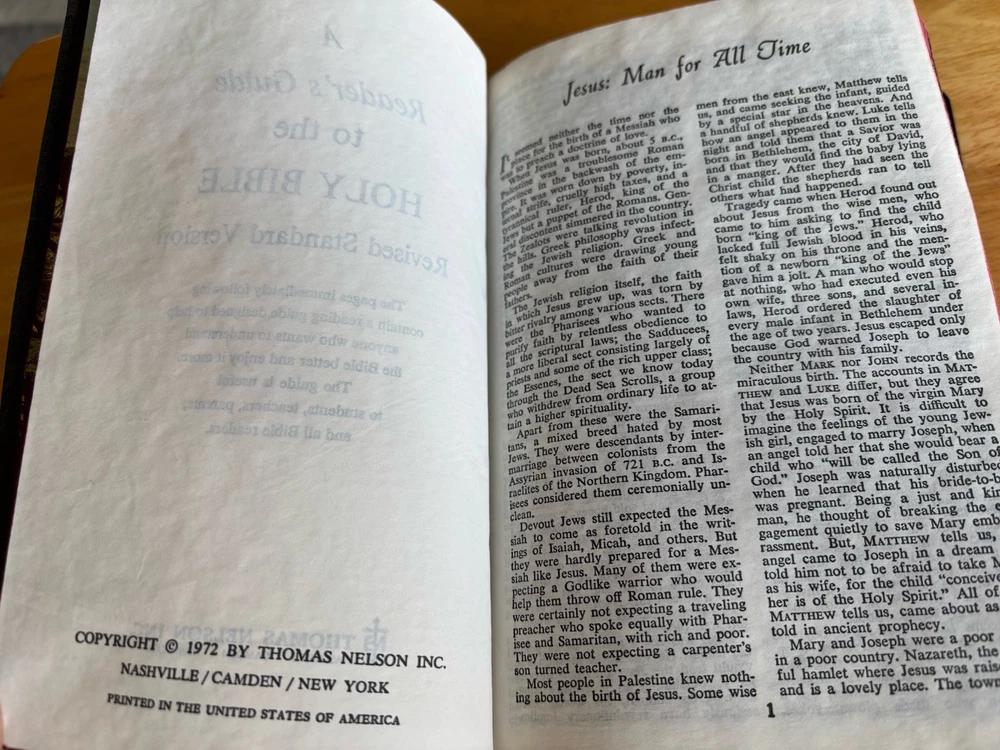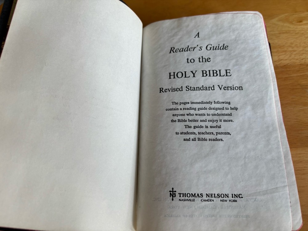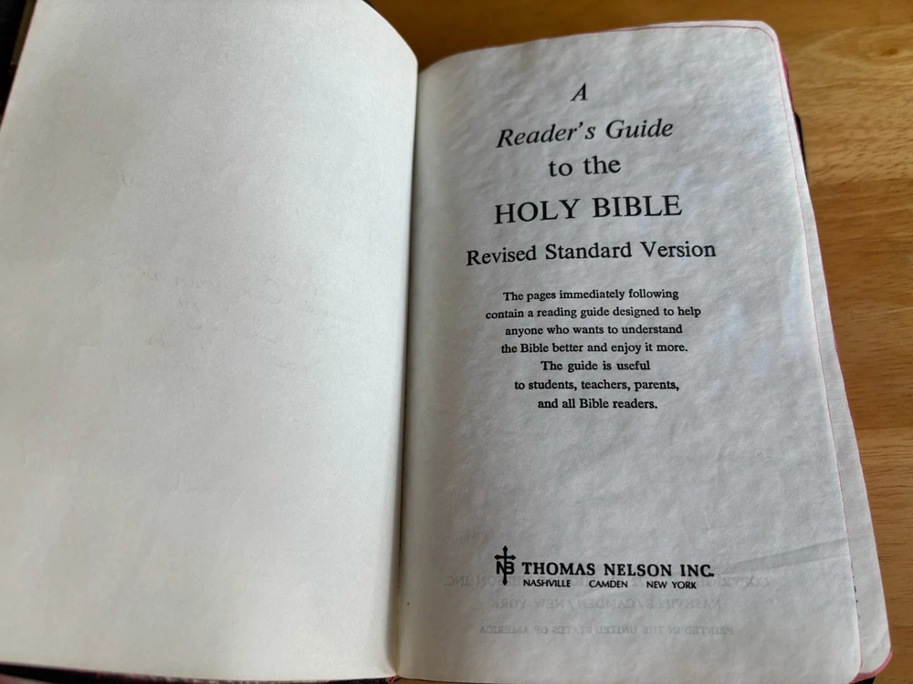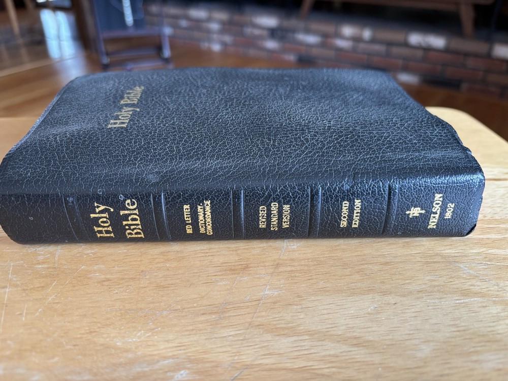 The product is a vintage leather-bound Holy Bible by Thomas Nelson, featuring a red letter edition with a dictionary and concordance. It is the Revised Standard Version, second edition from 1972. The Bible is black with colored maps and illustrations, and is inscribed. It is a nonfiction book in English, focusing on spirituality and religious topics, and was published by Thomas Nelson in the United States in the 1970s.