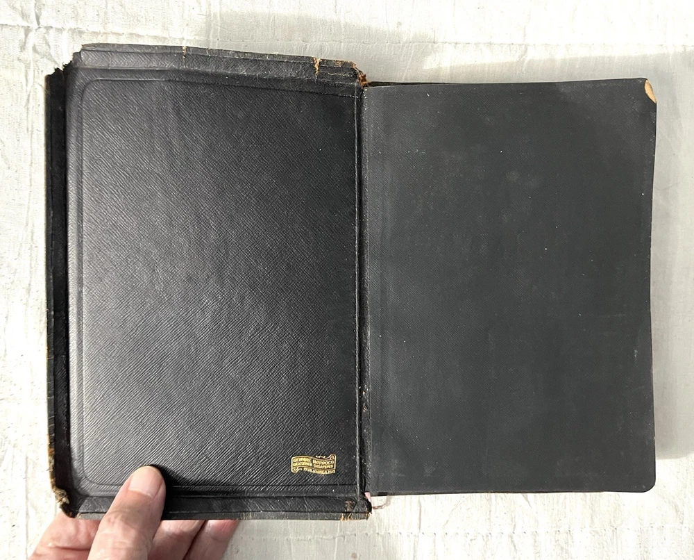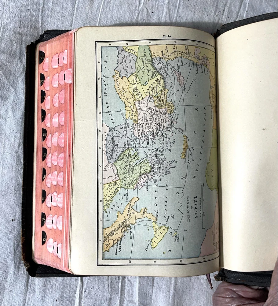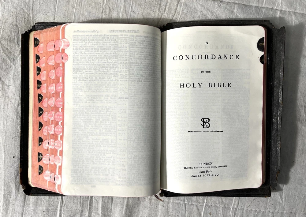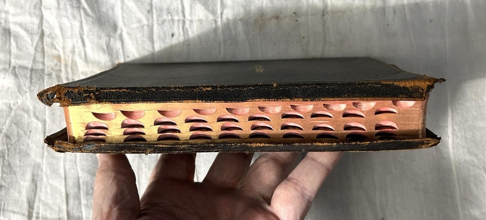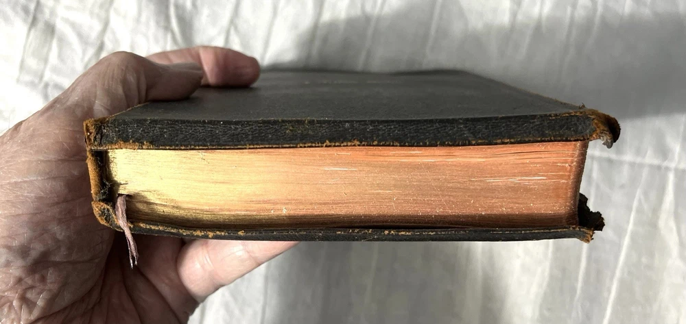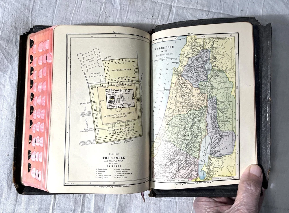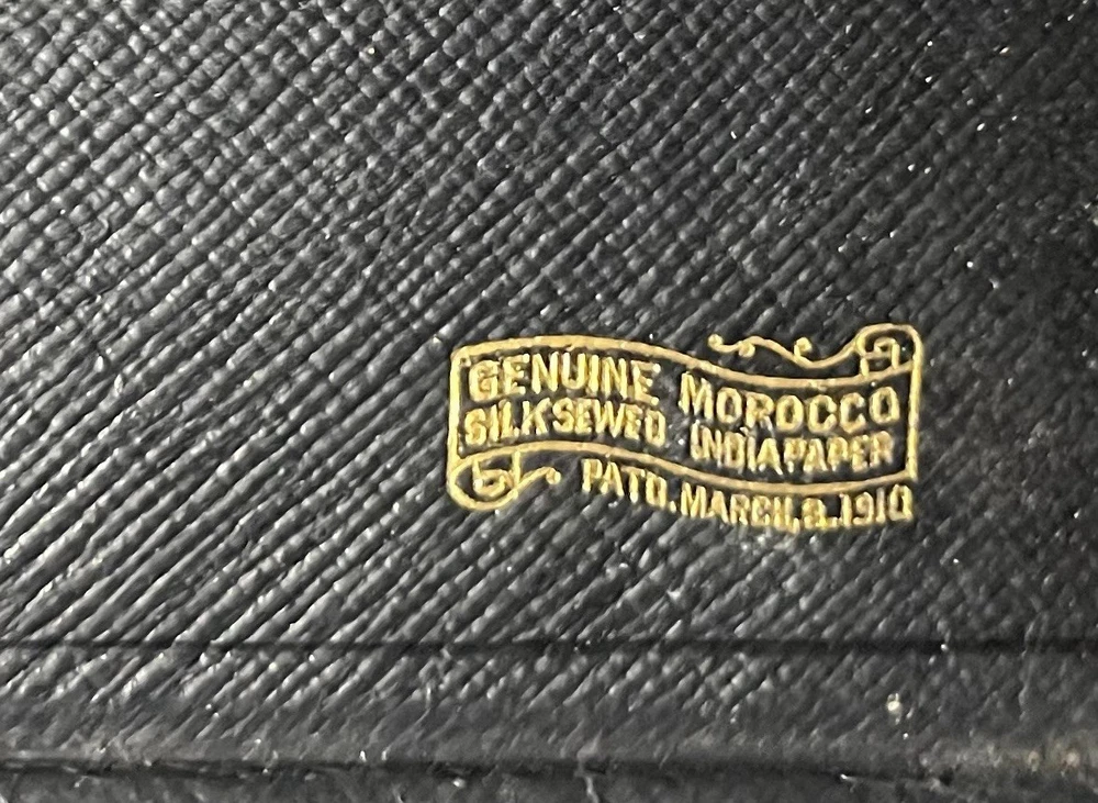 Good condition hardcover book. About 8-1/4” tall. 1901 Copyright. The binding has a 1910 patent date. Exterior: Morocco leather binding is clean, square, and tight. Fore edge is tabbed for indexing. Wear of all edges, corners and spine ends. Some edge tears. Gilt text front and spine. Owner name in gilt front cover. All edges gilt. Interior: some owner handwriting in ink on the second fly leaf (front and back). India paper. Pages are clean with no tears, creasing, or other handwriting. 1087 pages plus concordance and color maps.