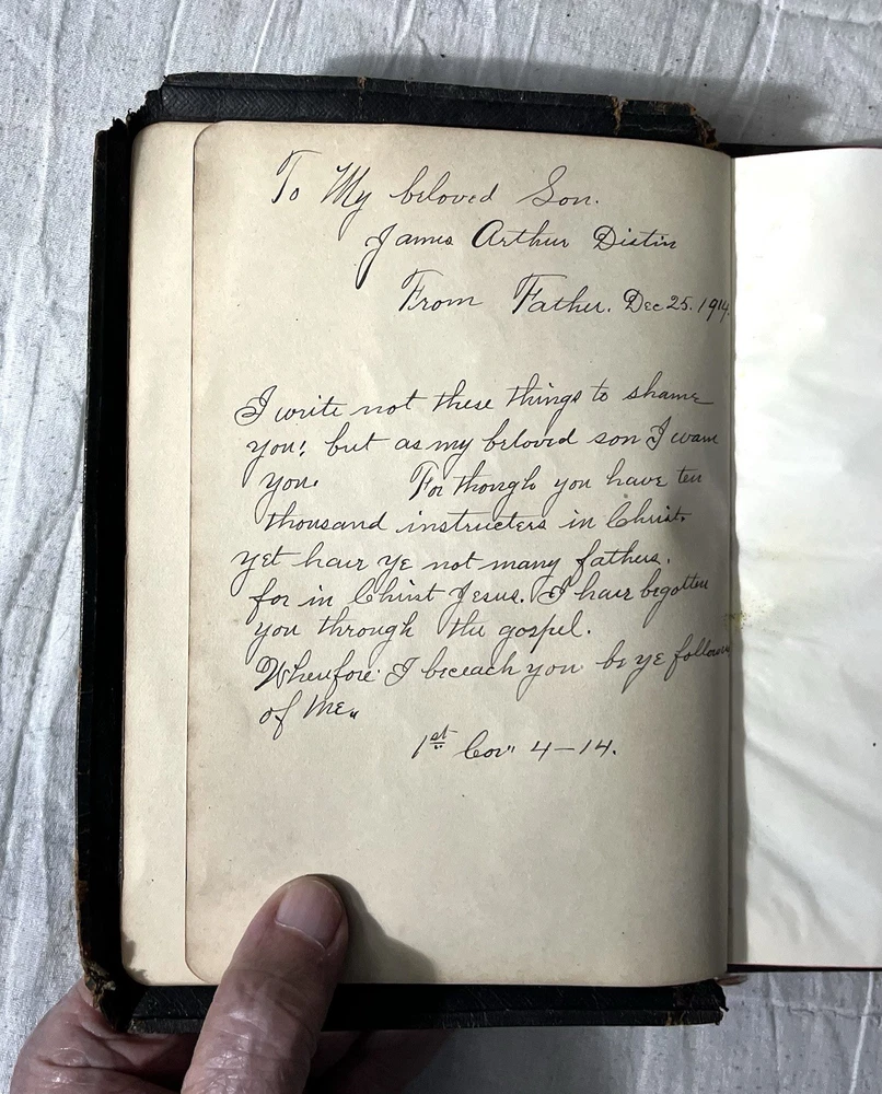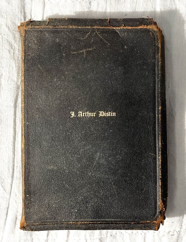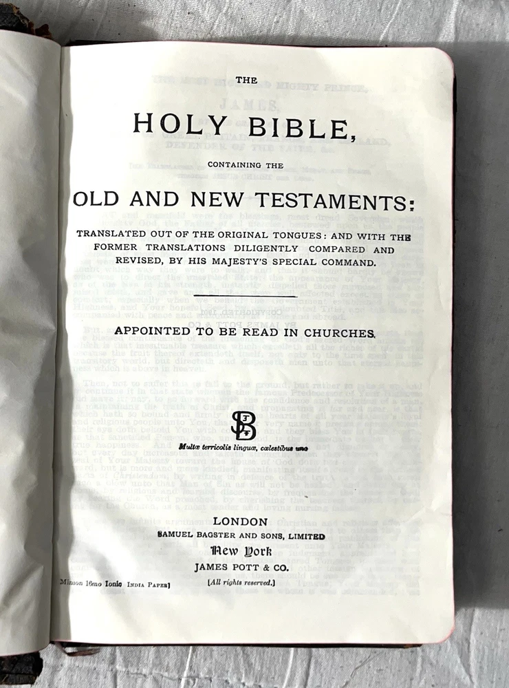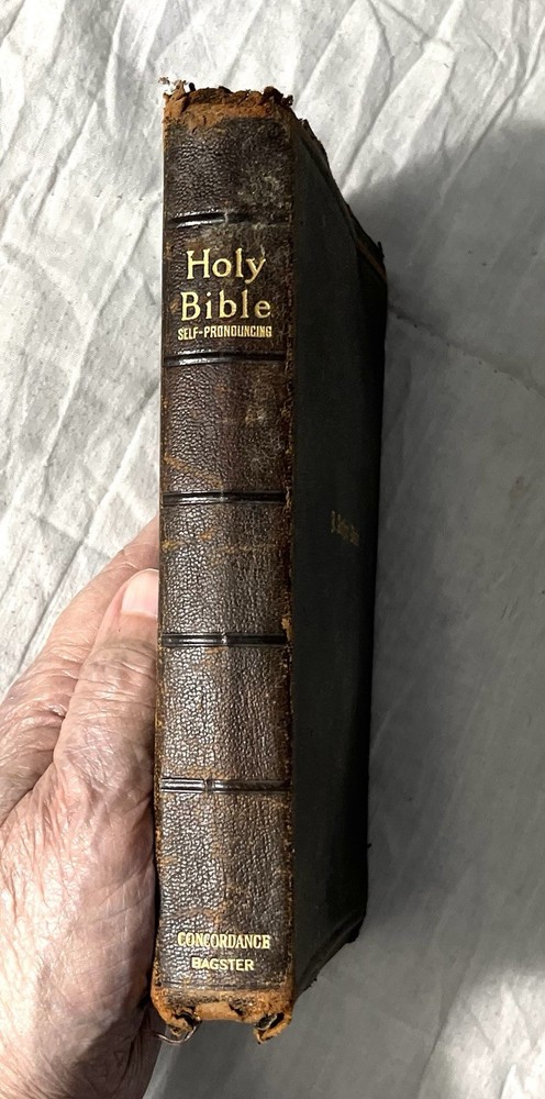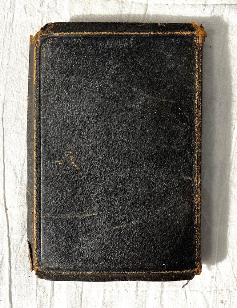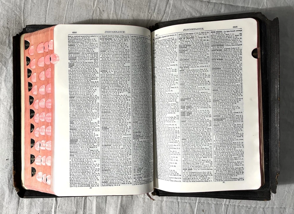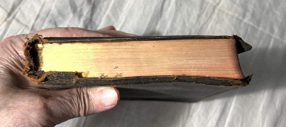 Good condition hardcover book. About 8-1/4” tall. 1901 Copyright. The binding has a 1910 patent date. Exterior: Morocco leather binding is clean, square, and tight. Fore edge is tabbed for indexing. Wear of all edges, corners and spine ends. Some edge tears. Gilt text front and spine. Owner name in gilt front cover. All edges gilt. Interior: some owner handwriting in ink on the second fly leaf (front and back). India paper. Pages are clean with no tears, creasing, or other handwriting. 1087 pages plus concordance and color maps.