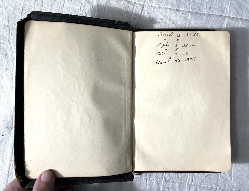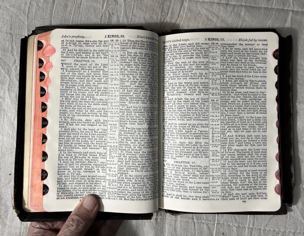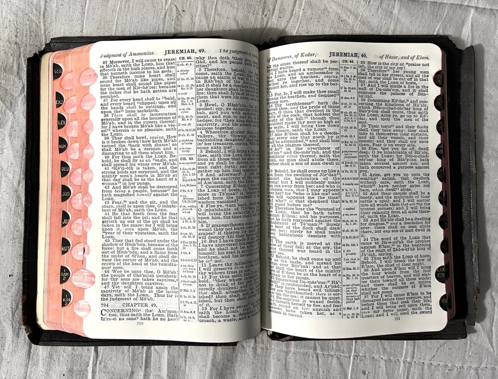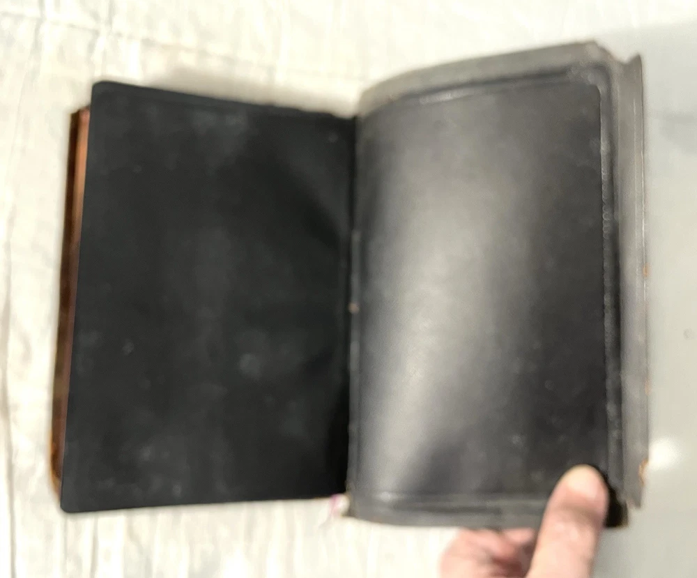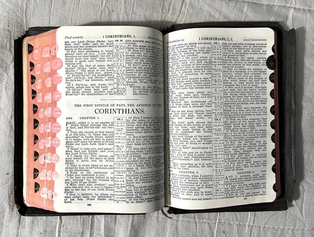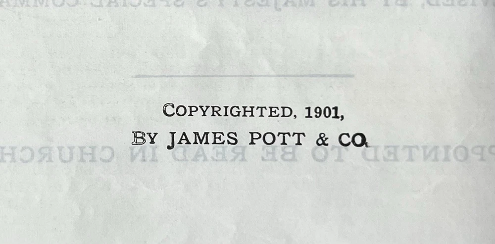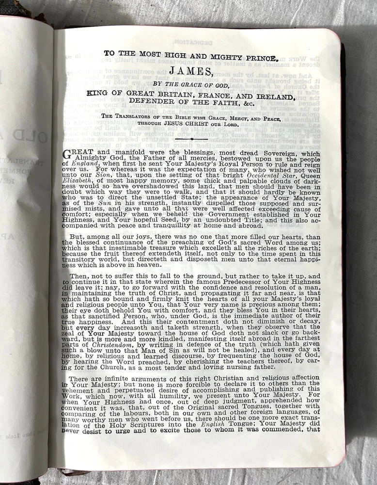 Good condition hardcover book. About 8-1/4” tall. 1901 Copyright. The binding has a 1910 patent date. Exterior: Morocco leather binding is clean, square, and tight. Fore edge is tabbed for indexing. Wear of all edges, corners and spine ends. Some edge tears. Gilt text front and spine. Owner name in gilt front cover. All edges gilt. Interior: some owner handwriting in ink on the second fly leaf (front and back). India paper. Pages are clean with no tears, creasing, or other handwriting. 1087 pages plus concordance and color maps.