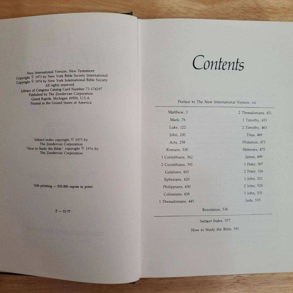 The product is a hardcover edition of the New International Version New Testament published by Zondervan in 1975. It is intended for young adults and adults, featuring faux leather binding and maps within its 594 pages. The book has a width of 1.25 inches, a height of 8.75 inches, and a length of 5.75 inches, weighing 1 pound and 15 ounces. The content covers topics related to spirituality, religion, and history, making it a valuable resource for those interested in the Bible and its teachings. Condition: Previous owners' inscription in red ink to last page of bible. Minor yellow of pages due to aging. Flaws pictured. Combined Shipping Discount Policy: $3 shipping on each additional item you add to your order. Shipping Description: Items shipped with tracking number available. Monday - Friday 8am to 5pm and Saturday 8am to 12pm. Shipping varies due to USPS holidays. 30 Day Return Policy: We accept any item returned within 30 days of the original purchase date for a full cash refund, minus the original shipping cost. The buyer is responsible for all return shipping costs. All returns must be received in the same condition as shipped before the refund is initiated. If the returned item is not received in the same condition as shipped, a partial or no refund will be issued, depending on the condition of the returned item. International Buyers Please Note: Import duties, taxes and charges are not included in the item price or shipping charges. These charges are the buyer's responsibility. Please check with your country's customs office to determine what these additional costs will be prior to bidding/buying. These charges are normally collected by the delivering freight (shipping) company or when you pick the item up, do not confuse them for additional shipping charges. We do not mark merchandise values below value or mark items as "gifts" - US and International government regulations prohibit such behavior. Except as expressly set forth in the item description, seller makes NO EXPRESS OR IMPLIED warranties of any kind whatsoever about this merchandise. Seller is not responsible for consequential, incidental or punitive damages of any kind whatsoever. Seller's liability is limited to the amount paid by Buyer including shipping/handling charges.