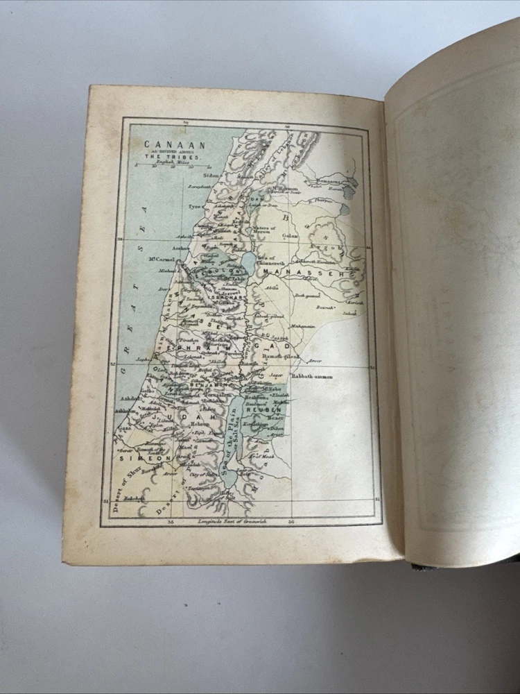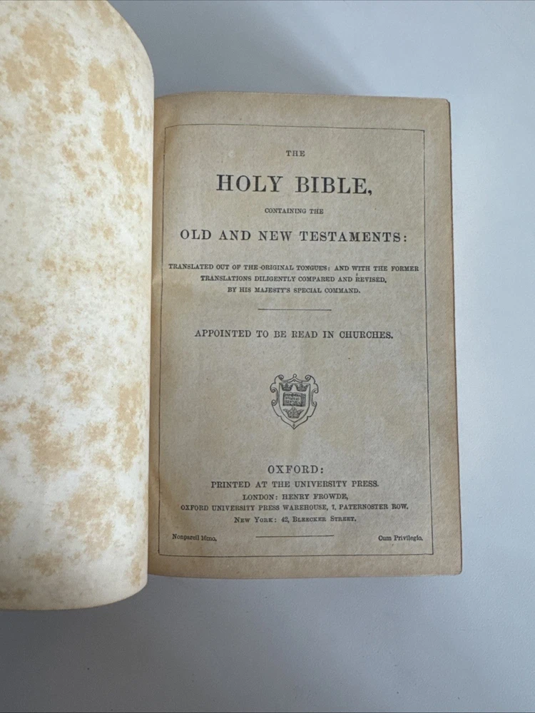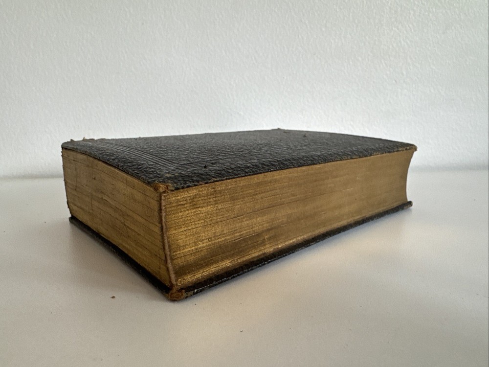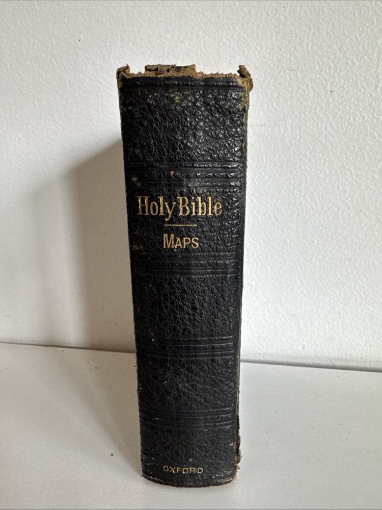 For sale is a vintage Holy Bible with Maps, KJV Published by Oxford University Press (year not listed). Firm black leather over cloth cover. Gold gilt page edges. Some general age and shelf wear. Some spine wear. Age tanning to pages. Some dirt, wear to exterior and edges. Shipped for FREE!