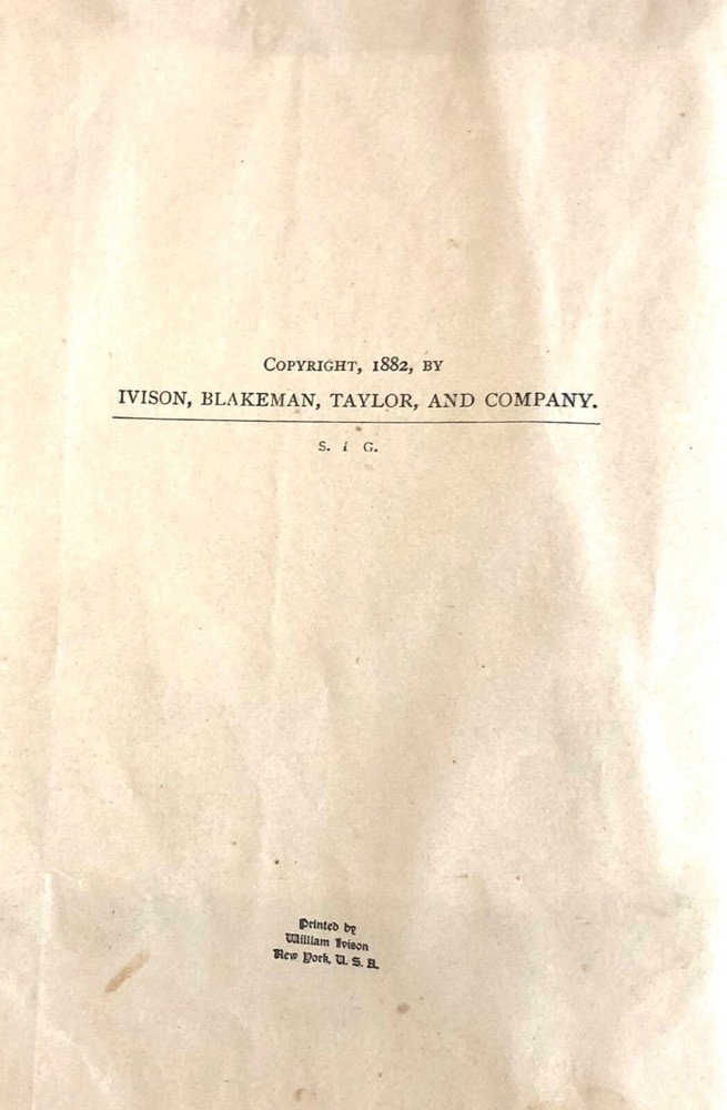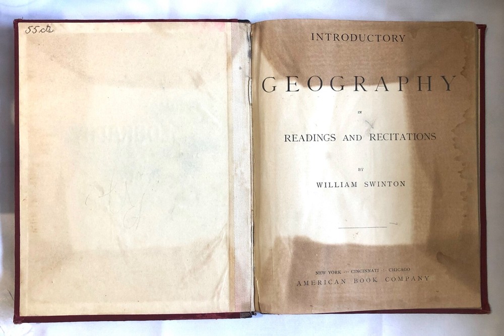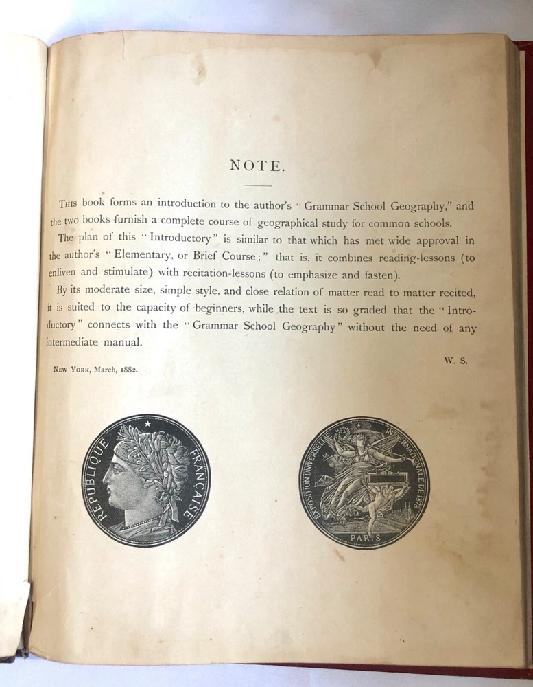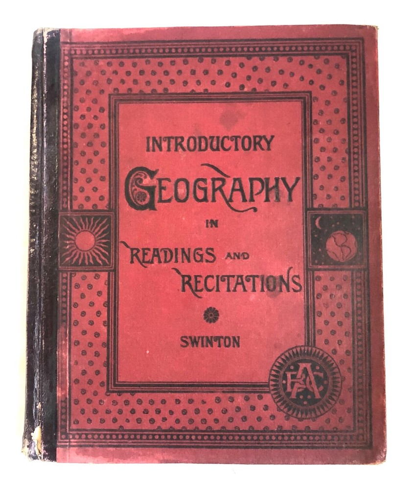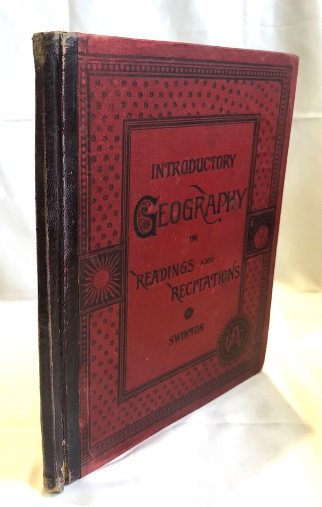 Introductory Geography in Readings and Recitations, William Swinton, American Book Company, N.Y., 1882, 118 pp. Many illustrations and 23 maps, most in color. Embossed cloth cover. Condition is good. Leather spine binding has a small tear and loss at the bottom edge. Back cover has a stain. Significant tanning on title page and initial page at back, apparently from an earlier protective cover. Last page appears to be missing, and current final page is torn and wrinkled, repaired with some transparent mending tissue to keep it in place. Binding is tight and pages are clean. Unusually good condition for a school book of this era. Measures about 9 1/4 inches by 7 1/2 inches. Ships in acid-free sleeve.
