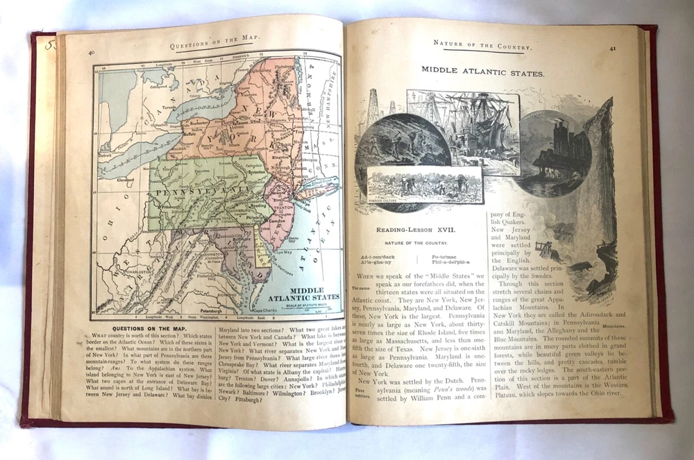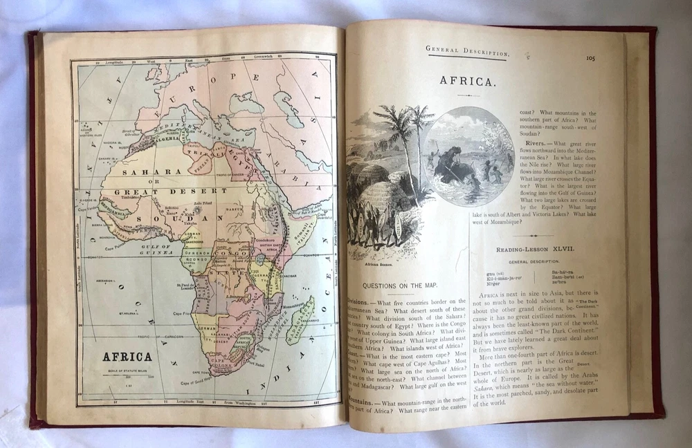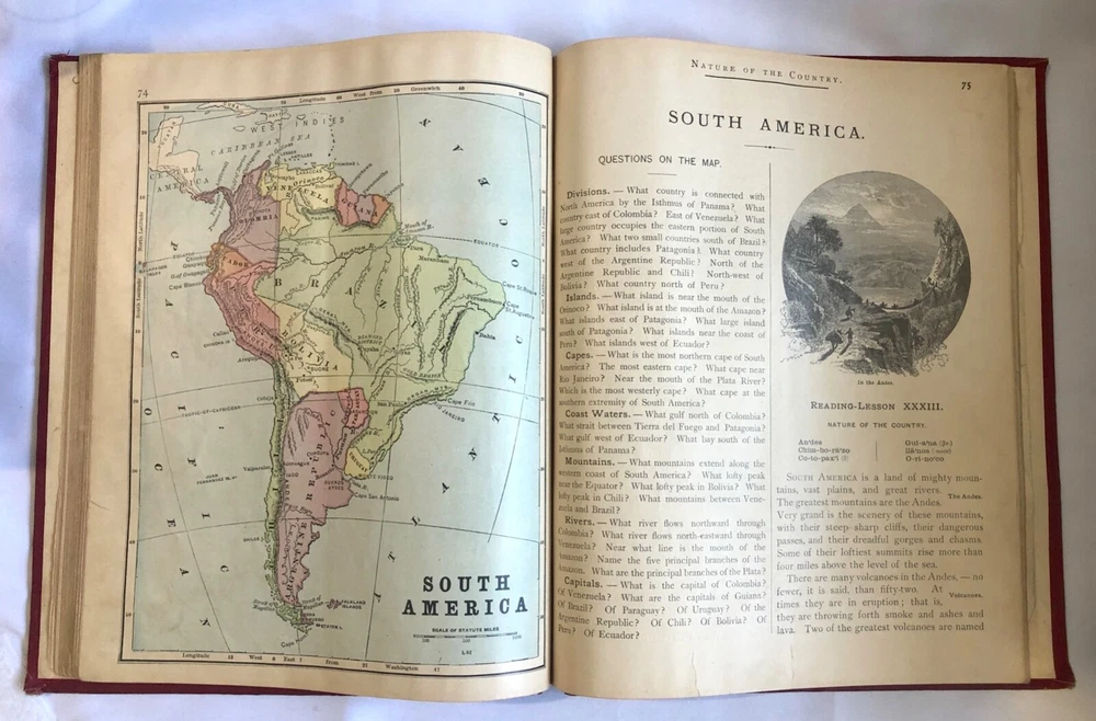 This vintage 1882 geography book is a fascinating piece of history with beautiful color maps and detailed illustrations. The embossed cloth cover and leather spine add classic charm, though there’s minor wear and a stain. The pages show age with tanning and a repaired tear, but the content remains clear and engaging—perfect for collectors who appreciate antique educational texts. A great find for history or geography enthusiasts!