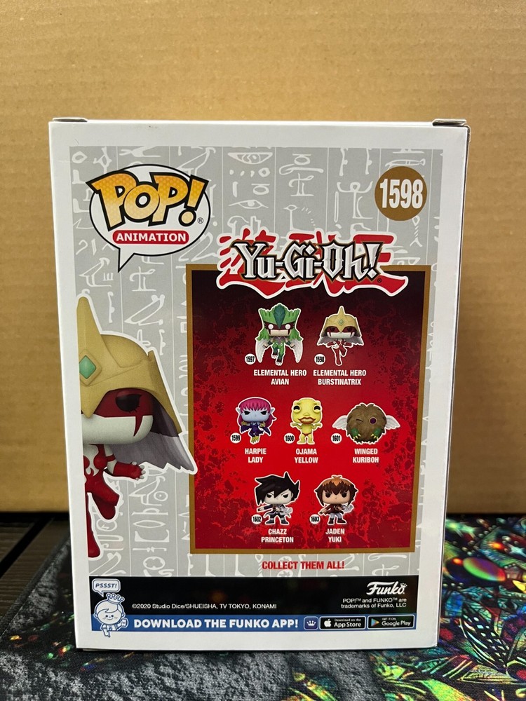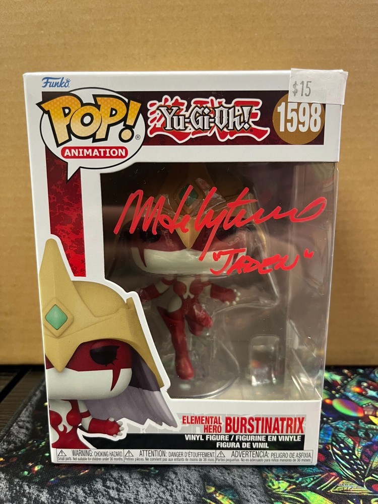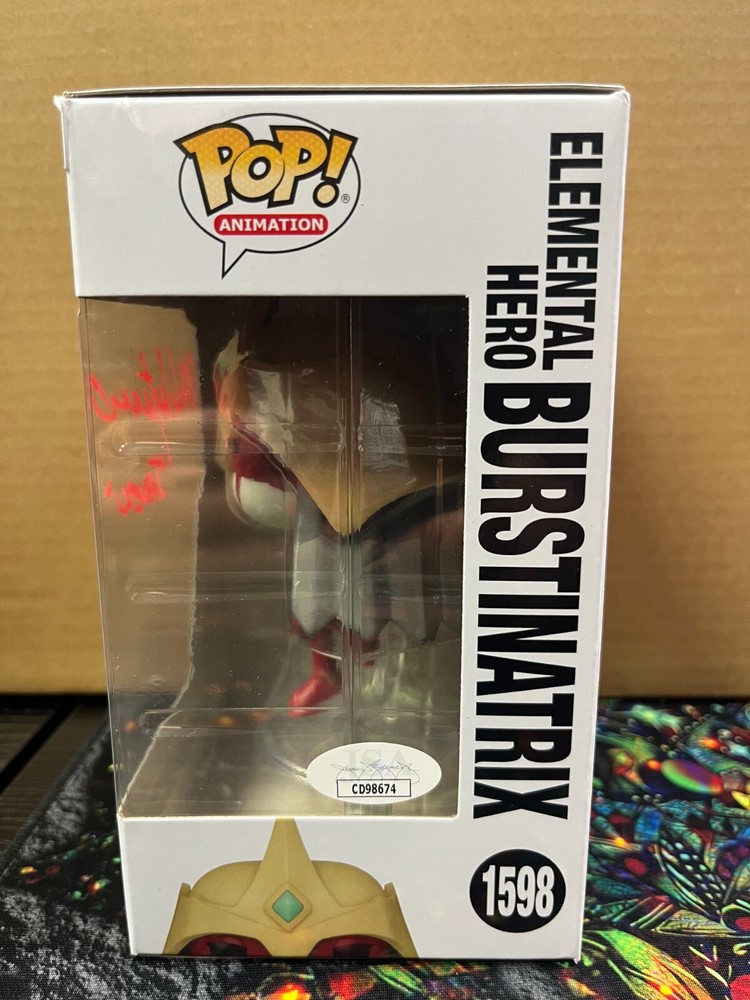 The product is a signed Funko Pop vinyl figure of the Elemental Hero Burstinatrix from the Yu-Gi-Oh! series. The figure, part of the Pop! Vinyl collection, is autographed by Mathew Labyorteaux and authenticated by James Spence Authentication (JSA). This collectible item is a must-have for fans of anime and manga, specifically those who are interested in the Yu-Gi-Oh! franchise and its iconic characters.