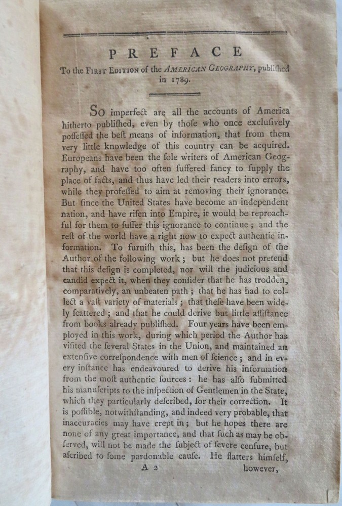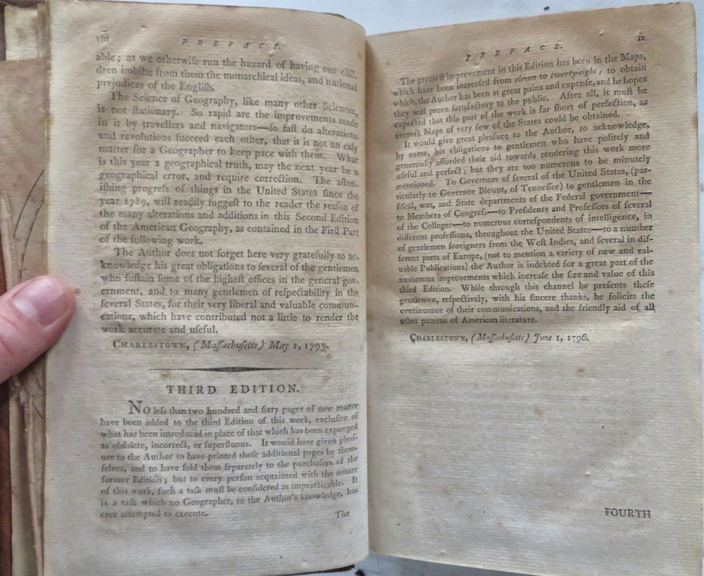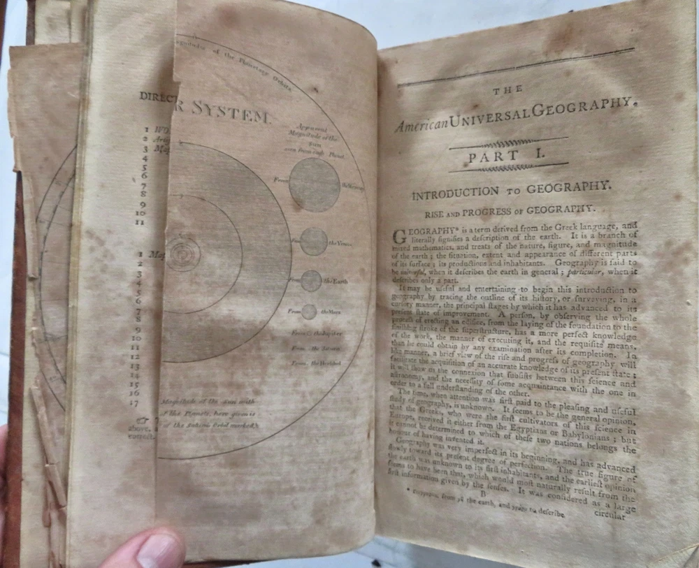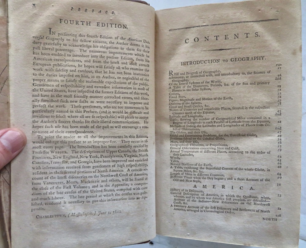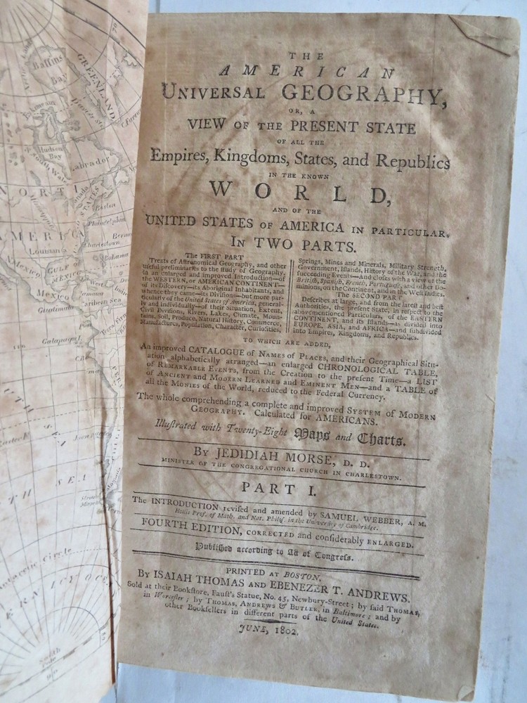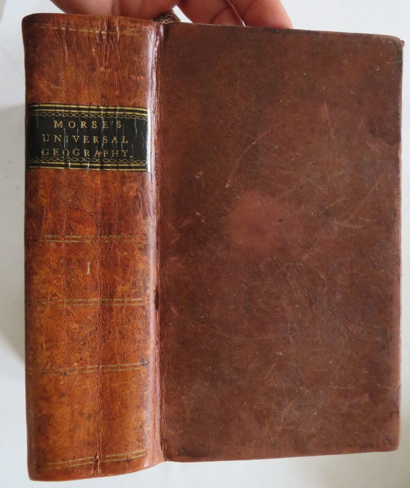 Jedidiah Morse's American Universal Geography 1802 leather book w/ maps Gridley Jedidiah Morse's American Universal Geography 1802 leather book w/ maps Gridley (Old Books, 19th Century Books, Leather Books, Universal Geography, Morse's American Geography, Ethnography, Books with Maps). The American Universal Geography, or A View of the Present State of All the Empires, Kingdoms, States, and Republics in the Known World, and of the United States of America in Particular, by Jedidiah Morse. Published June, 1802, Boston by Isaiah Thomas and Ebenezer T. Andrews. Vol. 1 only (focusing on the United States). 832 pages. Text in English. Folding world in hemispheres map at front (engrv. by Gridley), half the solar system plate remains, a large portion of the folding "Map of Northern Parts of the United States" map (by Abraham Bradley) remains (bottom is defective), nice folding map of New Hampshire & Vermont (engr. by Gridley), most of the West Indies map remains (left edge frayed with some edge loss), . Attractive antiquarian full leather binding, smooth spine, gilt bands, gilt title lettering on contrasting black leather label. Volume one of a two volume set. Contents of this volume complete unto themselves, the more desirable of the set since this one covers at length all the territories and regions then within the U.S.. Book is physically old and shows some signs of handling and time. Binding gently age worn but still appealing, leather and joints slightly rubbed but still supple, remains overall very attractive as an object. Text block paper is age toned as typical, some toning and foxing, internally book remains mostly clean, tight and sound. A book which has been taken care of but may/ does not look like new. Still attractive on the shelf. Book displays a pleasing and unique age patina and is in rather nice antiquarian condition, any age flaws seem easy to overlook or forgive. Please review photos for more detailed attempt to present this rare book as it survives. We often over-describe any flaws that many sellers would not even bother to mention since most people would overlook them as minor and unworthy of comment. Many people tell us the books they receive from us are nicer in person than they appears on the screen. We want you to be clear about what you are buying, so we take numerous photos and try to describe it openly and honestly. Book Measures c. 8 3/4" H x 5 1/2" W. [B11868].