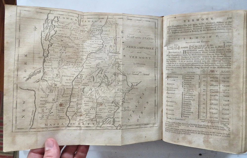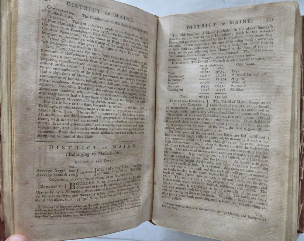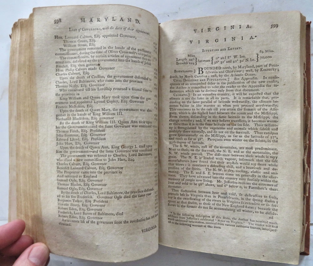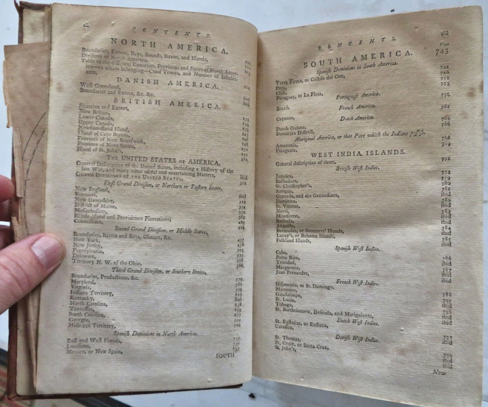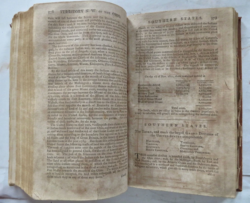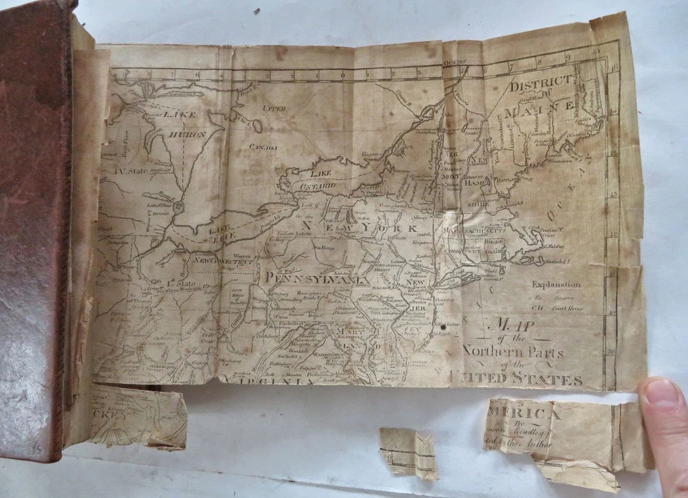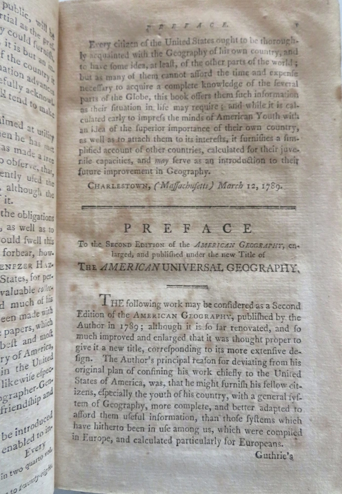 Jedidiah Morse's American Universal Geography 1802 leather book w/ maps Gridley Jedidiah Morse's American Universal Geography 1802 leather book w/ maps Gridley (Old Books, 19th Century Books, Leather Books, Universal Geography, Morse's American Geography, Ethnography, Books with Maps). The American Universal Geography, or A View of the Present State of All the Empires, Kingdoms, States, and Republics in the Known World, and of the United States of America in Particular, by Jedidiah Morse. Published June, 1802, Boston by Isaiah Thomas and Ebenezer T. Andrews. Vol. 1 only (focusing on the United States). 832 pages. Text in English. Folding world in hemispheres map at front (engrv. by Gridley), half the solar system plate remains, a large portion of the folding "Map of Northern Parts of the United States" map (by Abraham Bradley) remains (bottom is defective), nice folding map of New Hampshire & Vermont (engr. by Gridley), most of the West Indies map remains (left edge frayed with some edge loss), . Attractive antiquarian full leather binding, smooth spine, gilt bands, gilt title lettering on contrasting black leather label. Volume one of a two volume set. Contents of this volume complete unto themselves, the more desirable of the set since this one covers at length all the territories and regions then within the U.S.. Book is physically old and shows some signs of handling and time. Binding gently age worn but still appealing, leather and joints slightly rubbed but still supple, remains overall very attractive as an object. Text block paper is age toned as typical, some toning and foxing, internally book remains mostly clean, tight and sound. A book which has been taken care of but may/ does not look like new. Still attractive on the shelf. Book displays a pleasing and unique age patina and is in rather nice antiquarian condition, any age flaws seem easy to overlook or forgive. Please review photos for more detailed attempt to present this rare book as it survives. We often over-describe any flaws that many sellers would not even bother to mention since most people would overlook them as minor and unworthy of comment. Many people tell us the books they receive from us are nicer in person than they appears on the screen. We want you to be clear about what you are buying, so we take numerous photos and try to describe it openly and honestly. Book Measures c. 8 3/4" H x 5 1/2" W. [B11868].