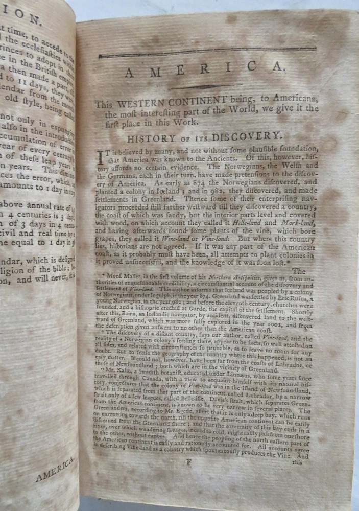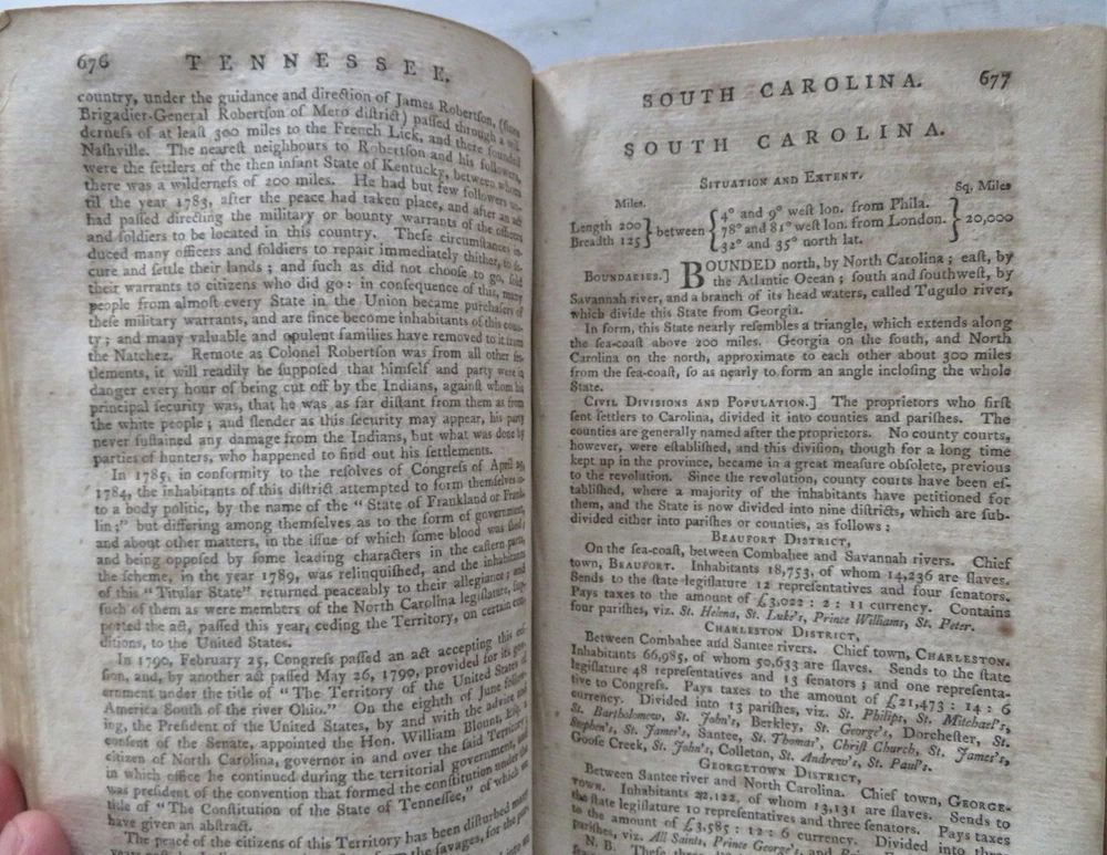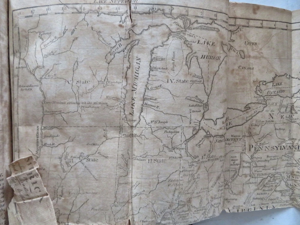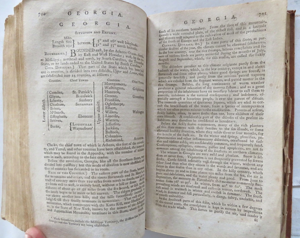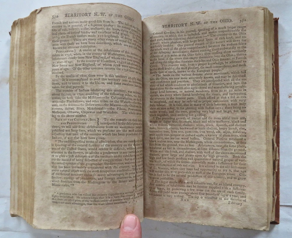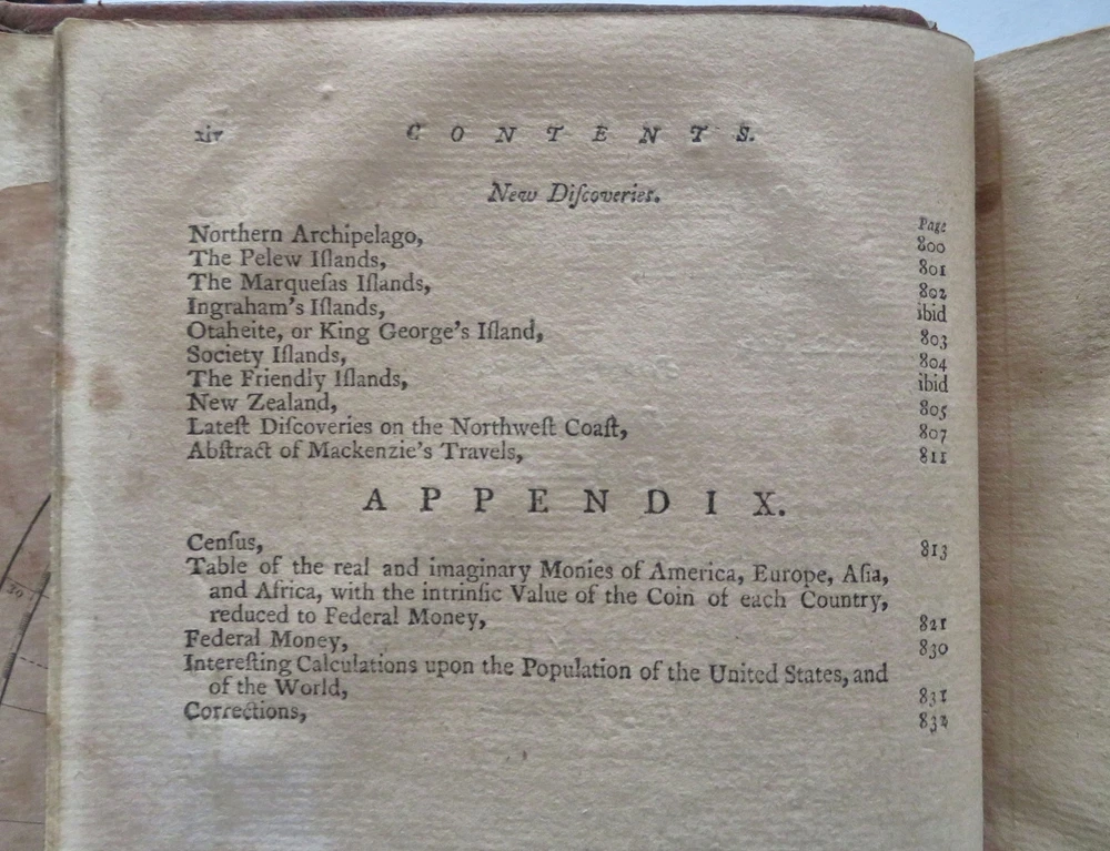 Jedidiah Morse's American Universal Geography 1802 leather book w/ maps Gridley Jedidiah Morse's American Universal Geography 1802 leather book w/ maps Gridley (Old Books, 19th Century Books, Leather Books, Universal Geography, Morse's American Geography, Ethnography, Books with Maps). The American Universal Geography, or A View of the Present State of All the Empires, Kingdoms, States, and Republics in the Known World, and of the United States of America in Particular, by Jedidiah Morse. Published June, 1802, Boston by Isaiah Thomas and Ebenezer T. Andrews. Vol. 1 only (focusing on the United States). 832 pages. Text in English. Folding world in hemispheres map at front (engrv. by Gridley), half the solar system plate remains, a large portion of the folding "Map of Northern Parts of the United States" map (by Abraham Bradley) remains (bottom is defective), nice folding map of New Hampshire & Vermont (engr. by Gridley), most of the West Indies map remains (left edge frayed with some edge loss), . Attractive antiquarian full leather binding, smooth spine, gilt bands, gilt title lettering on contrasting black leather label. Volume one of a two volume set. Contents of this volume complete unto themselves, the more desirable of the set since this one covers at length all the territories and regions then within the U.S.. Book is physically old and shows some signs of handling and time. Binding gently age worn but still appealing, leather and joints slightly rubbed but still supple, remains overall very attractive as an object. Text block paper is age toned as typical, some toning and foxing, internally book remains mostly clean, tight and sound. A book which has been taken care of but may/ does not look like new. Still attractive on the shelf. Book displays a pleasing and unique age patina and is in rather nice antiquarian condition, any age flaws seem easy to overlook or forgive. Please review photos for more detailed attempt to present this rare book as it survives. We often over-describe any flaws that many sellers would not even bother to mention since most people would overlook them as minor and unworthy of comment. Many people tell us the books they receive from us are nicer in person than they appears on the screen. We want you to be clear about what you are buying, so we take numerous photos and try to describe it openly and honestly. Book Measures c. 8 3/4" H x 5 1/2" W. [B11868].