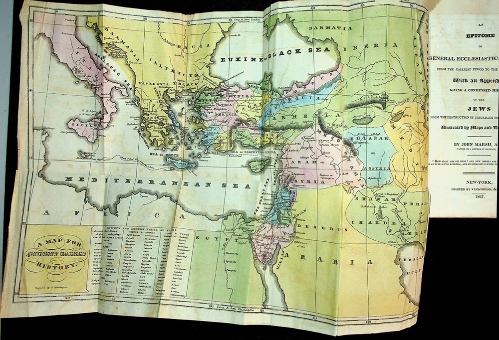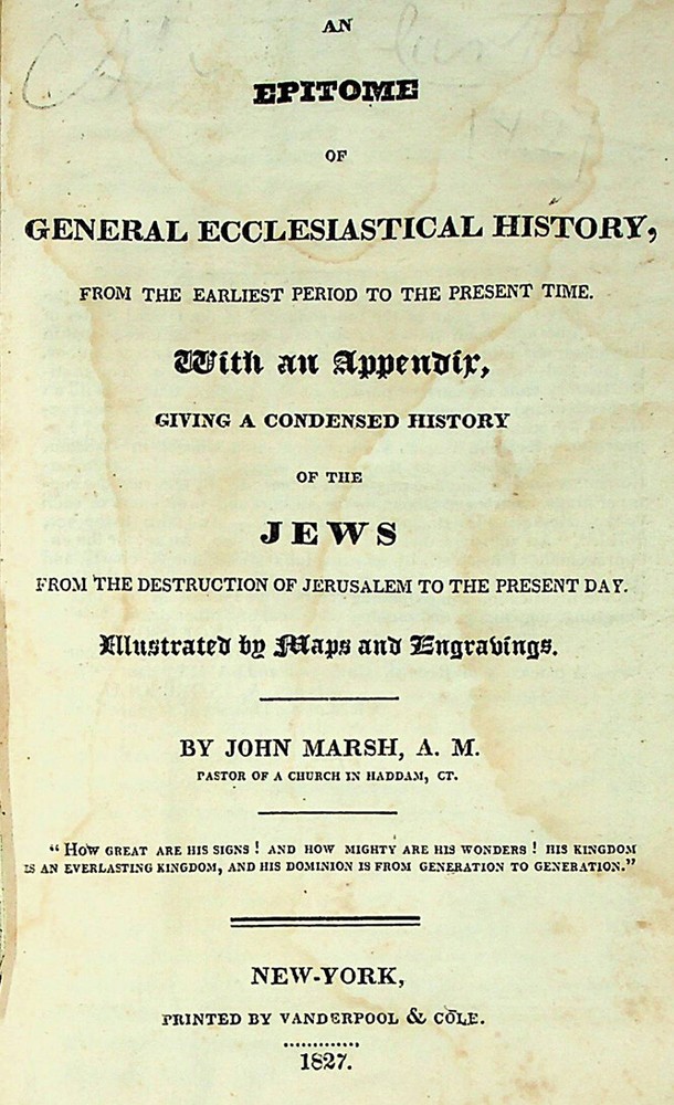 JOHN MARSH. An Epitome of General Ecclesiastical History ... With an Appendix Giving a Condensed History of the Jews, New York: Vanderpool & Cole, 1827. 12mo, priority unknown here, pp. 420, 32 (appendix), tree calf boards with gilt lettering and decoration to spine, all edges tinted yellow, folding maps, 1 hand-colored, chart, other illustration. The author, who entered Yale College at age 12, was a leading temperance speaker and preacher, and the present book, which was written for young people, was a big seller that went through 16 editions (Allibone p. 1088, Wikipedia). Condition of this book Covers worn at edges, front joint cracked, spine lettering is flaking away, small piece at head of spine is gone. Varying degrees of internal foxing and staining. Shipments outside the U.S. may be subject to local taxes.