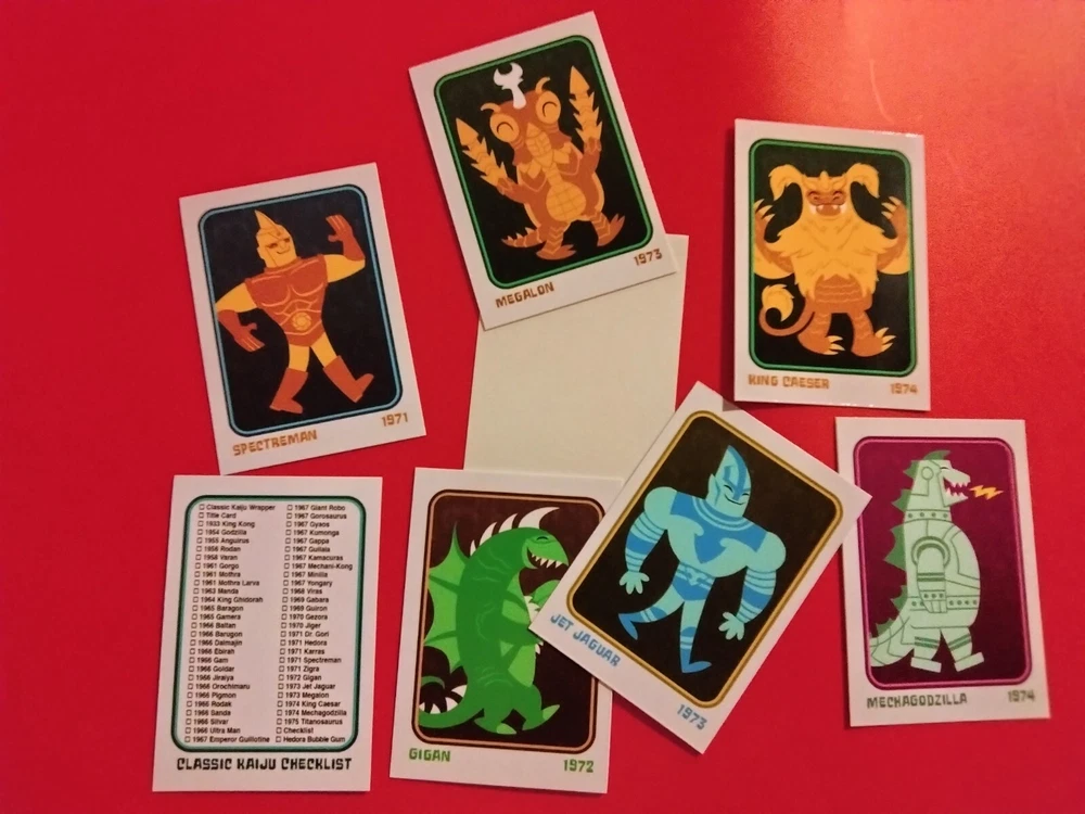 These are ART CARDS by a private designer (Darryl Young). They are in my collection because I love classic horror/sci-fi and felt the need to sell/showcase them on my site. The cards are cartoon caricatures of the legendary movie monsters. The kaiju monsters are the source of many great childhood memories and will forever remain MEGAcool!!! Classic KAIJU giant monster cards. Cards are pack fresh (opened by me) and are smaller "mini" dimensions 1.75" x 2.5". Choose your favorite! Cards totaling under $20 will be sent eBay Standard Shipping. Orders Totaling over $20 USPS Ground. FREE SHIPPING Thank you for your interest.