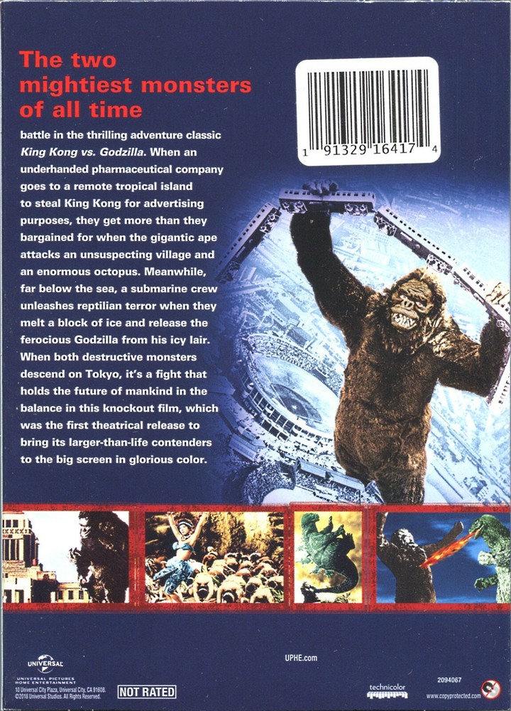 King Kong vs. Godzilla Japanese Cinema 1 Hour 37 Minutes 1962 Universal Studios Not rated 2018 Release BRAND NEW Factory Sealed DVD with SLIPCOVER VIDEO Codec: MPEG-2 Encoding format: 16:9 Resolution: 480i (NTSC) Aspect ratio: 2.35:1 Original aspect ratio: 2.35:1 AUDIO English: Dolby Digital 2.0 Mono SUBTITLES English, French, Spanish PLAYBACK Region 1 (U.S. and Canada only) 191329164174 61196909 2094067 28436