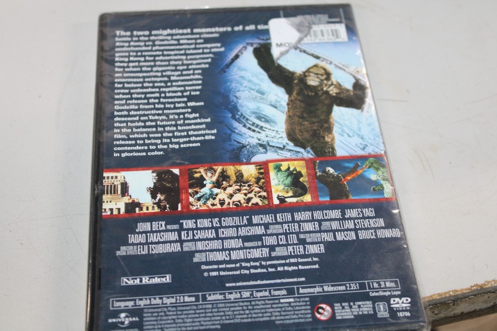 This is a DVD of the movie "King Kong vs. Godzilla" from 1962, featuring a Widescreen format. The film is directed by Ishiro Honda and Thomas Montgomery, produced by John Beck and Tomoyuki Tanaka, and distributed by Universal Studios. It has a runtime of 91 minutes and is available in English language with subtitles in English, French, and Spanish. The Two Mightiest Monster of all Times
