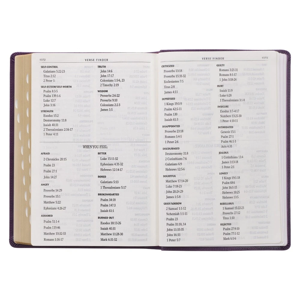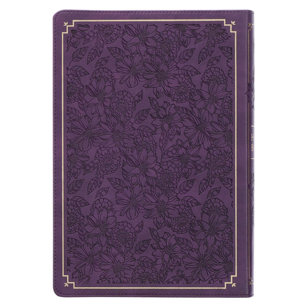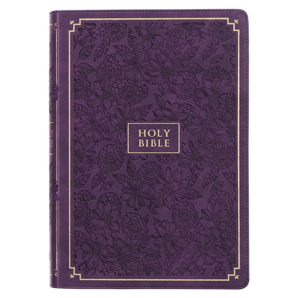 The Purple Faux Leather Giant Print Full-Size King James Version Bible with Thumb Index is a stunningly beautiful KJV Bible for a mother, aunt, or grandmother with print large enough to reduce eye strain. Visit Storefront Contact Us View Feedback About Our Company KJV Holy Bible, Giant Print Full-size Faux Leather Red Letter Edition - Thumb Index & Ribbon Marker, King James Version, Purple Floral Item Details The Purple Faux Leather Giant Print Full-Size King James Version Bible with Thumb Index is a stunningly beautiful KJV Bible for a mother, aunt, or grandmother with print large enough to reduce eye strain. The Purple Faux Leather Giant Print Full-Size King James Version Bible with Thumb Index is a stunningly beautiful KJV Bible for a mother, aunt, or grandmother with print large enough to reduce eye strain. A multitude of flowers is subtly heat-debossed on the faux leather covers to create an understated texture and is held in place by a thin gold-foiled frame that runs along the edges of the Bible. The title, presented in gold-foiled block letters, is situated in the center of the design and framed with its own gold-foiled border. HOLY BIBLE The design repeats itself in a smaller format along the lay-flat spine where the version reference is heat-debossed. KJV A satin ribbon marker and gilt-edged pages add a sophisticated touch to the Bible. You can find all you need to navigate your Bible in the back pages, including a thematic Scripture verse finder and a one-year Bible reading plan. Thumb indexing tabs make it easy to find any book of the Bible. The pages are double-column formatted, have helpful sub-headings, Christ’s words are printed in red ink, and the giant 14-point font will reduce eyestrain. The original 1769 English text with the addition of reader-friendly subheadings is featured in this Bible so expect slight variations in spelling and language use. The purple Bible comes packaged in a full-color printed cardstock sleeve. Write a well-wishing note on the front presentation page when you give this Bible to someone special. The Purple Faux Leather Giant Print Full-Size King James Version Bible with Thumb Index will be a welcome gift to a mom, grandmother, or aunt who loves to read from the KJV version. Heat-debossed floral design with gold foiled frame Purple faux leather cover Flexcover Classic King James Version Full-size Bible Gold foiled titles Thumb-indexing tabs Satin ribbon marker 1400 gilt-edged pages Presentation page Lay-flat Smyth-sewn binding Reader-friendly subheadings Double-column format Words of Christ in red Thematic Scripture verse finder One-year Bible reading plan 8 full-color maps Giant print 14-point type Packaged in full-color printed cardstock sleeve Size: 9.7" x 6.7" x 1.5" (246 x 170 x 38mm) Return Policy To ensure complete satisfaction of our customers, we offer a 30 day return policy for all orders. Please reach out to us if you have any questions and one of our friendly customer service representatives will reply within 24 hours. This excludes weekends and holidays. Shipping Information All orders are fulfilled and shipped within 1-2 business days excluding holidays and will be shipped via standard economy shipping. Please do not hesitate to reach out with any questions. Please Note: Our hours of operation are Monday-Friday, 8am-5pm (CST). All orders received before 2pm (CST) will be processed & shipped within 1-2 business days.* Average transit times are 2-7 business days to the contiguous 48 United States and the District of Columbia. (*Does not apply to holidays or special orders.) Shop Our Storefront | View Feedback | Contact Us | Add Us to Your Favorites