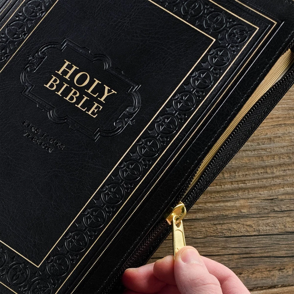 The timeless design of the Black Framed Faux Leather Giant Print Full-size KJV Bible with Thumb Index and Zippered Closure ensures that it will be a well-received gift for anyone special in your life. Visit Storefront Contact Us View Feedback About Our Company KJV Holy Bible, Giant Print Full-size Faux Leather w/Thumb Index & Ribbon Marker, Red Letter Edition, King James Version, Black, Zipper Closure Item Details The timeless design of the Black Framed Faux Leather Giant Print Full-size KJV Bible with Thumb Index and Zippered Closure ensures that it will be a well-received gift for anyone special in your life. The timeless design of the Black Framed Faux Leather Giant Print Full-size King James Version Bible with Thumb Index and Zippered Closure ensures that it will be a well-received gift for anyone special in your life. The Bible's smooth, black faux leather cover features a triple gold-foiled frame accented with a heat-debossed floral medallion design. The gold-foiled title is centered within its own heat-debossed ornate bracket frame, and the version reference is heat-debossed below it. The heat-debossed medallion motif, as well as the gold-foiled title, are repeated on the spine. HOLY BIBLE KING JAMES VERSION The heat-debossed triple frame design is repeated on the back cover. This Bible includes all the essentials, from the presentation page at the front, thumb indexing, and a zippered closure to the reading plan and verse finder at the back. An attached satin ribbon ensures you will never lose your place, and you will find it easy to reflect on the words of Christ because of their red inking. Gilt-edged pages finish the exquisite design. The zippered closure will ensure that all loose notes, sermon bulletins, and bookmarks are securely tucked inside. The original 1769 English KJV text is presented in a double-column format so expect slight variations in spelling and language use. The giant 14-point type font makes reading easy and lessens the strain on the eyes. The Bible is packaged in a full-color printed cardstock sleeve. Bless a newly ordained pastor with this Bible, which is easy to read from a distance. It will serve him well as he preaches the gospel from the pulpit each Sunday. He would love to keep the Black Framed Faux Leather Giant Print Full-size King James Version Bible with Thumb Index and Zippered Closure close at hand or on the pulpit. Heat-debossed medallion motif and triple gold foiled frame design Black faux leather cover Flexcover Zippered closure Classic King James Version Full-size Bible Gold foiled titles Thumb-indexing tabs Satin ribbon marker 1400 gilt-edged pages Presentation page Lay-flat Smyth-sewn binding Reader-friendly subheadings Double-column format Words of Christ in red Thematic Scripture verse finder One-year Bible reading plan 8 full-color maps Giant print 14-point type Packaged in a full-color printed cardstock sleeve Size: 9.9" x 6.8" x 1.5" (251 x 173 x 38mm) Return Policy To ensure complete satisfaction of our customers, we offer a 30 day return policy for all orders. Please reach out to us if you have any questions and one of our friendly customer service representatives will reply within 24 hours. This excludes weekends and holidays. Shipping Information All orders are fulfilled and shipped within 1-2 business days excluding holidays and will be shipped via standard economy shipping. Please do not hesitate to reach out with any questions. Please Note: Our hours of operation are Monday-Friday, 8am-5pm (CST). All orders received before 2pm (CST) will be processed & shipped within 1-2 business days.* Average transit times are 2-7 business days to the contiguous 48 United States and the District of Columbia. (*Does not apply to holidays or special orders.) Shop Our Storefront | View Feedback | Contact Us | Add Us to Your Favorites