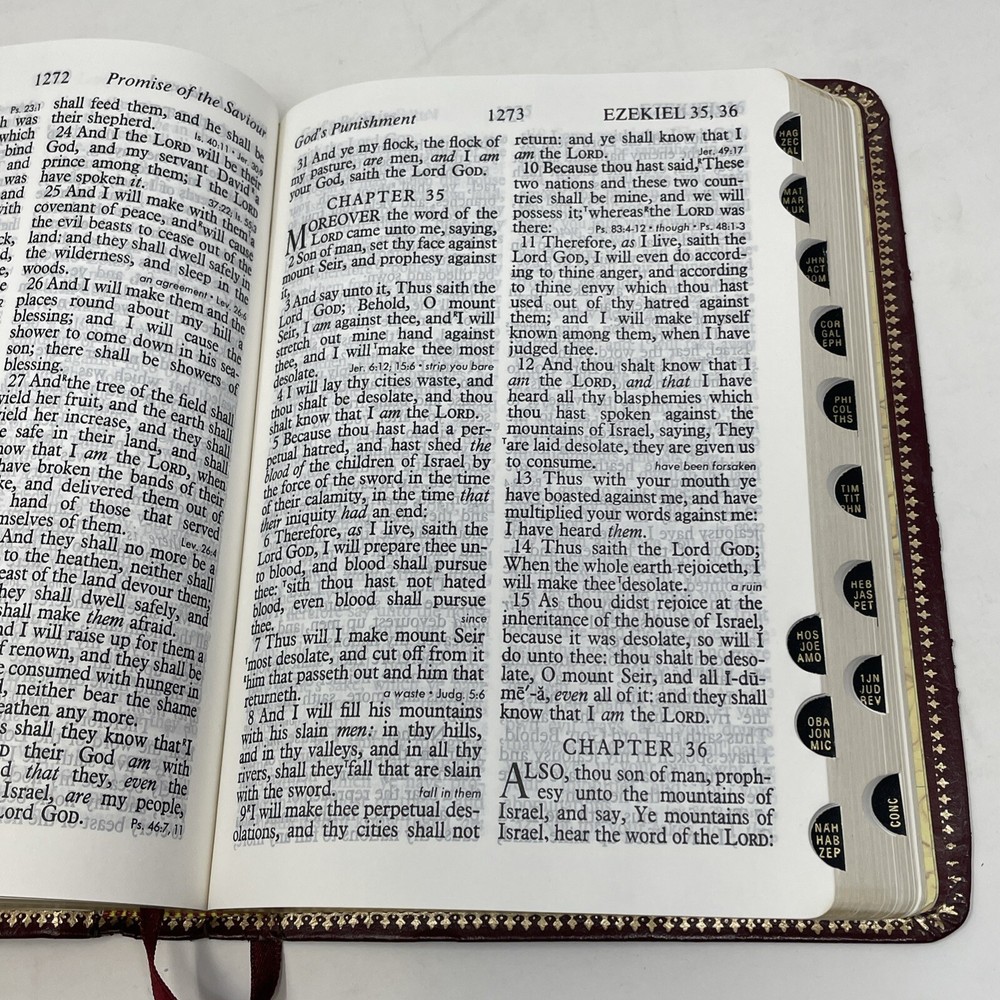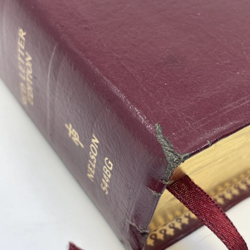 KJV Giant Print Reference Bible THUMB INDEX Genuine Bonded Leather Nelson 544BG This 1976 Nelson giant print Bible is in good used condition. It has no writing or highlighting inside. It appears to have had very limited use and is very clean. The edges of the spine cover show wear from storage. This is evident in pictures. It is rare to find a Bible this age in this condition. See pictures for details of exact condition.