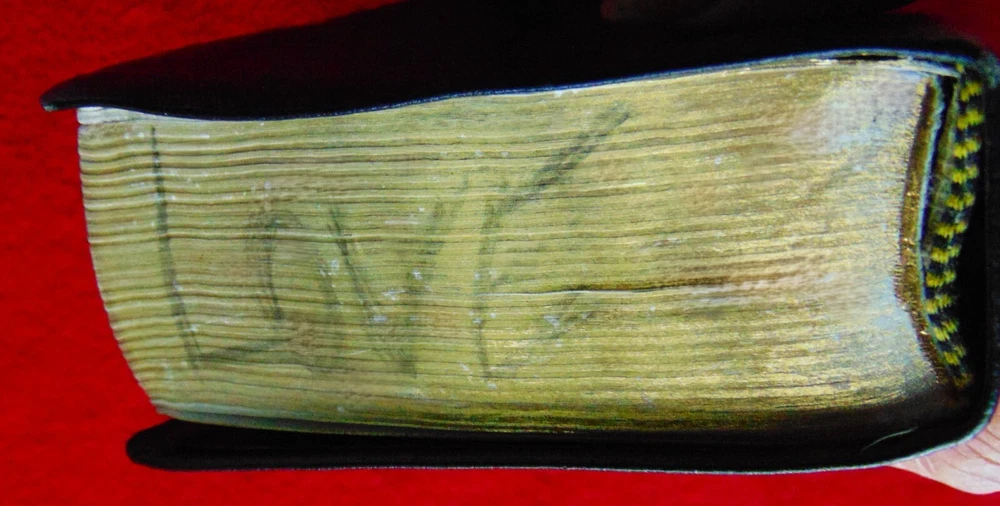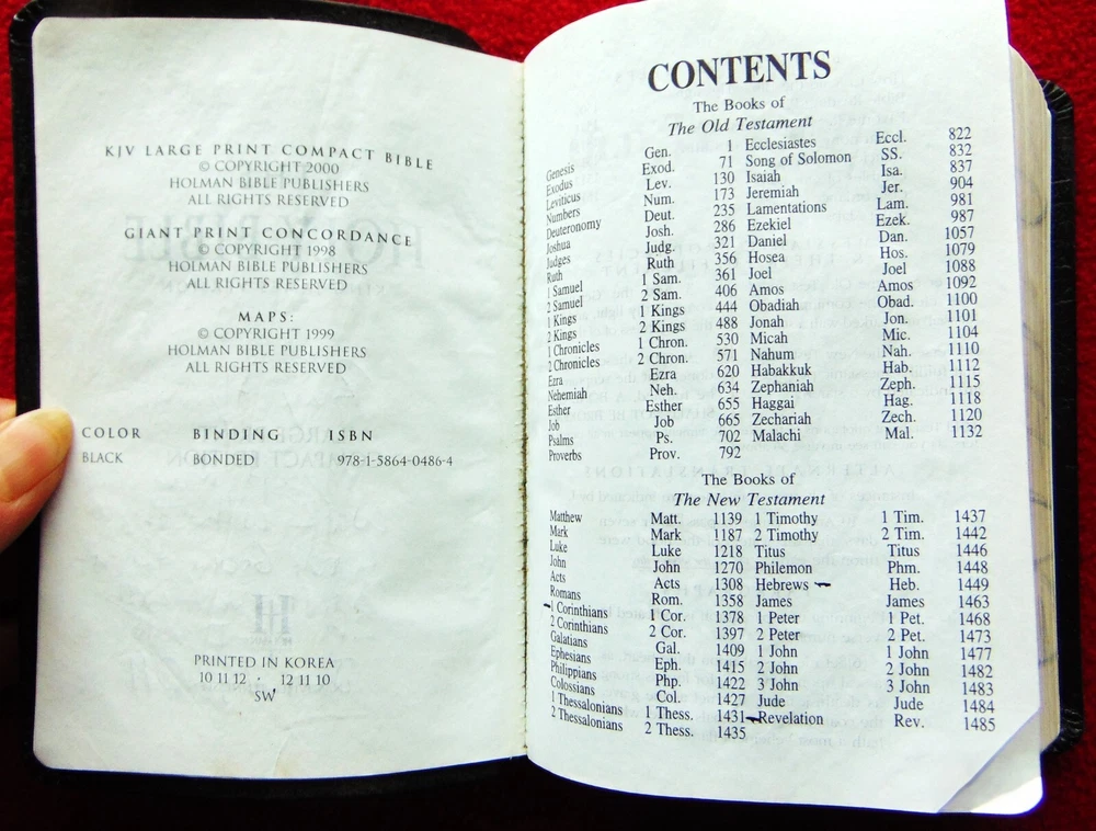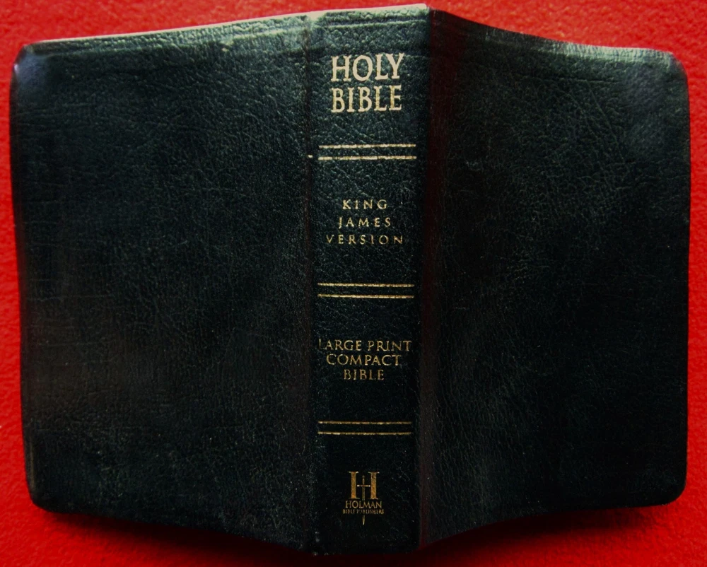 HOLY BIBLE ~ KING JAMES VERSION ~ COMPACT EDITION WITH LARGE PRINT ~ BLACK LEATHER COVER ~ GOLD EDGED ON THREE SIDES ~ CONCORDANCE & COLORED MAPS ~ YEAR 2000 ~ PRINTED IN KOREA BY HOLMAN BIBLE PUBLISHERS ~ SEE CONDITION DESCRIPTION ~ SIZE IS 4" WIDE x 6" HIGH x 1 3/8" THICK.