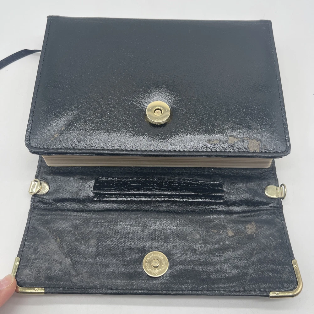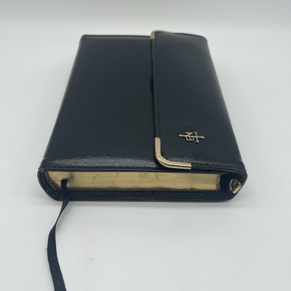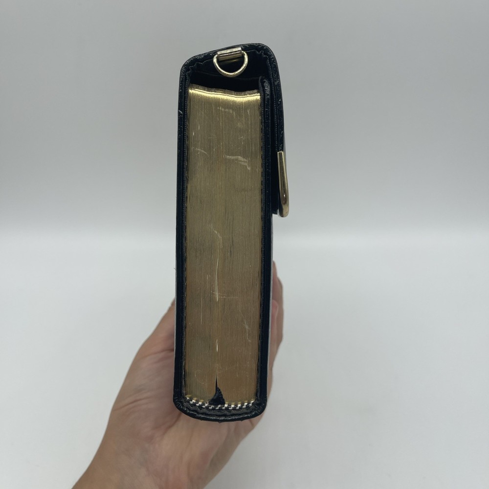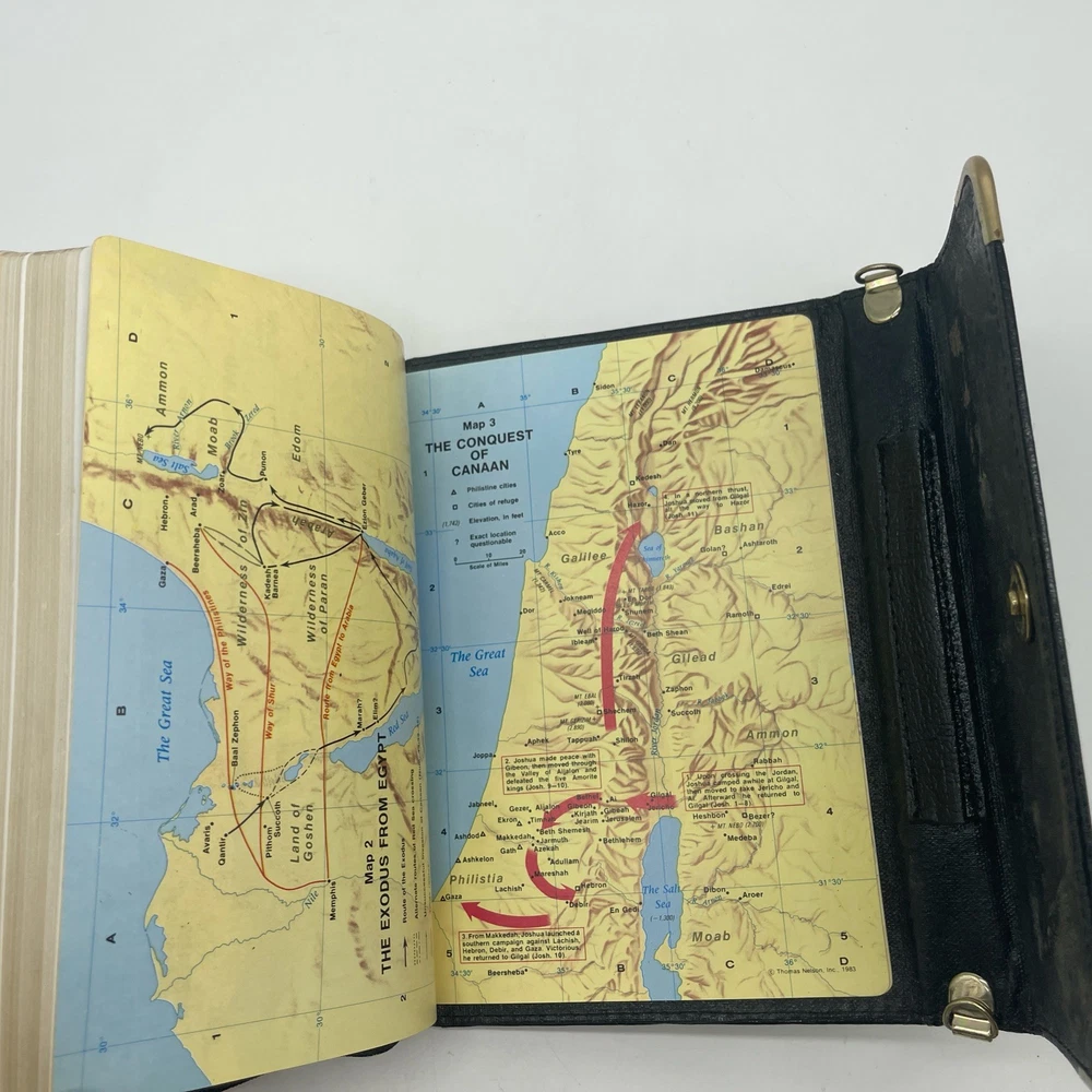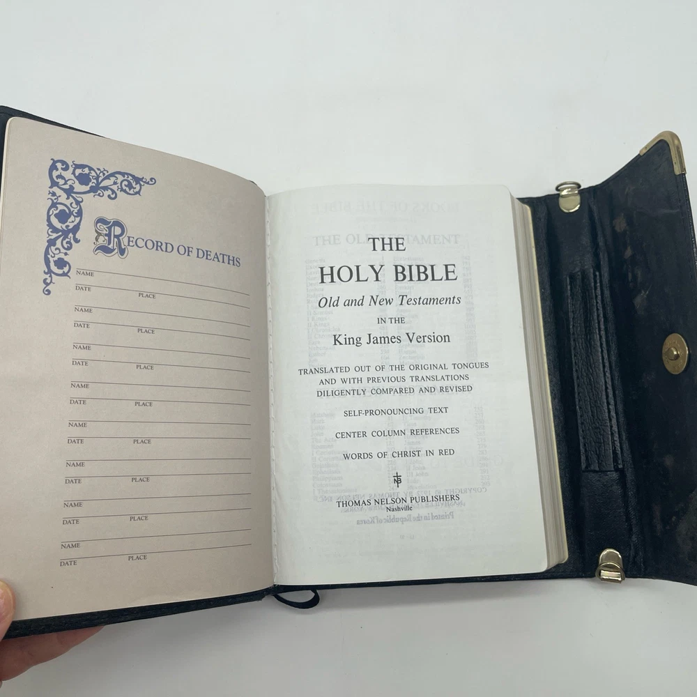 The product is a black bonded leather Holy Bible with a snap flap closure, featuring maps and published by Thomas Nelson in Korea in 1972. This Bible is a red letter edition in English, with center column references, making it a special and collectible item for those interested in Christianity and religious texts. When you open the Bible, you can see signs of wear of the front cover, see pictures!