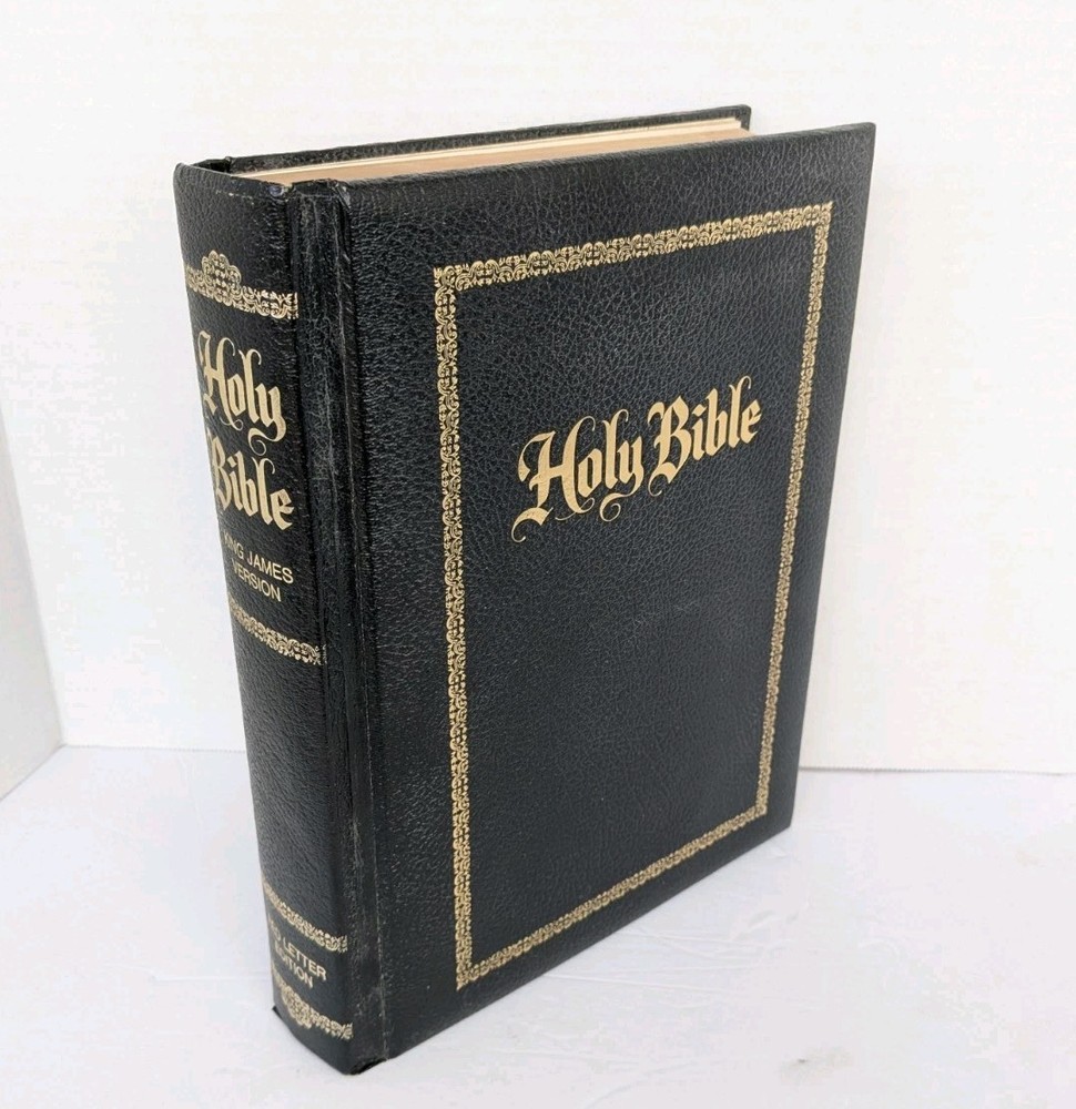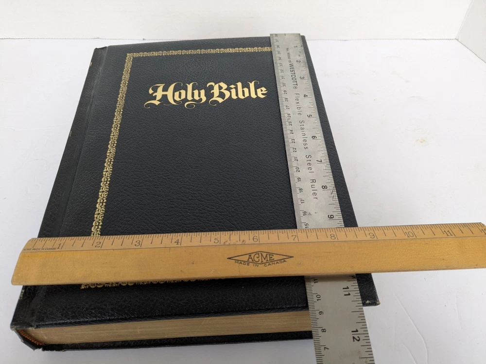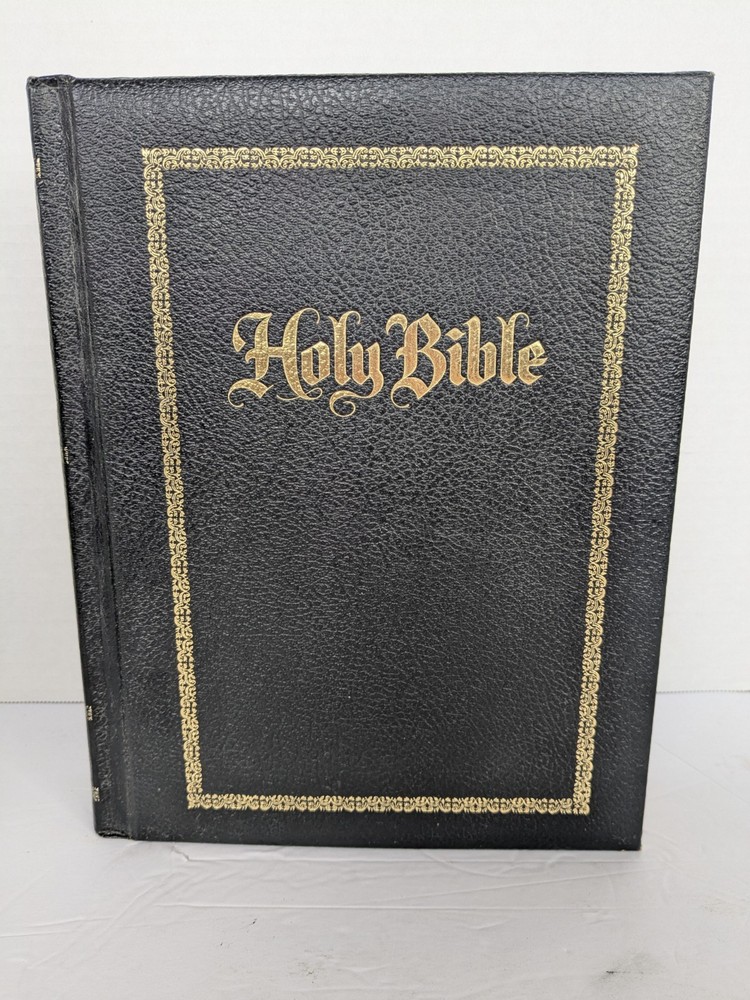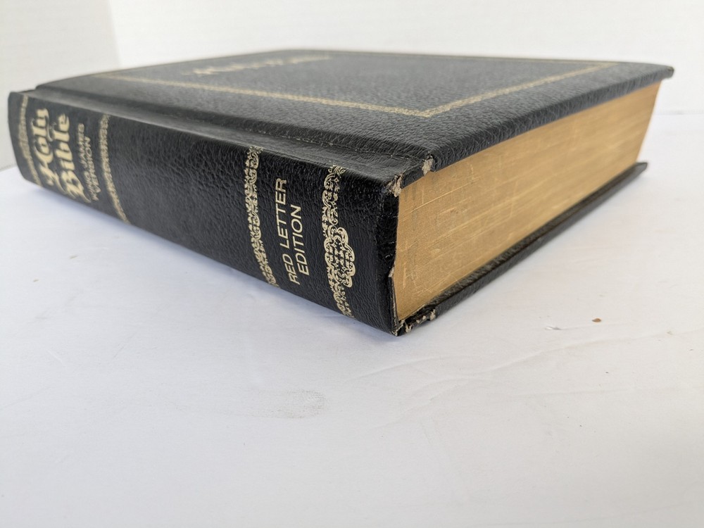 This vintage King James Version Holy Bible contains all original pages, color illustrations, concordance, red letters, maps, and a Bible dictionary. The Bible is overall in good condition. There are some signs of wear on the edges of the pages and corners of the cover. Also, many of the family pages have been filled out by the original owner. Please see photos prior to purchase to see the condition. This is a heavy Bible that provides everything you need for a classic immersive reading experience. Thanks for your interest.