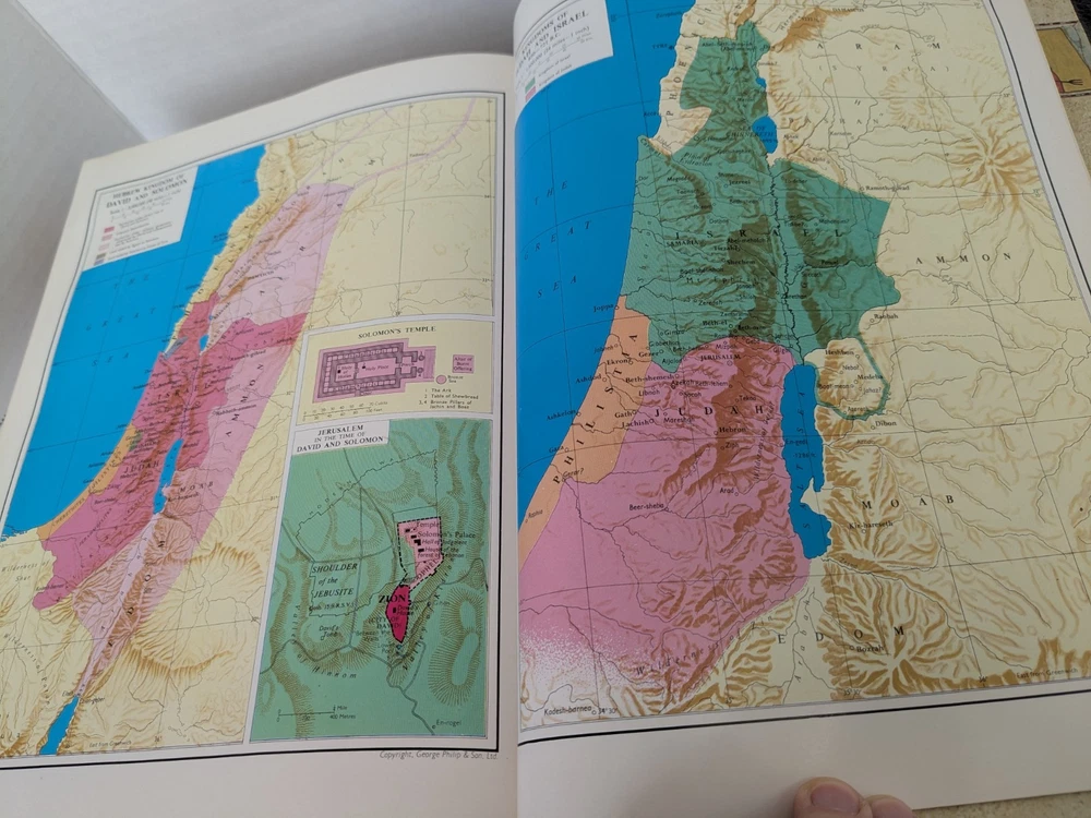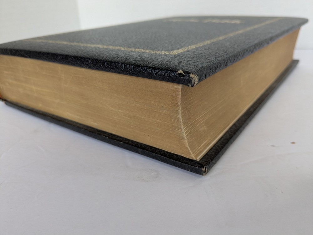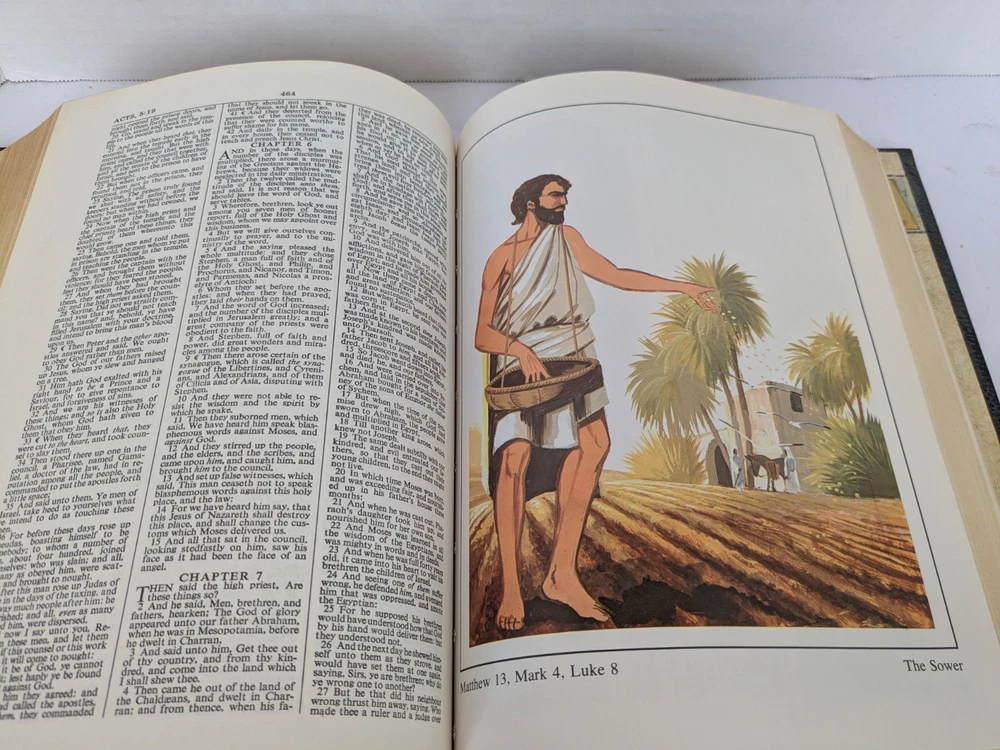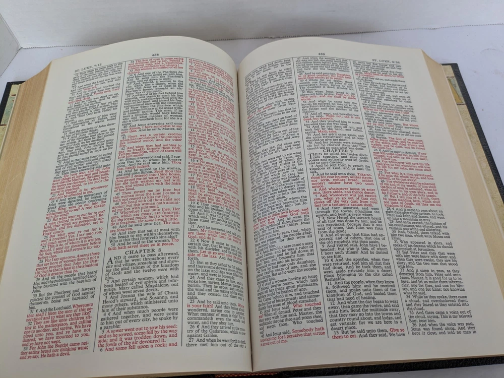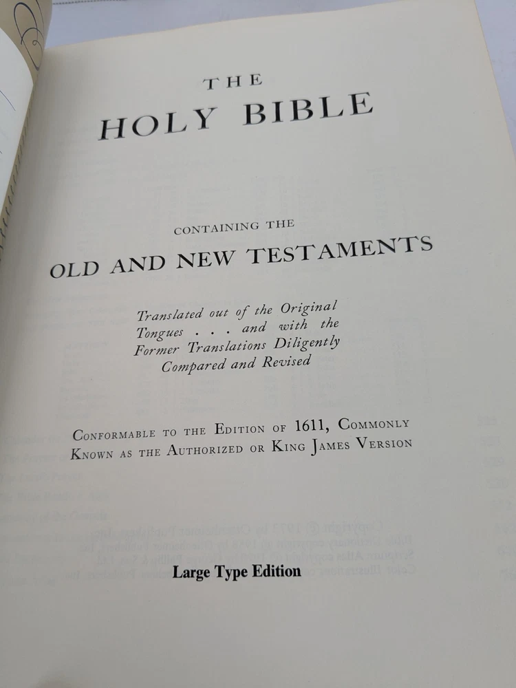 This vintage King James Version Holy Bible contains all original pages, color illustrations, concordance, red letters, maps, and a Bible dictionary. The Bible is overall in good condition. There are some signs of wear on the edges of the pages and corners of the cover. Also, many of the family pages have been filled out by the original owner. Please see photos prior to purchase to see the condition. This is a heavy Bible that provides everything you need for a classic immersive reading experience. Thanks for your interest.