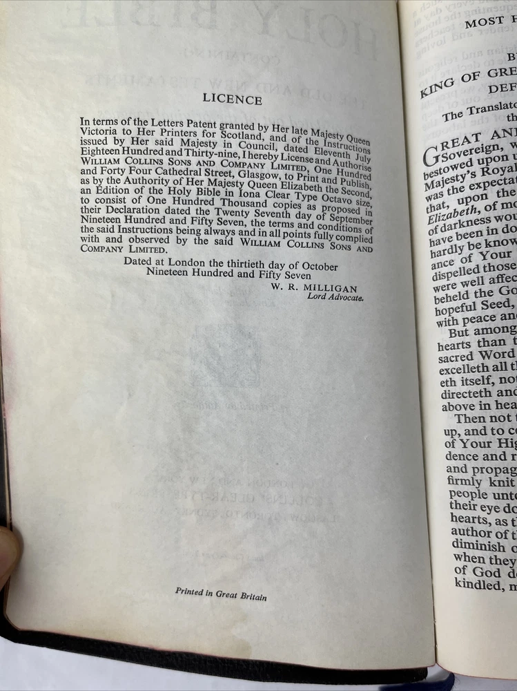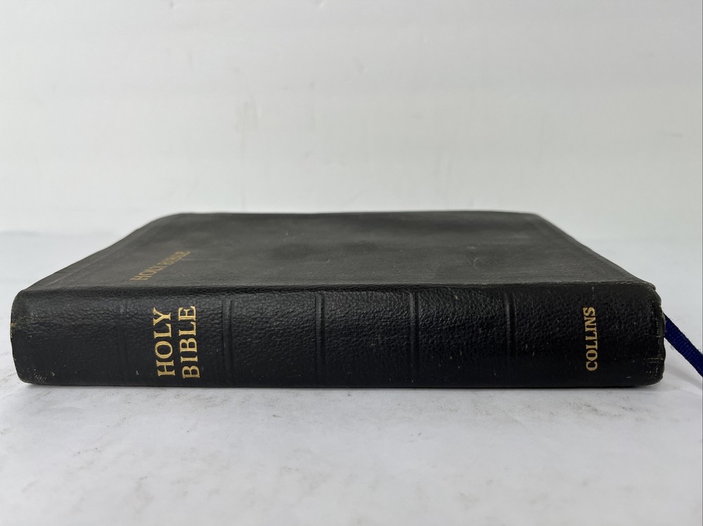 Holy Bible KJV Collins Clear Type Press Printed in Great Britain Leather 1957 Acceptable Condition -- book has some wear, some water damage but it does not affect the useability/readability, clean copy/no markings on the inside (see pics) *Item will be protected well for shipping and comes with a tracking number for confirmation.* I ship out items every day so expect a quick delivery!
