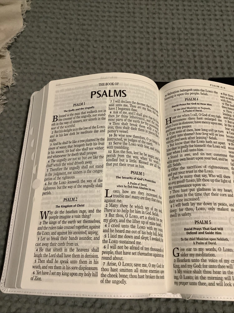 The White Full Grain Leather Full-size Giant Print King James Version Bible with Thumb Index , with its symbolic representation of purity, beautifully complements the time-honored tradition of the White Bible Ceremony, an old southern tradition. This exquisite Bible serves as an ideal centerpiece, lending significance and reverence to the occasion at hand. Visit Storefront Contact Us View Feedback About Our Company KJV Holy Bible, Giant Print Full-size Premium Full Grain Leather Red Letter Edition - Thumb Index & Ribbon Marker, King James Version, White Item Details The White Full Grain Leather Full-size Giant Print King James Version Bible with Thumb Index , with its symbolic representation of purity, beautifully complements the time-honored tradition of the White Bible Ceremony, an old southern tradition. This exquisite Bible serves as an ideal centerpiece, lending significance and reverence to the occasion at hand. The White Full Grain Leather Full-size Giant Print King James Version Bible with Thumb Index , with its symbolic representation of purity, beautifully complements the time-honored tradition of the White Bible Ceremony, an old southern tradition. This exquisite Bible serves as an ideal centerpiece, lending significance and reverence to the occasion at hand. The elegant white leather Bible exudes a timeless charm with its understated design. The smooth white leather is a picture of simplicity and grace, while the silver-foiled title and version reference, paired with raised spine ribs, add a sophisticated touch to the overall simple design. HOLY BIBLE KING JAMES VERSION The Bible features a white satin ribbon as a convenient page marker, while black thumb indexing tabs ensure easy navigation to specific books. The addition of shimmery, gilt-edged pages further enhances the Bible's beauty and adds a touch of luster. With a Smyth-sewn flexcover, the Bible opens flat without harming the spine. The full-size Bible is designed to be slightly larger than a standard Bible to accommodate the 14-point giant font. This larger text size enables comfortable reading even from a distance when the Bible is placed on a pulpit or table. It contains valuable study resources, including double-column formatting, a thematic Scripture verse finder that organizes key verses by topic, and 8 full-color maps that create visual context for the places named in the Bible. In addition, the words of Christ are printed in red ink, highlighting their significance. For those seeking a structured approach to their Bible reading, a thoughtfully included one-year Bible reading plan at the back of the Bible guides reading through the Bible in a year. The Bible is elegantly packaged in a full-color printed cardstock sleeve to protect it. This Bible features the original 1769 English text, thoughtfully supplemented with reader-friendly subheadings. It is worth mentioning that readers should expect to come across slight variations in spelling and language usage, distinct from modern English. Such differences contribute to the historical authenticity of the text, adding a unique charm and character to the reading experience. Make the presentation page of this White Full Grain Leather Full-size Giant Print King James Version Bible with Thumb Index truly special by inscribing it with a heartfelt message. This thoughtful gesture will celebrate the happy couple and infuse the gift with spiritual significance, turning it into a cherished heirloom that can be passed down through generations. Silver-foiled spine title and version reference White full grain leather Flexcover Classic King James Version Full-size Bible Thumb indexing tabs Satin ribbon marker 1402 gilt-edged pages Presentation page Lay-flat Smyth-sewn binding Reader-friendly subheadings Double-column format Words of Christ in red Thematic Scripture verse finder One-year Bible reading plan 8 full-color maps Giant print 14-point type Packaged in full-color printed cardstock sleeve Size: 9.7" x 6.7" x 1.5" (246 x 170 x 38mm) Return Policy To ensure complete satisfaction of our customers, we offer a 30 day return policy for all orders. Please reach out to us if you have any questions and one of our friendly customer service representatives will reply within 24 hours. This excludes weekends and holidays. Shipping Information All orders are fulfilled and shipped within 1-2 business days excluding holidays and will be shipped via standard economy shipping. Please do not hesitate to reach out with any questions. Please Note: Our hours of operation are Monday-Friday, 8am-5pm (CST). All orders received before 2pm (CST) will be processed & shipped within 1-2 business days.* Average transit times are 2-7 business days to the contiguous 48 United States and the District of Columbia. (*Does not apply to holidays or special orders.) Shop Our Storefront | View Feedback | Contact Us | Add Us to Your Favorites