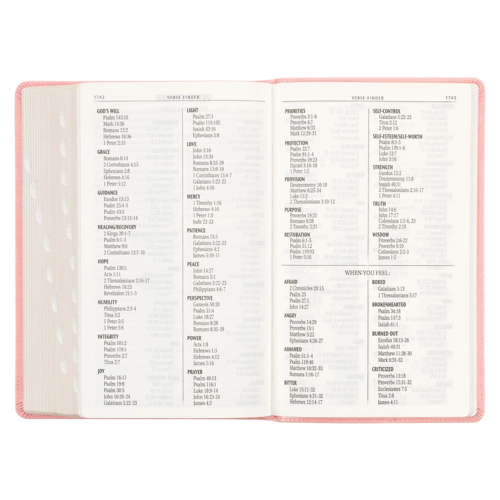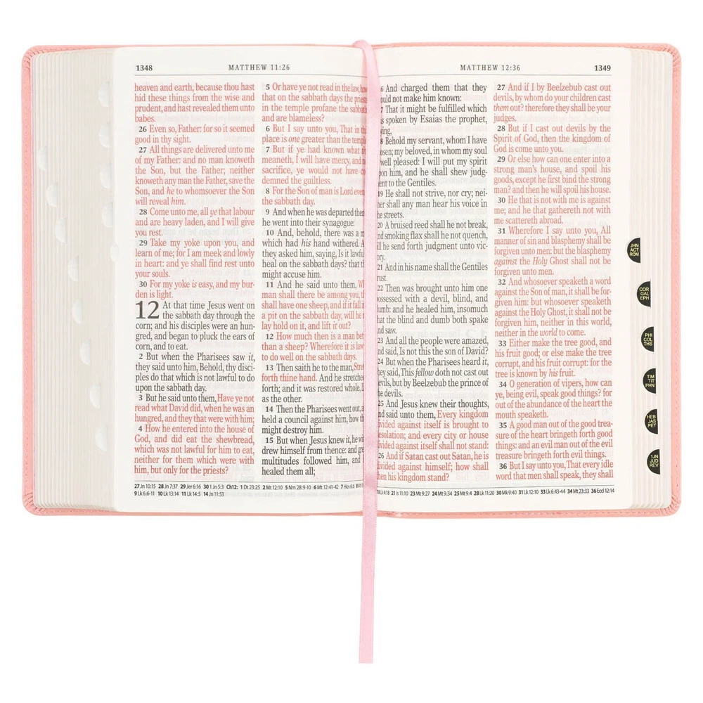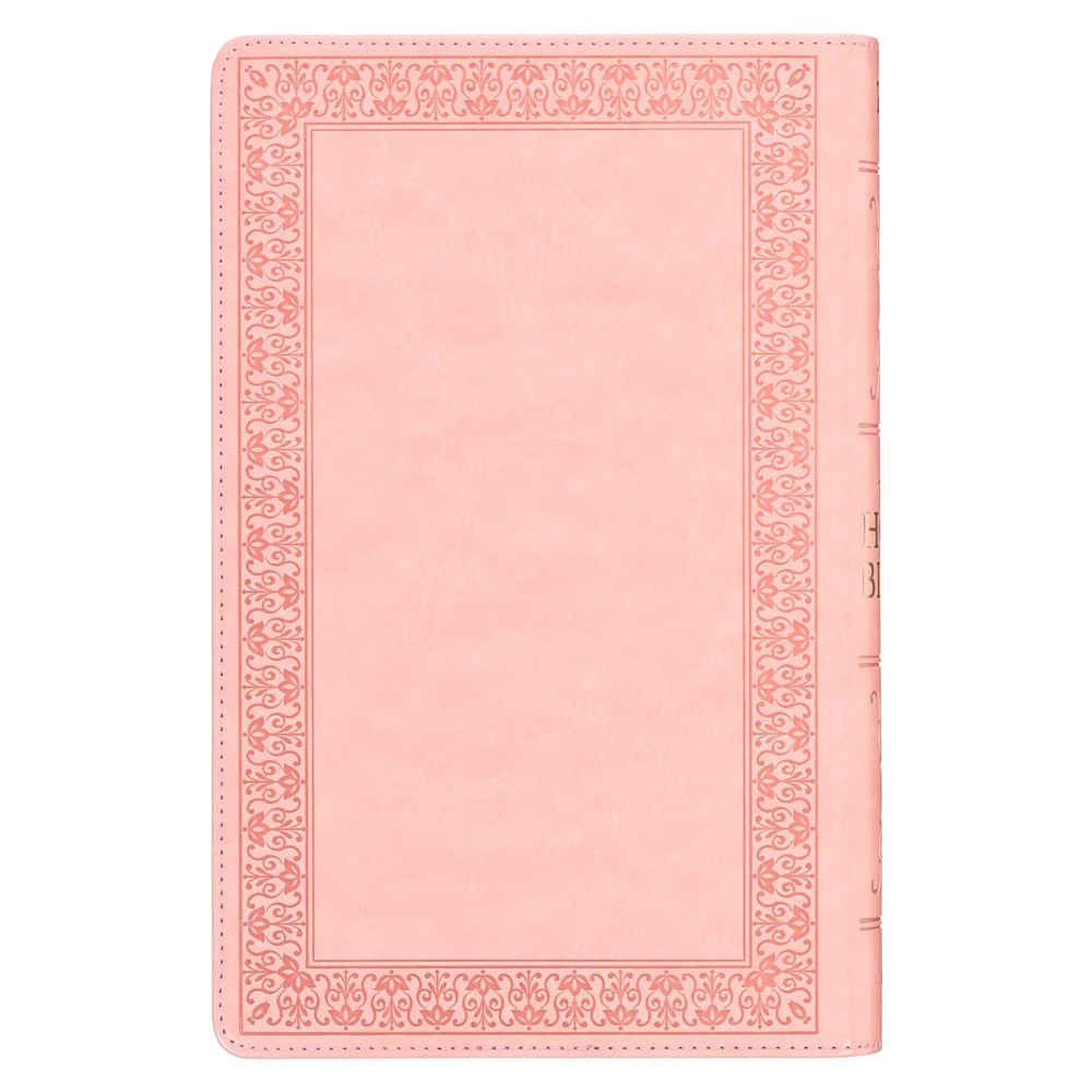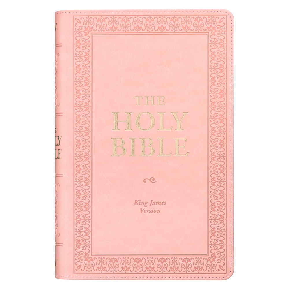 The Sunrise Pink Faux Leather Giant Print Standard-size King James Version Bible with Thumb Index is thoughtfully tailored to meet the needs of older women with imperfect eyesight. Its combination of large, easy-to-read text and an appealing cover makes it a delightful choice, guaranteeing a comfortable and enjoyable reading experience. Visit Storefront Contact Us View Feedback About Our Company KJV Holy Bible, Giant Print Standard Size Faux Leather Red Letter Edition - Ribbon Marker, King James Version, Sunrise Pink Item Details The Sunrise Pink Faux Leather Giant Print Standard-size King James Version Bible with Thumb Index is thoughtfully tailored to meet the needs of older women with imperfect eyesight. Its combination of large, easy-to-read text and an appealing cover makes it a delightful choice, guaranteeing a comfortable and enjoyable reading experience. The Sunrise Pink Faux Leather Giant Print Standard-size King James Version Bible with Thumb Index is thoughtfully tailored to meet the needs of older women with imperfect eyesight. Its combination of large, easy-to-read text and an appealing cover makes it a delightful choice, guaranteeing a comfortable and enjoyable reading experience. The sunrise pink faux leather cover is adorned with an exquisite ornate heat-debossed floral frame that gracefully edges both the front and back covers. Within this pretty frame, the title of the Bible is prominently displayed in large, elegantly rose gold-foiled letters accompanied by a heat-debossed title reference positioned just below. The Holy Bible King James Version On the spine, you'll discover two sets of heat-debossed faux spine ribs gracefully framing enchanting scrollwork motifs, adding an extra touch of elegance to the overall design. The Bible's smooth faux leather cover boasts reinforced topstitched edges, not only lending it a polished appearance but also enhancing its durability. To further safeguard against wear, tear, and moisture, the page edges are delicately gilt-edged with a soft shimmery rose gold finish. With an easy-to-read text, printed in a legible 14-point font and thoughtfully arranged in a double-column format, the Bible ensures a comfortable reading experience. Navigating its pages is made effortless with practical tools like an attached satin ribbon marker for bookmarking, thumb indexing for quick referencing, and a thematic Scripture verse finder. Moreover, for those desiring additional resources, this Bible offers valuable features such as a concordance, the words of Christ highlighted in red ink, cross-referencing, and the inclusion of eight vibrant full-color maps. The Bible offers a lovely presentation page at the front, providing an opportunity to add a personal touch and make it an ideal gift. Additionally, a thoughtful one-year Bible reading plan is included at the back, ensuring a meaningful and organized journey through its pages. This edition preserves the timeless beauty of the original KJV Bible's poetic language. The text of the KJV has stood firm for over 400 years, renowned for its unwavering accuracy. As you delve into this edition, you'll experience the richness of its heritage reflected in its unique spelling and grammatical structure, which may differ from modern usage. The Sunrise Pink Faux Leather Giant Print Standard-size King James Version Bible with Thumb Index is a perfect choice for grandmothers or mothers who may be experiencing difficulties with their eyesight. With its large print and attractive design, reading from the Sunrise Pink Faux Leather Giant Print Standard-size King James Version Bible with Thumb Index will be a delightful and effortless experience for her. Heat-debossed floral border cover design Sunrise pink faux leather cover Flexcover Rose gold-foiled title Heat-debossed version reference Classic King James Version Standard size Thumb index 1802 gilt-edged pages Lay-flat spine Satin ribbon marker Double-column format Words of Christ in red ink Thematic Scripture verse finder One-year Bible reading plan Concordance Cross-referencing 8 full-color maps Presentation page Giant print 14-point type Packaged in a full-color cardstock sleeve Size: 8.9" x 5.7" x 1.7" (226 x 145 x 43mm) Return Policy To ensure complete satisfaction of our customers, we offer a 30 day return policy for all orders. Please reach out to us if you have any questions and one of our friendly customer service representatives will reply within 24 hours. This excludes weekends and holidays. Shipping Information All orders are fulfilled and shipped within 1-2 business days excluding holidays and will be shipped via standard economy shipping. Please do not hesitate to reach out with any questions. Please Note: Our hours of operation are Monday-Friday, 8am-5pm (CST). All orders received before 2pm (CST) will be processed & shipped within 1-2 business days.* Average transit times are 2-7 business days to the contiguous 48 United States and the District of Columbia. (*Does not apply to holidays or special orders.) Shop Our Storefront | View Feedback | Contact Us | Add Us to Your Favorites