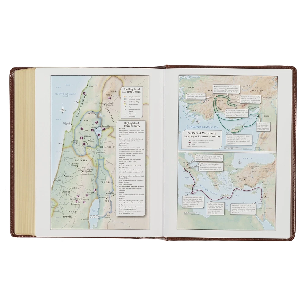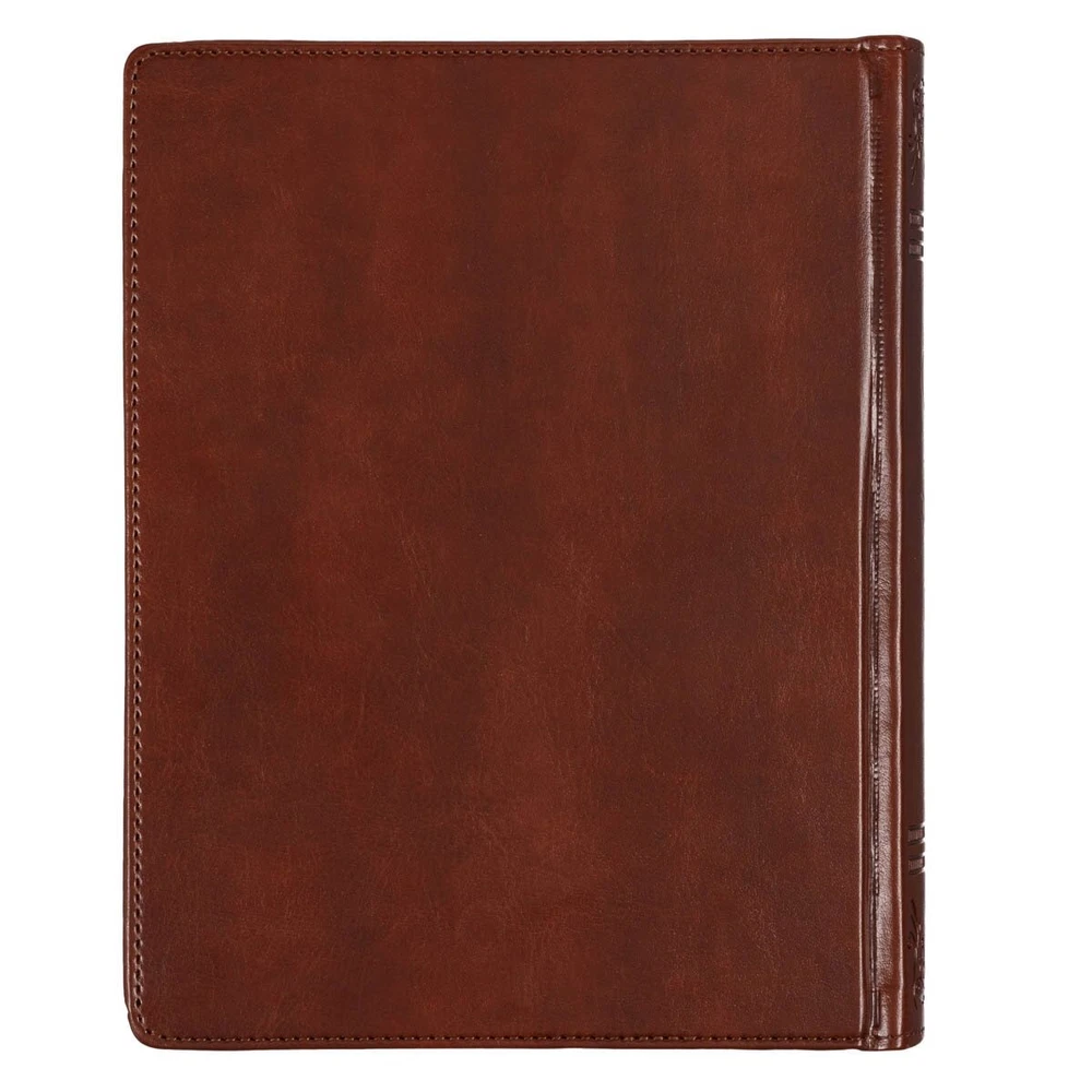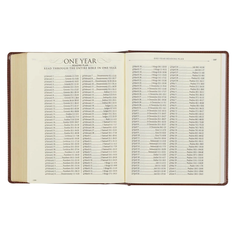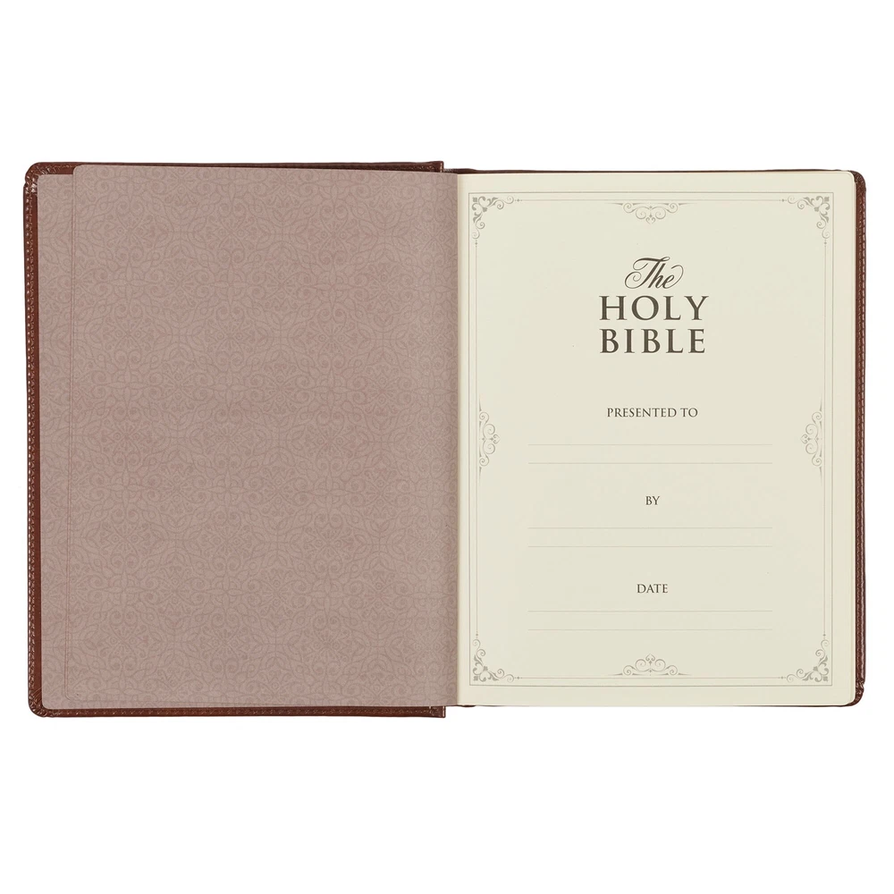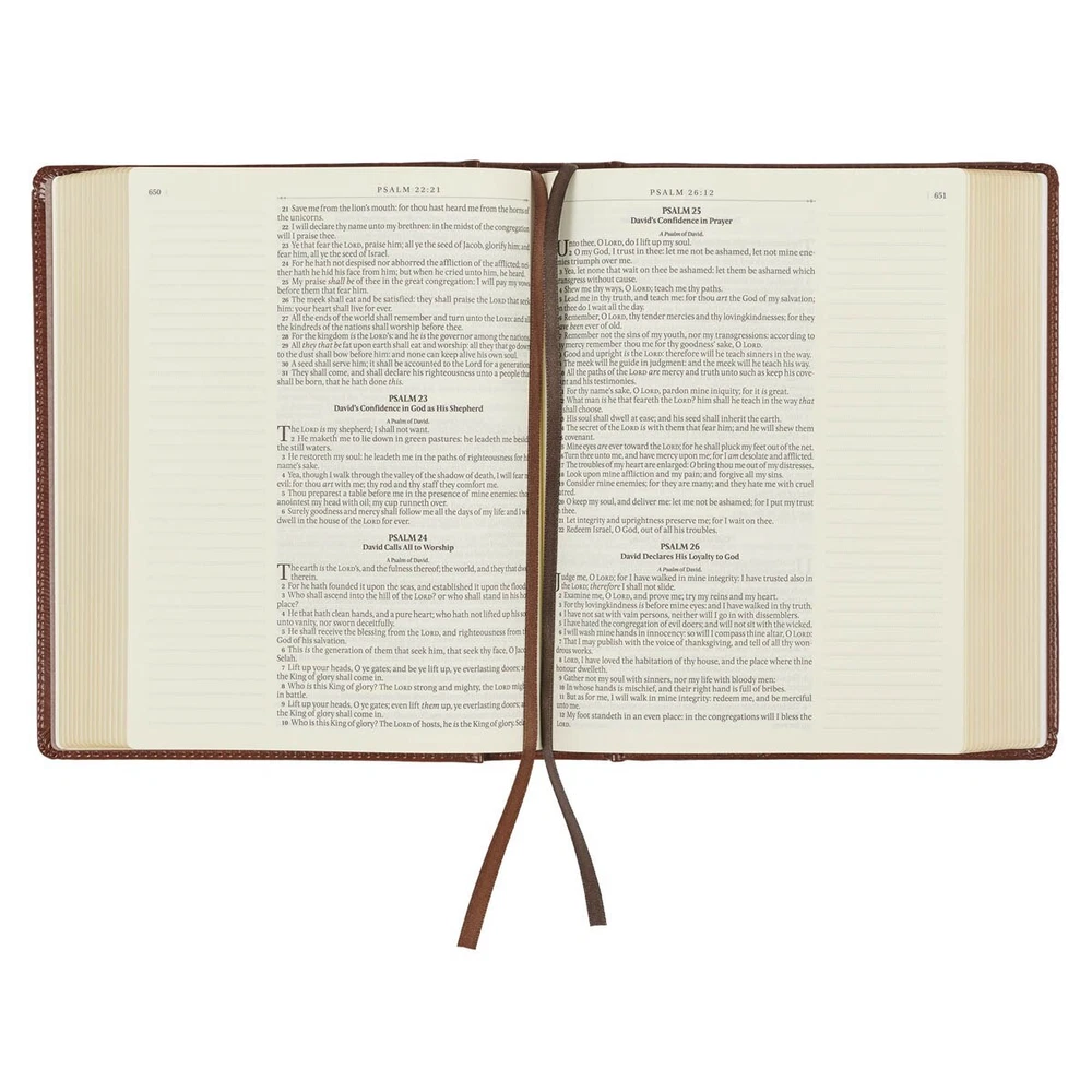 Unlock a deeper understanding of the text when you take notes in the Saddle Tan Faux Leather Hardcover King James Version Note-taking Bible . With your personalized notes at your fingertips, you'll always have valuable insights to draw upon. Visit Storefront Contact Us View Feedback About Our Company KJV Holy Bible, Note-taking Bible, Faux Leather Hardcover King James Version, Saddle Tan Item Details Unlock a deeper understanding of the text when you take notes in the Saddle Tan Faux Leather Hardcover King James Version Note-taking Bible . With your personalized notes at your fingertips, you'll always have valuable insights to draw upon. Unlock a deeper understanding of the text when you take notes in the Saddle Tan Faux Leather Hardcover King James Version Note-taking Bible . With your personalized notes at your fingertips, you'll always have valuable insights to draw upon. The hardcover Bible exudes elegance with its luxurious saddle tan faux leather cover, adorned with a beautifully heat-debossed diamond and square frame design. Heat-debossed floral flourishes soften the frames and add a feminine touch. The sentiment, presented in an informal script, is gracefully foiled in rose gold, adding a touch of sophistication and charm. Holy Bible King James Version Heat-debossed faux spine ribs are accompanied by elegant heat-debossed flourishes flanking the rose gold-foiled title on the spine. The version reference is displayed in heat-debossed letters at the top of the spine. Gilt-edged pages and two brown satin ribbon markers complete the exterior design. Inside the Bible, you will find plenty of space for doodling, listing, or writing in the 1.6-inch lined margins. This Bible offers valuable study tools, such as a thematic Scripture verse finder to explore key themes, a concordance to trace recurring words, a one-year Bible reading plan to plan your study, and 8 full-color maps. The Epistle Dedicatory Letter is also thoughtfully included, serving as a reminder of the rich history behind the KJV edition. Record your insights within the pages of this Bible as you delve into God's Word. Share the joy of learning with your daughter or granddaughter by gifting her the Saddle Tan Faux Leather Hardcover King James Version Note-taking Bible on their birthday. Encourage her to create a lasting legacy by leaving her own reflections and wisdom for future generations. Heat-debossed diamond and square frame design accented with floral flourishes Saddle tan faux leather Hardcover Rose gold-foiled title King James Version Note-taking Bible Hardcover 1.6-inch lined margins 2-inch wide overall margins 1450 pages One-color interior 2 ribbon markers Thematic verse finder One-year reading plan Concordance Epistle Dedicatory letter 8 full-color maps 8.65 point type Size: 8.2" x 6.5" x 2" (208 x 165 x 51mm) Return Policy To ensure complete satisfaction of our customers, we offer a 30 day return policy for all orders. Please reach out to us if you have any questions and one of our friendly customer service representatives will reply within 24 hours. This excludes weekends and holidays. Shipping Information All orders are fulfilled and shipped within 1-2 business days excluding holidays and will be shipped via standard economy shipping. Please do not hesitate to reach out with any questions. Please Note: Our hours of operation are Monday-Friday, 8am-5pm (CST). All orders received before 2pm (CST) will be processed & shipped within 1-2 business days.* Average transit times are 2-7 business days to the contiguous 48 United States and the District of Columbia. (*Does not apply to holidays or special orders.) Shop Our Storefront | View Feedback | Contact Us | Add Us to Your Favorites