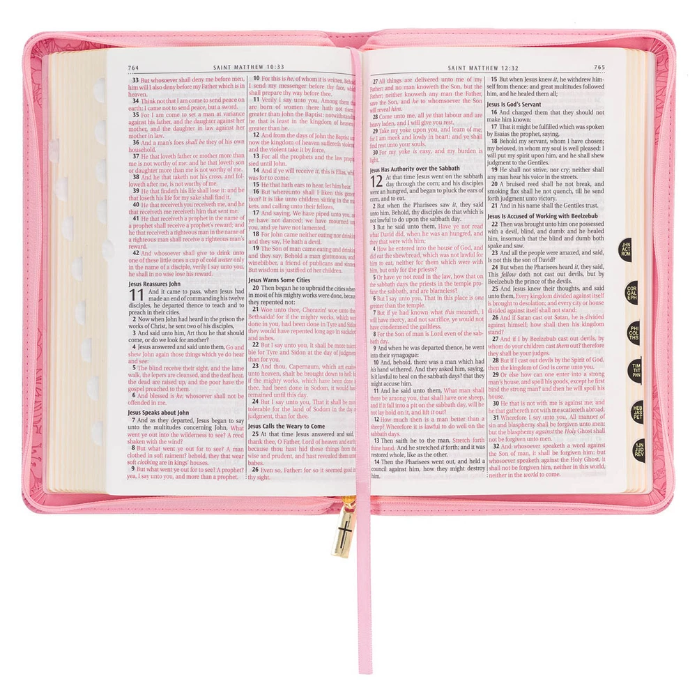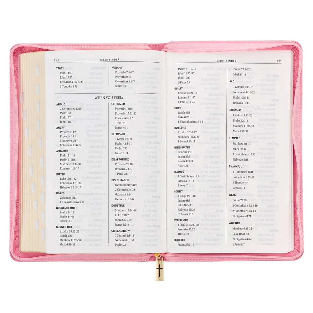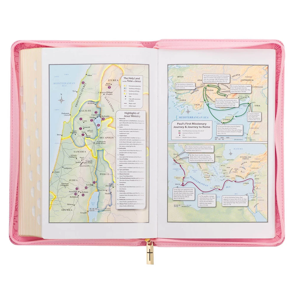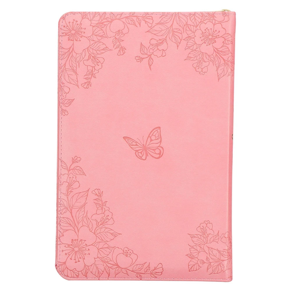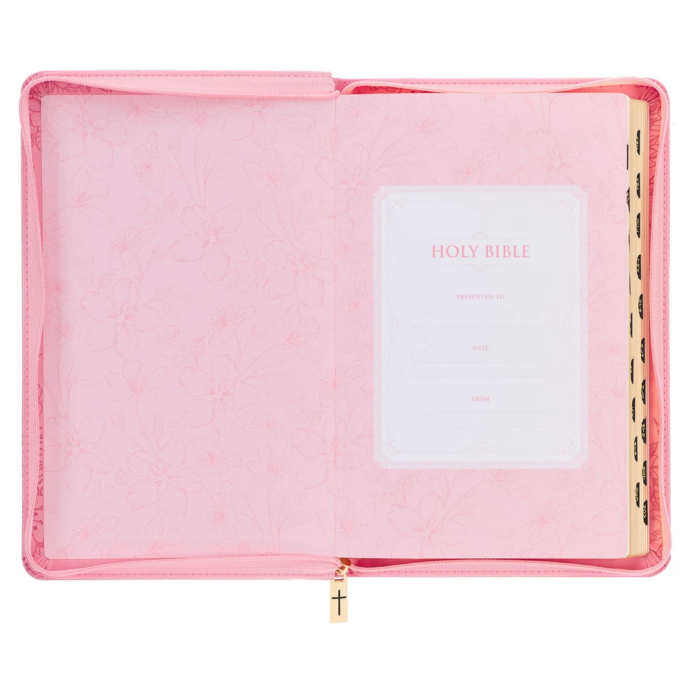 The lovely design of the Blossom Pink Faux Leather King James Version Deluxe Gift Bible with Thumb Index and Zippered Closure perfectly complements the beautiful poetic language of the KJV translation. This Bible is adorned with numerous luxurious features, making it an excellent choice as a thoughtful gift for a young lady. Visit Storefront Contact Us View Feedback About Our Company KJV Holy Bible, Standard Size Faux Leather Red Letter Edition Thumb Index, Ribbon Marker, King James Version, Pink Floral Zipper Closure Item Details The lovely design of the Blossom Pink Faux Leather King James Version Deluxe Gift Bible with Thumb Index and Zippered Closure perfectly complements the beautiful poetic language of the KJV translation. This Bible is adorned with numerous luxurious features, making it an excellent choice as a thoughtful gift for a young lady. The lovely design of the Blossom Pink Faux Leather King James Version Deluxe Gift Bible with Thumb Index and Zippered Closure perfectly complements the beautiful poetic language of the KJV translation. This Bible is adorned with numerous luxurious features, making it an excellent choice as a thoughtful gift for a young lady. Heat-debossed flowers encircle the gold-foiled title and heat-debossed version reference on the front cover of this blossom pink faux leather Bible. HOLY BIBLE KING JAMES VERSION The floral border is repeated on the back cover, where it surrounds a single heat-debossed butterfly. A pink zipper is furnished with a gold metal zipper pull that is engraved with a cross. Further luxury features of this Bible include thumb indexing, a pink satin ribbon marker, and a lay-flat spine. To ensure its safe delivery, the Bible is thoughtfully protected by a cardboard sleeve, ensuring its security during shipping and handling. A presentation page in the front can be personalized when the Bible is given as a gift. Additionally, several helpful study features are included to guide your study. Most important is the highlighted words of Christ in red. The text is presented in a standard 9-point font, organized in a double-column format, and structured with reader-friendly sub-headings. 8 full-color maps, a thematic verse finder, and a one-year Bible reading plan complete the gift edition. This edition is a faithful preservation of the beautiful and poetic language found in the original KJV Bible. Even after 400 years, the accuracy of the KJV text remains widely recognized, showcasing its enduring legacy and distinct spelling and grammatical structure. This translation is a testament to its unique charm and rich heritage that continues to captivate readers. The Blossom Pink Faux Leather King James Version Deluxe Gift Bible with Thumb Index and Zippered Closure is a delightful choice to commemorate a daughter's baptism or confession of faith. Its exquisite design and thoughtful features make it a meaningful gift that she will cherish during this significant milestone in her life. Heat-debossed floral design Blossom-pink faux leather Gold-foiled title Heat-debossed version reference Gold-foiled spine title and heat-debossed version reference Classic King James Version text Deluxe Gift Bible Zippered closure Cross-engraved gold metal zipper pull Attached satin ribbon marker Gilt-edged pages Thumb index Flexcover Lay-flat spine Double-column format Reader-friendly subheadings Words of Christ in red ink Thematic Scripture verse finder One-year Bible reading plan 8 full-color maps Presentation page 1016 pages Text size: 9-point type Packaged in full-color printed cardboard sleeve Size: 9.1" x 6" x 1.1" (231 x 152 x 28 mm) Return Policy To ensure complete satisfaction of our customers, we offer a 30 day return policy for all orders. Please reach out to us if you have any questions and one of our friendly customer service representatives will reply within 24 hours. This excludes weekends and holidays. Shipping Information All orders are fulfilled and shipped within 1-2 business days excluding holidays and will be shipped via standard economy shipping. Please do not hesitate to reach out with any questions. Please Note: Our hours of operation are Monday-Friday, 8am-5pm (CST). All orders received before 2pm (CST) will be processed & shipped within 1-2 business days.* Average transit times are 2-7 business days to the contiguous 48 United States and the District of Columbia. (*Does not apply to holidays or special orders.) Shop Our Storefront | View Feedback | Contact Us | Add Us to Your Favorites