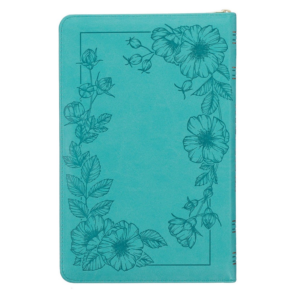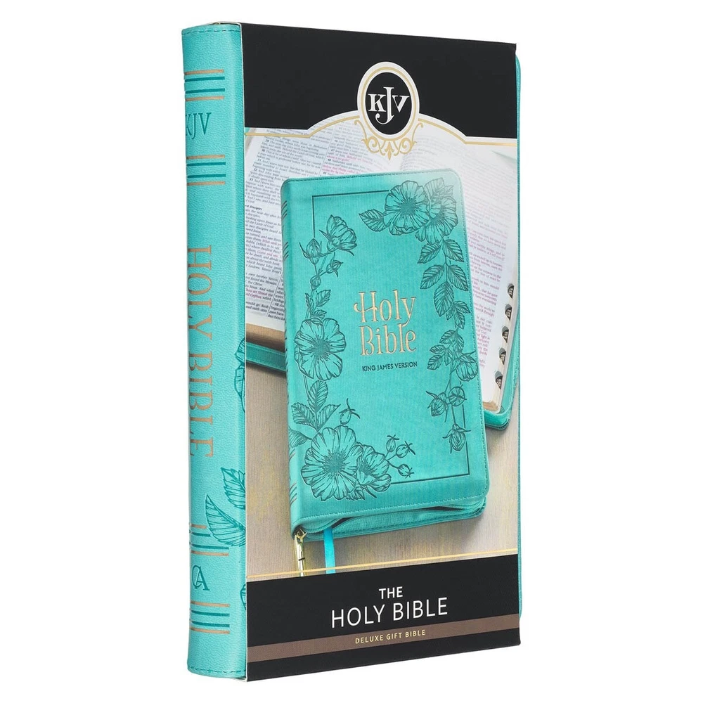 The Teal Faux Leather King James Version Deluxe Gift Bible with Thumb Index and Zippered Closure combines a contemporary color palette with a stunning floral design to create a unique Bible that is perfect for any teenage girl. Its appealing aesthetics and luxury features will make it a gift she will love and treasure for years to come. Visit Storefront Contact Us View Feedback About Our Company KJV Holy Bible, Standard Size Faux Leather Red Letter Edition Thumb Index, Ribbon Marker, King James Version, Teal Floral Zipper Closure Item Details The Teal Faux Leather King James Version Deluxe Gift Bible with Thumb Index and Zippered Closure combines a contemporary color palette with a stunning floral design to create a unique Bible that is perfect for any teenage girl. Its appealing aesthetics and luxury features will make it a gift she will love and treasure for years to come. The Teal Faux Leather King James Version Deluxe Gift Bible with Thumb Index and Zippered Closure combines a contemporary color palette with a stunning floral design to create a unique Bible that is perfect for any teenage girl. Its appealing aesthetics and luxury features will make it a gift she will love and treasure for years to come. This Bible's teal faux leather cover features large heat-debossed flowers carefully connected by a thin heat-debossed frame. The gold-foiled title is elegantly positioned in the center of the design, while the heat-debossed version reference is thoughtfully placed below it. HOLY BIBLE KING JAMES VERSION The floral design is repeated on the back cover, and the title is elegantly replicated on the spine using gold foil. In addition, the version reference is also repeated in heat-debossed letters on the spine. A teal zipper with a gold-metal cross-engraves zipper pull keeps the covers securely closed and protects pages from being crumpled. The Bible features gilt-edged pages with thumb indexing, allowing easy navigation and finding your place within the text. A teal satin ribbon page marker is included to ensure you can effortlessly save your progress. Inside, you'll discover reader-friendly subheadings, a well-organized double-column format, and text printed in a standard 9-point font. A stand-out feature of this Bible is the words Christ that are highlighted in red. The Bible also offers a helpful Scripture verse finder, 8 full-color maps for geographical context, and a one-year Bible reading plan to guide your study. These luxurious features make this Bible an exceptional gift choice, and a presentation page is included to mark a special occasion. For added protection, the Bible is carefully packaged in a full-color printed cardboard sleeve. This edition embraces the captivating and poetic language found in the original 1769 KJV Bible. Over the course of 400 years, the KJV text has earned its reputation as one of the most precise translations, standing the test of time. As you delve into this edition, you will encounter the profound legacy of the KJV, evident in its distinct spelling and grammatical structure that distinguishes it from modern usage. It serves as a testament to this timeless translation's enduring influence and distinct linguistic charm. The Teal Faux Leather King, James Version Deluxe Gift Bible with Thumb Index and Zippered Closure will be the crowning glory of a teenage girl's spiritual toolbox and makes an excellent gift to celebrate significant milestones such as an important birthday or a significant event like a baptism. Heat-debossed floral design Teal faux leather Gold-foiled title Heat-debossed version reference Gold-foiled spine title and heat-debossed version reference Classic King James Version text Deluxe Gift Bible Zippered closure Cross-engraved gold metal zipper pull Attached satin ribbon marker Gilt-edged pages Thumb index Flexcover Lay-flat spine Double-column format Reader-friendly subheadings Words of Christ in red ink Thematic Scripture verse finder One-year Bible reading plan 8 full-color maps Presentation page 1016 pages Text size: 9-point type Packaged in full-color printed cardboard sleeve Size: 9.1" x 6" x 1.1" (231 x 152 x 28 mm) Return Policy To ensure complete satisfaction of our customers, we offer a 30 day return policy for all orders. Please reach out to us if you have any questions and one of our friendly customer service representatives will reply within 24 hours. This excludes weekends and holidays. Shipping Information All orders are fulfilled and shipped within 1-2 business days excluding holidays and will be shipped via standard economy shipping. Please do not hesitate to reach out with any questions. Please Note: Our hours of operation are Monday-Friday, 8am-5pm (CST). All orders received before 2pm (CST) will be processed & shipped within 1-2 business days.* Average transit times are 2-7 business days to the contiguous 48 United States and the District of Columbia. (*Does not apply to holidays or special orders.) Shop Our Storefront | View Feedback | Contact Us | Add Us to Your Favorites