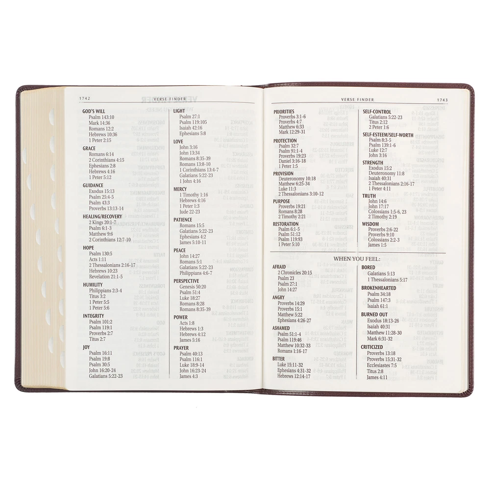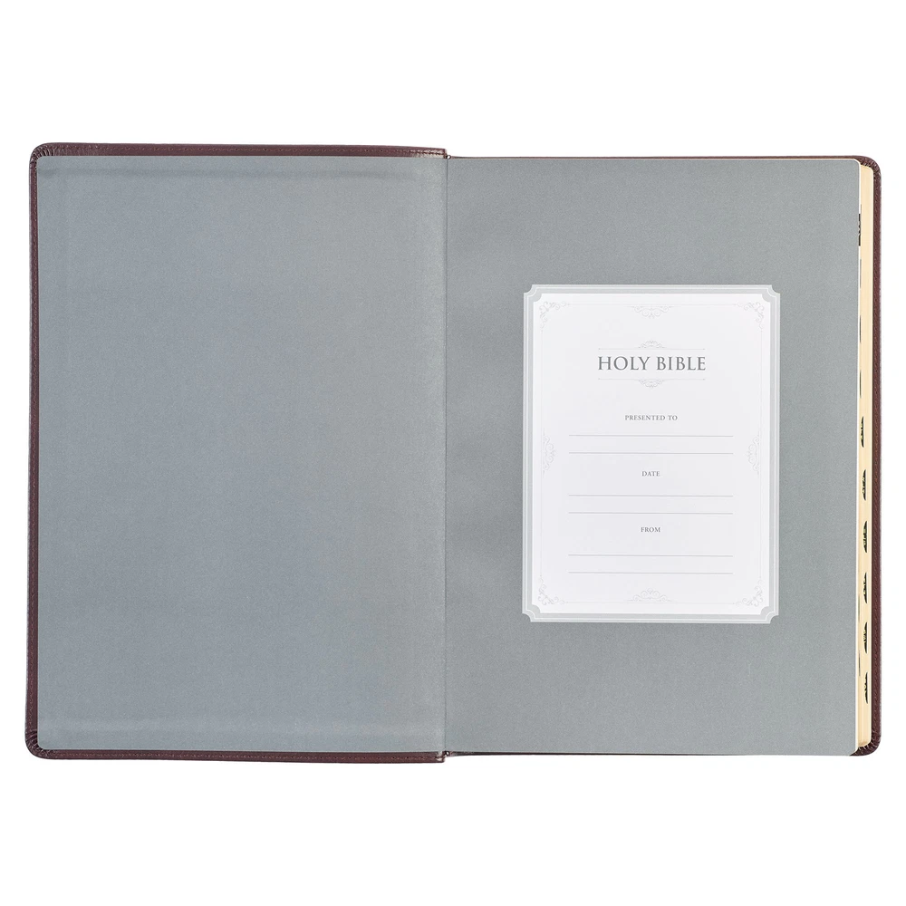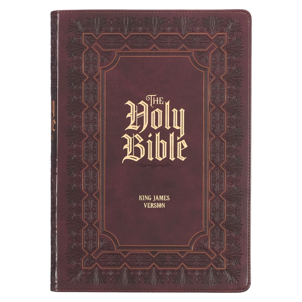 Elevate your mother or grandmother's Bible study experience with the magnificent Framed Burgundy Faux Leather Super Giant Print King James Version Bible . This luxury giant print Bible with its exquisite gold-foiled cover design makes it a perfect companion for her personal Bible study sessions. Visit Storefront Contact Us View Feedback About Our Company KJV Holy Bible, Super Giant Print Faux Leather Red Letter Edition - Ribbon Marker, King James Version, Burgundy Item Details Elevate your mother or grandmother's Bible study experience with the magnificent Framed Burgundy Faux Leather Super Giant Print King James Version Bible . This luxury giant print Bible with its exquisite gold-foiled cover design makes it a perfect companion for her personal Bible study sessions. Elevate your mother or grandmother's Bible study experience with the magnificent Framed Burgundy Faux Leather Super Giant Print King James Version Bible . This luxury super giant print Bible, with its exquisite gold-foiled cover design, makes it a perfect companion for her personal Bible study sessions. The super giant print Bible features smooth front and back faux leather covers adorned with exquisite gold-foiled frames. The design is further enhanced with Greek-themed heat-debossed fern and scroll work, lending a captivating depth to its appearance. The front cover showcases a gold-foiled title presented in a stylish Old English font, complemented by a heat-debossed design and the version reference. HOLY BIBLE KING JAMES VERSION The spine of this Bible is adorned with additional heat-debossed Greek-themed fern and scroll designs, interspersed with four sets of gold-foiled faux spine ribs. The title is also elegantly presented in gold-foiled letters, adding a touch of sophistication to this remarkable book. The page edges are gilt-edged, and a convenient thumb index and a satin ribbon marker are included to aid in easy navigation and to save your spot within the Bible. With a Smyth-sewn lay-flat spine, the Bible binding is protected when opened, ensuring its durability over time. To further safeguard against wear and tear, topstitching along the edges of the covers provides added reinforcement. This Bible is a valuable study tool. It features text in easy-to-read giant print, 17-point type arranged in a double-column format. It offers a comprehensive range of study features, including a footnote cross-reference guide, a concordance, and a thematic Scripture verse finder. With the words of Christ printed in red ink, eight full-color annotated biblical maps, and a one-year Bible reading plan, it provides additional resources for in-depth study. It's important to note that this Bible utilizes the original 1769 English text, which may present subtle variations in spelling and language usage compared to modern English. However, this uniqueness adds to its authenticity and historical value. The front of this super giant print Bible features a presentation page, providing the perfect opportunity to personalize it with a heartfelt and encouraging message when presenting it as a gift. This thoughtful addition allows you to make the Bible even more meaningful and memorable for the recipient. For optimal protection, the Framed Burgundy Faux Leather Super Giant Print King James Version Bible with Thumb Index is thoughtfully packaged in a sturdy box with a hinged lid. This ensures that the Bible remains secure and well-preserved during storage and transportation. Celebrate a cherished milestone with the gift of a Bible, and make this Christmas extra special for your grandmother with the Framed Burgundy Faux Leather Super Giant Print King James Version Bible with Thumb Index . Its exquisite design and thoughtful features make it an ideal gift choice, symbolizing love, faith, and the joy of the holiday season. Burgundy cover with heat-debossed Greek-themed designs and gold-foiled frames Burgundy faux leather Flexcover Classic King James Version 1769 Oxford Standardized Revision of the 1611 King James Bible Full-size Bible Gold-foiled titles Thumb indexing tabs Satin ribbon marker 1804 gilt-edged pages Presentation page Epistle dedicatory letter included Lay-flat Smyth-sewn binding Double-column format Words of Christ in red Concordance Footnote cross-referencing Thematic Scripture verse finder One-year Bible reading plan 8 full-color maps Super giant print 17-point type Packaged in a full-color printed hinged gift box Size: 10.6" x 7.5" x 1.6" (269 x 191 x 41mm) Return Policy To ensure complete satisfaction of our customers, we offer a 30 day return policy for all orders. Please reach out to us if you have any questions and one of our friendly customer service representatives will reply within 24 hours. This excludes weekends and holidays. Shipping Information All orders are fulfilled and shipped within 1-2 business days excluding holidays and will be shipped via standard economy shipping. Please do not hesitate to reach out with any questions. Please Note: Our hours of operation are Monday-Friday, 8am-5pm (CST). All orders received before 2pm (CST) will be processed & shipped within 1-2 business days.* Average transit times are 2-7 business days to the contiguous 48 United States and the District of Columbia. (*Does not apply to holidays or special orders.) Shop Our Storefront | View Feedback | Contact Us | Add Us to Your Favorites
