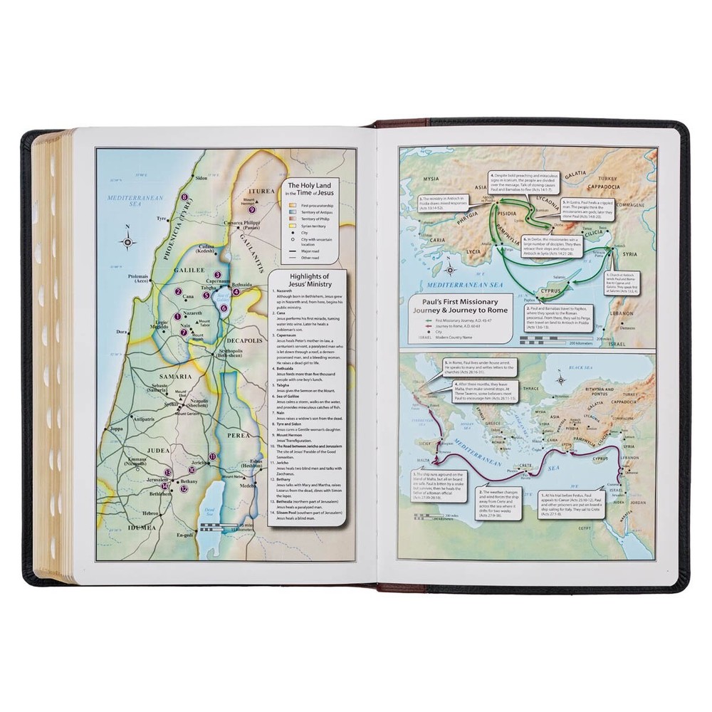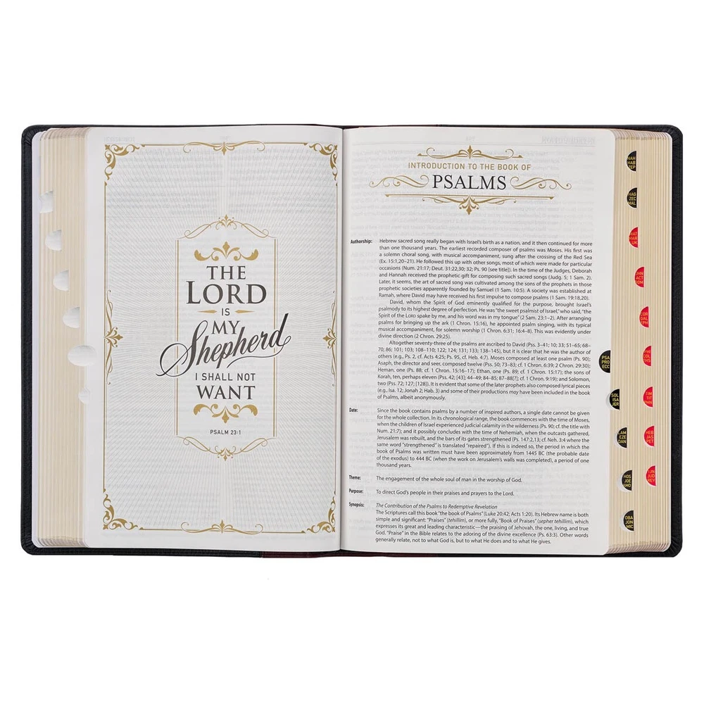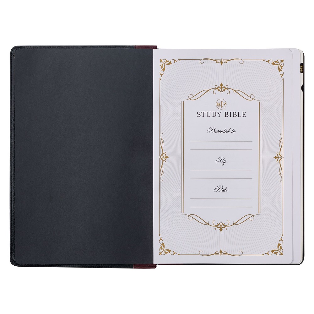 Strengthen the spiritual discipline of studying the Bible and family devotions when you use the Black and Burgundy Full Grain Leather Large Print King James Version Study Bible with Thumb Index . This updated study Bible features the timeless KJV text, accompanied by thousands of insightful study notes in an easily readable large print format. Visit Storefront Contact Us View Feedback About Our Company KJV Study Bible, Large Print King James Version Holy Bible, Thumb Tabs, Ribbons, Premium Full Grain Leather Black/Burgundy Debossed Item Details Strengthen the spiritual discipline of studying the Bible and family devotions when you use the Black and Burgundy Full Grain Leather Large Print King James Version Study Bible with Thumb Index . This updated study Bible features the timeless KJV text, accompanied by thousands of insightful study notes in an easily readable large print format. Strengthen the spiritual discipline of studying the Bible and family devotions when you use the Black and Burgundy Full Grain Leather Large Print King James Version Study Bible with Thumb Index . This updated study Bible features the timeless KJV text, accompanied by thousands of insightful study notes in an easily readable large print format. Crafted with finesse, the Bible's exterior showcases a seamless fusion of black full grain leather panels coupled with a burgundy full grain leather spine. The spine is tastefully adorned with a gold-foiled version reference, title, and embossed spine ribs, accentuated by gold-foiled bands. KJV Holy Bible Immaculate gilt-edged pages add an element of sophistication to the exterior design. The interior pages are printed in black ink, accented by striking metallic gold decorative accents. The Bible's robust construction ensures longevity and features like a lay-flat spine, dual satin ribbon markers, and a thumb index add to its practicality. Its double-column formatted text is presented in an accessible 11-point type. The Bible further serves as a significant memory keeper. It includes a customizable presentation page, a wedding certificate, and a comprehensive family record section for marriages, births, adoptions, and deaths. An additional page is dedicated to noteworthy occasions, creating a holistic record-keeping experience. An in-depth section is dedicated to the history of the KJV, shedding light on its rich tradition, text, and translation history. Study features include an introduction to every book of the Bible, thought-provoking personal or family devotions at the end of each chapter, detailed explanatory study notes about the text and archaic language, essays on 50 key Biblical teachings, a concordance, and 8 vivid full-color maps. A specialized section dedicated to Christian living includes 37 enlightening essays on living the Christian life. A further interesting feature is the concise summary of twenty centuries of church history, followed by a section focusing on creeds, catechisms, and confessions. This includes the Apostles' Creed, Nicene Creed, Athanasian Creed, Belgic Confessions, Heidelberg Catechism, Canons of Dort, Westminster Confessions, Westminster Superior Catechism, and the Westminster Larger Catechism. Consider this Bible as the perfect Father's Day gift for your beloved dad! With its large print, historical insights, topical essays, and thousands of study notes, the Black and Burgundy Full Grain Leather Large Print King James Version Study Bible with Thumb Index is designed to deepen his understanding of Scripture. Two-tone design Black and burgundy full grain leather Gold-foiled spine title King James Version Large print Interior pages printed in black ink and accented in metallic gold ink 2 ribbon markers Lay-flat binding Presentation page Marriage certificate A family record that includes marriages, births and adoptions, and deaths Occasions to remember page History of the KJV Introductions to each book of the Bible Personal or family devotions at the end of each chapter Essays on 50 key teachings Thousands of study notes 37 essays on how to live as a Christian Historical overview of Christianity covering 20 centuries of church history Ancient creeds, confessions, and catechisms Daily Bible reading plan Concordance 8 full-color maps 2188 pages Double-column format Text: 11-point font size Size: 10.7" x 7.4" x 2.1" (272 x 188 x 53mm) Return Policy To ensure complete satisfaction of our customers, we offer a 30 day return policy for all orders. Please reach out to us if you have any questions and one of our friendly customer service representatives will reply within 24 hours. This excludes weekends and holidays. Shipping Information All orders are fulfilled and shipped within 1-2 business days excluding holidays and will be shipped via standard economy shipping. Please do not hesitate to reach out with any questions. Please Note: Our hours of operation are Monday-Friday, 8am-5pm (CST). All orders received before 2pm (CST) will be processed & shipped within 1-2 business days.* Average transit times are 2-7 business days to the contiguous 48 United States and the District of Columbia. (*Does not apply to holidays or special orders.) Shop Our Storefront | View Feedback | Contact Us | Add Us to Your Favorites