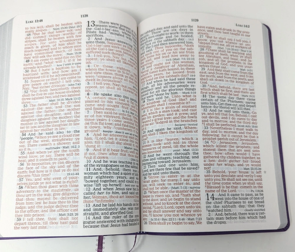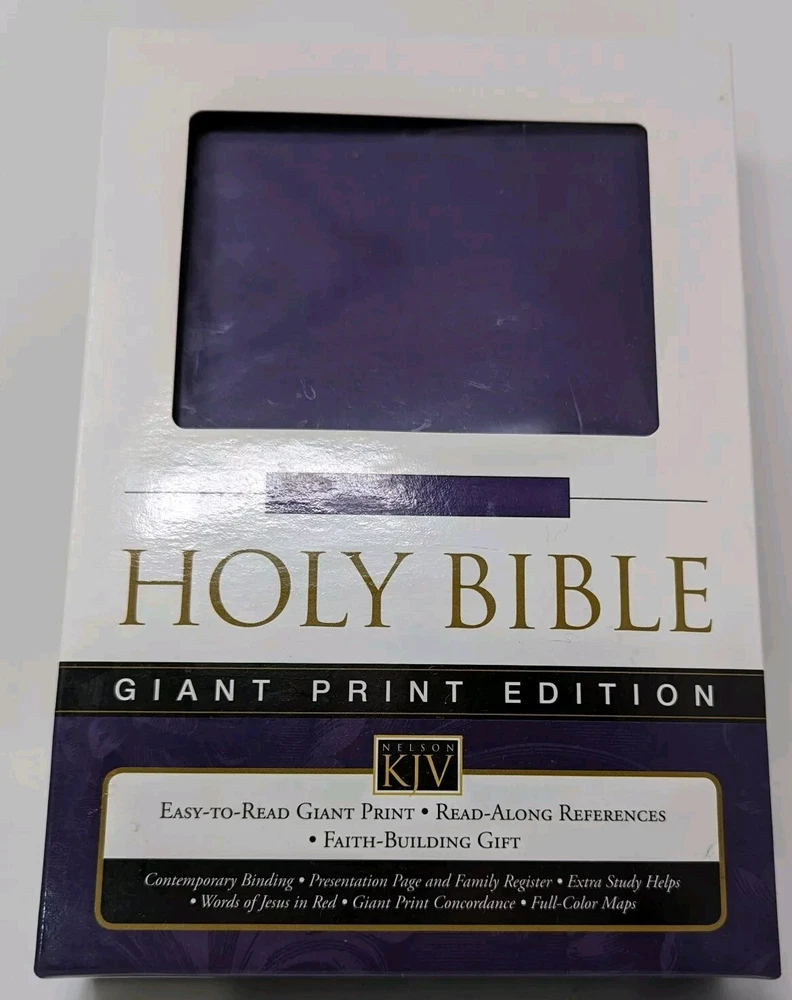 King James version giant print Bible with beautiful deep purple cover that has black scrolling. This Bible appears to be brand new with the exception of the dedication page, which is completed. Otherwise it seems this Bible has not even been opened. Please see photos. Choose your Shipping Thanks for looking! If you have any questions or concerns, please contact me before purchasing / bidding. I sincerely want you to be 100% pleased with your purchase & will do everything possible to make your experience simply perfect. Have a look at my other Holiday, vintage, unusual & collectible listings; I'm always finding interesting things! I do what I can to re-use / recycle packing material and will package your treasure with the utmost care.