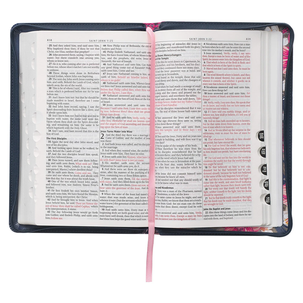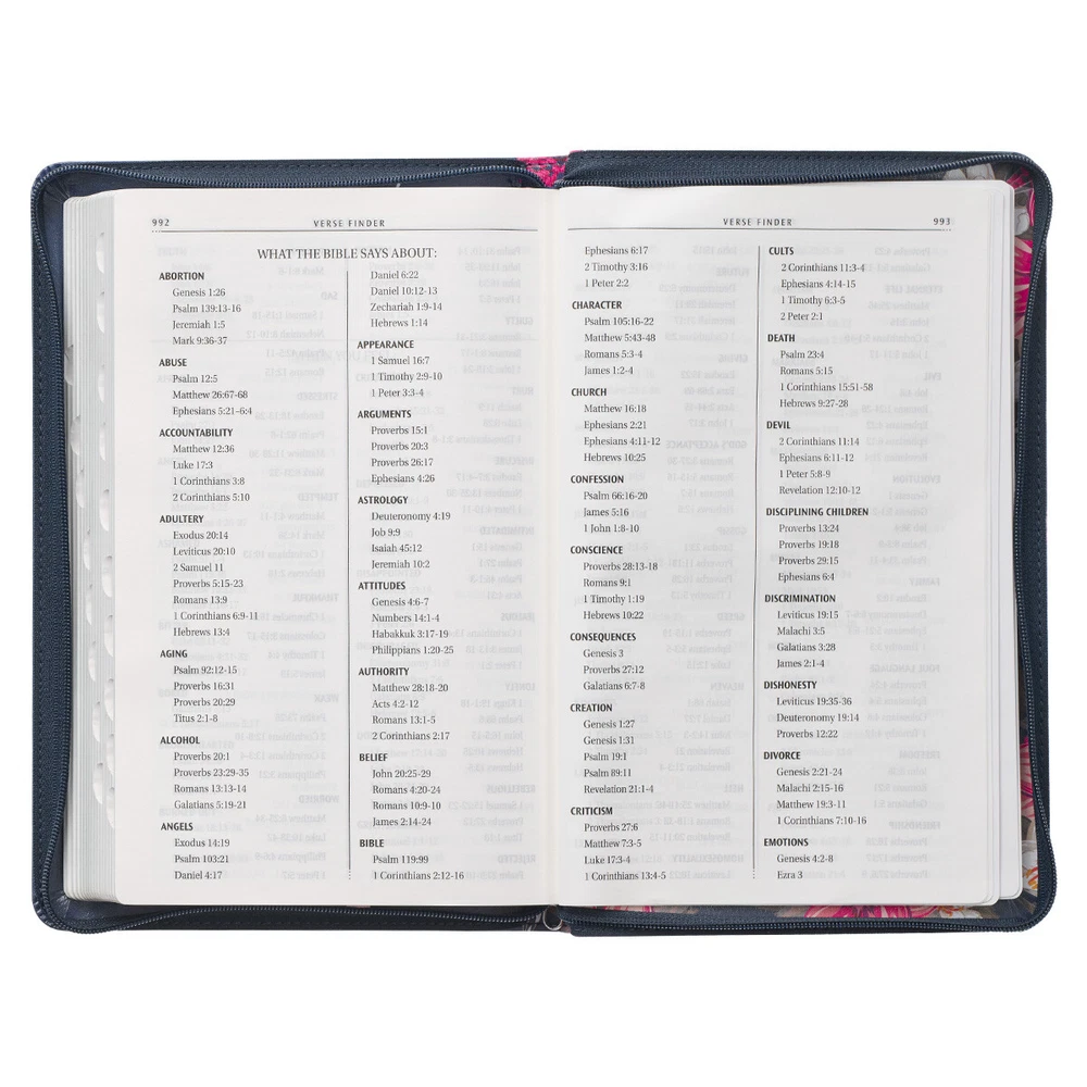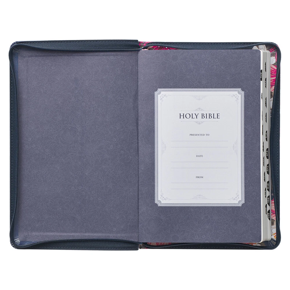 With its eye-catching design and luxury features, the Floral Blue Faux Leather King James Version Deluxe Gift Bible with Thumb Index and Zippered Closure will undoubtedly bring joy to your personal Bible study time. Visit Storefront Contact Us View Feedback About Our Company KJV Holy Bible Standard Size Faux Leather Red Letter Edition Thumb Index & Ribbon Marker, King James Version, Blue Floral, Zipper Closure Item Details With its eye-catching design and luxury features, the Floral Blue Faux Leather King James Version Deluxe Gift Bible with Thumb Index and Zippered Closure will undoubtedly bring joy to your personal Bible study time. With its eye-catching design and luxury features, the Floral Blue Faux Leather King James Version Deluxe Gift Bible with Thumb Index and Zippered Closure will undoubtedly bring joy to your personal Bible study time. On the back cover of the Bible, large pink flowers accompanied by white blossoms and green foliage are set against a midnight blue faux leather background. The flowing floral design spills over the spine and onto the front cover, meeting the silver-foiled title. The same title is written in simple silver-foiled letters on the spine. HOLY BIBLE KJV Study features of this Bible include a helpful verse finder, reader-friendly subheadings, 8 full-color maps, a one-year reading plan, and the words of Christ in red ink. Luxury construction features include the printed faux leather cover, zippered closure, gilt-edged pages, thumb indexing, and a satin ribbon page marker. The text is presented in 9-point font and organized in double columns. The Bible comes packaged in a full-color printed cardboard sleeve. The beautiful poetic language of the 1769 KJV Bible is used in this edition. The KJV text has stood the test of time and is still considered one of the most accurate translations 400 years after it was first printed. You will see this rich heritage reflected in the spelling and grammatical structure and note that it deviates from modern usage. Complete the presentation page and congratulate a family member or friend with a sweet message when you give the beautifully designed Floral Blue Faux Leather King James Version Deluxe Gift Bible with Thumb Index as a baptism or confirmation gift for your niece, daughter, or granddaughter. Blue faux leather cover with pink floral design Printed floral design Silver-foiled title Classic King James Version text Deluxe Gift Bible Zippered closure Attached satin ribbon marker Gilt-edged pages Thumb index Flexcover Lay-flat spine Double-column format Reader-friendly subheadings Words of Christ in red ink Thematic Scripture verse finder One-year Bible reading plan 8 full-color maps Presentation page 1 016 pages Text size: 9-point type Packaged in full-color printed cardboard sleeve Size: 9.1" x 6" x 1.1" (231 x 152 x 28 mm) Return Policy To ensure complete satisfaction of our customers, we offer a 30 day return policy for all orders. Please reach out to us if you have any questions and one of our friendly customer service representatives will reply within 24 hours. This excludes weekends and holidays. Shipping Information All orders are fulfilled and shipped within 1-2 business days excluding holidays and will be shipped via standard economy shipping. Please do not hesitate to reach out with any questions. Please Note: Our hours of operation are Monday-Friday, 8am-5pm (CST). All orders received before 2pm (CST) will be processed & shipped within 1-2 business days.* Average transit times are 2-7 business days to the contiguous 48 United States and the District of Columbia. (*Does not apply to holidays or special orders.) Shop Our Storefront | View Feedback | Contact Us | Add Us to Your Favorites