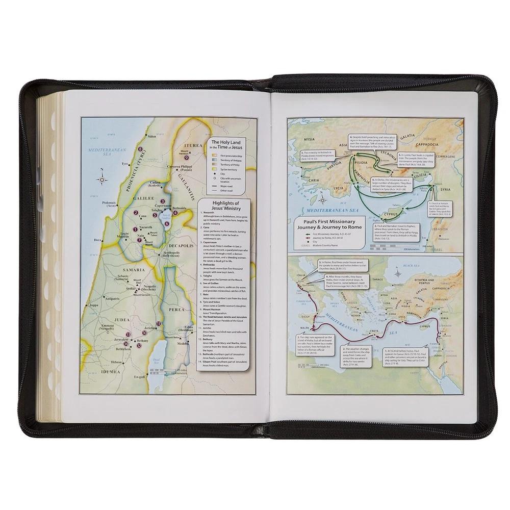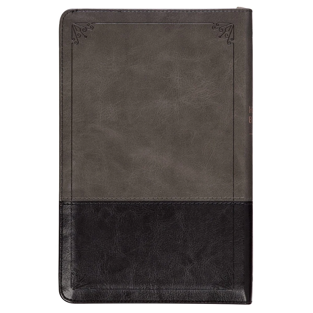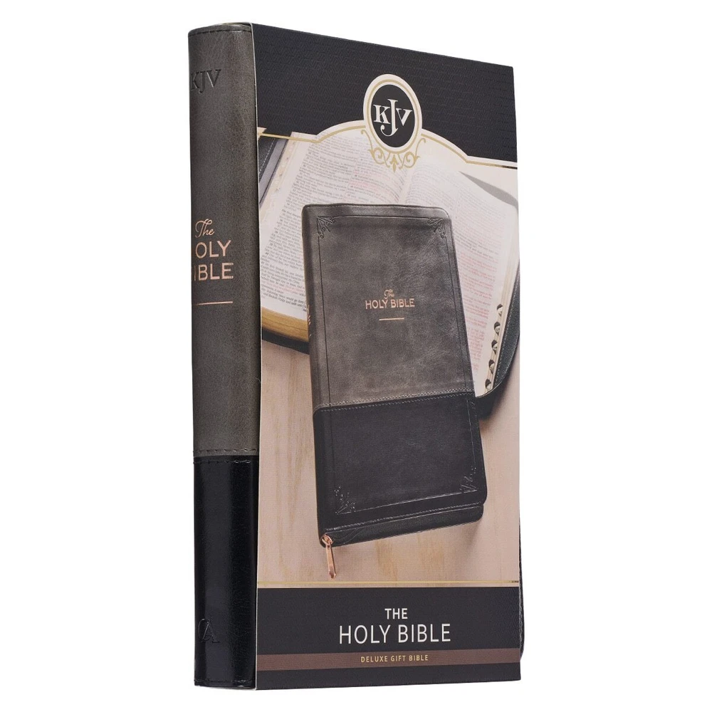 A simple but sophisticated gift, the Gray and Black Faux Leather King James Version Deluxe Gift Bible with Thumb Index and Zippered Closure will help you mark a special milestone in a loved one's faith journey. Visit Storefront Contact Us View Feedback About Our Company KJV Holy Bible Standard Size Faux Leather Red Letter Edition Thumb Index & Ribbon Marker, King James Version, Gray/Black, Zipper Closure Item Details A simple but sophisticated gift, the Gray and Black Faux Leather King James Version Deluxe Gift Bible with Thumb Index and Zippered Closure will help you mark a special milestone in a loved one's faith journey. A simple but sophisticated gift, the Gray and Black Faux Leather King James Version Deluxe Gift Bible with Thumb Index and Zippered Closure will help you mark a special milestone in a loved one's faith journey. A black faux leather panel makes up the bottom third of the Bible's cover and is joined to a gray panel covering the top two-thirds with a double row of topstitching. Four corner scroll details anchor a thin heat-debossed frame that spans the front cover. The title is printed in a simple gold-foiled font underlined in gold foil. The title is styled the same way on the front and spine, and the version reference is heat-debossed on the spine. THE HOLY BIBLE KJV You will find several additions to aid your Bible reading in this Bible: a one-year reading plan, the words of Christ in red ink, reader-friendly subheadings, 8 full-color maps, and a thematic Scripture verse finder. The standard 9-point text is printed in a double-column format. The satin ribbon marker lets you mark your place between the gilt-edged pages, and the lay-flat spine allows the Bible to open completely flat. Two luxury features include thumb indexing to locate any book of the Bible and a zippered closure to secure your loose notes and bookmarks. The Bible comes packaged in a full-color printed cardboard sleeve. The beautiful poetic language of the 1769 KJV Bible is used in this edition. The KJV text has stood the test of time and is still considered one of the most accurate translations 400 years after it was first printed. You will see this rich heritage reflected in the spelling and grammatical structure and note that it deviates from modern usage. Include a thoughtful note on the presentation page in front of this Bible to add a personal touch to your gift. The Gray and Black Faux Leather King James Version Deluxe Gift Bible with Thumb Index and Zippered Closure is the perfect present for a graduating student headed off to college or celebrating a grandchild starting his first job Gray and black faux leather blocked design Heat-debossed frame Gold-foiled title Classic King James Version text Deluxe Gift Bible Zippered closure Attached satin ribbon marker Gilt-edged pages Thumb index Flexcover Lay-flat spine Double-column format Reader-friendly subheadings Words of Christ in red ink Thematic Scripture verse finder One-year Bible reading plan 8 full-color maps Presentation page 1016 pages Text size: 9-point type Packaged in full-color printed cardboard sleeve Size: 9.1" x 6" x 1.1" (231 x 152 x 28 mm) Return Policy To ensure complete satisfaction of our customers, we offer a 30 day return policy for all orders. Please reach out to us if you have any questions and one of our friendly customer service representatives will reply within 24 hours. This excludes weekends and holidays. Shipping Information All orders are fulfilled and shipped within 1-2 business days excluding holidays and will be shipped via standard economy shipping. Please do not hesitate to reach out with any questions. Please Note: Our hours of operation are Monday-Friday, 8am-5pm (CST). All orders received before 2pm (CST) will be processed & shipped within 1-2 business days.* Average transit times are 2-7 business days to the contiguous 48 United States and the District of Columbia. (*Does not apply to holidays or special orders.) Shop Our Storefront | View Feedback | Contact Us | Add Us to Your Favorites