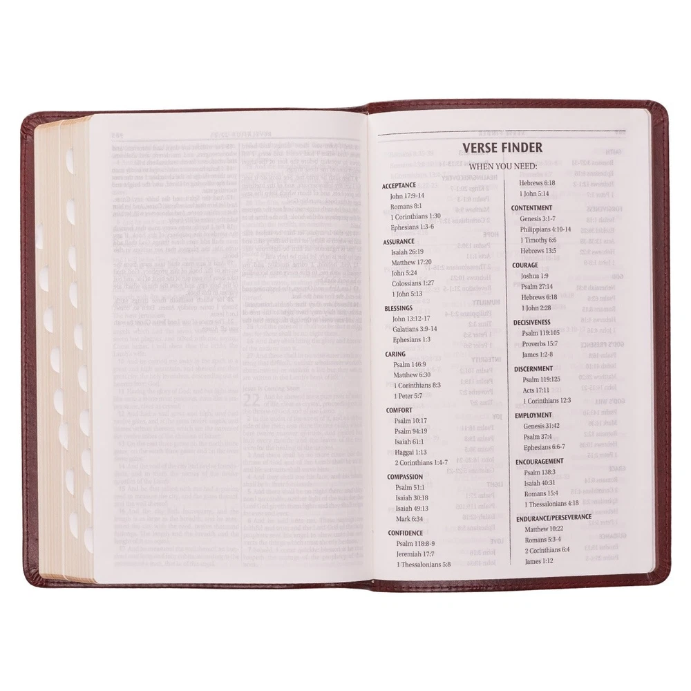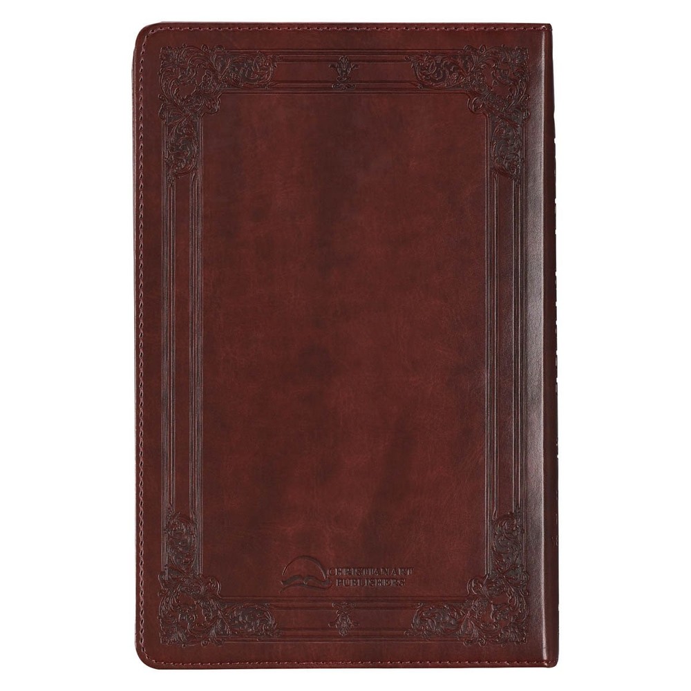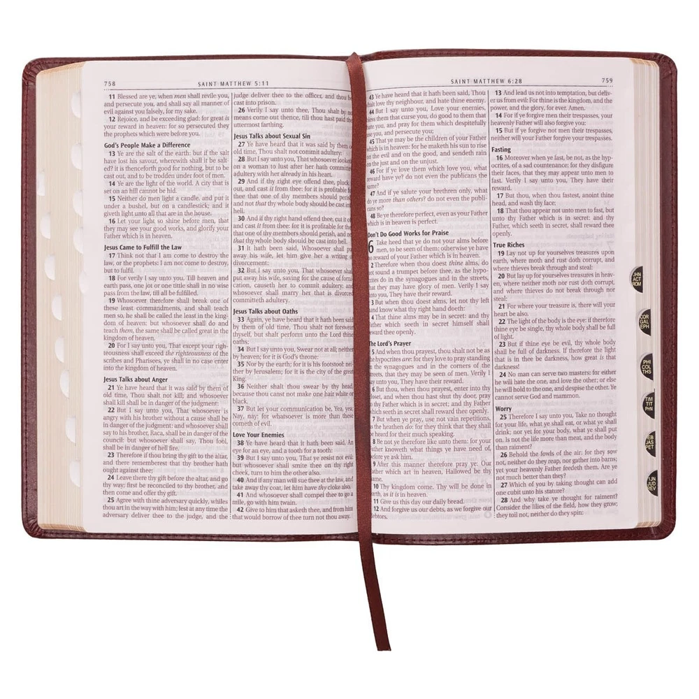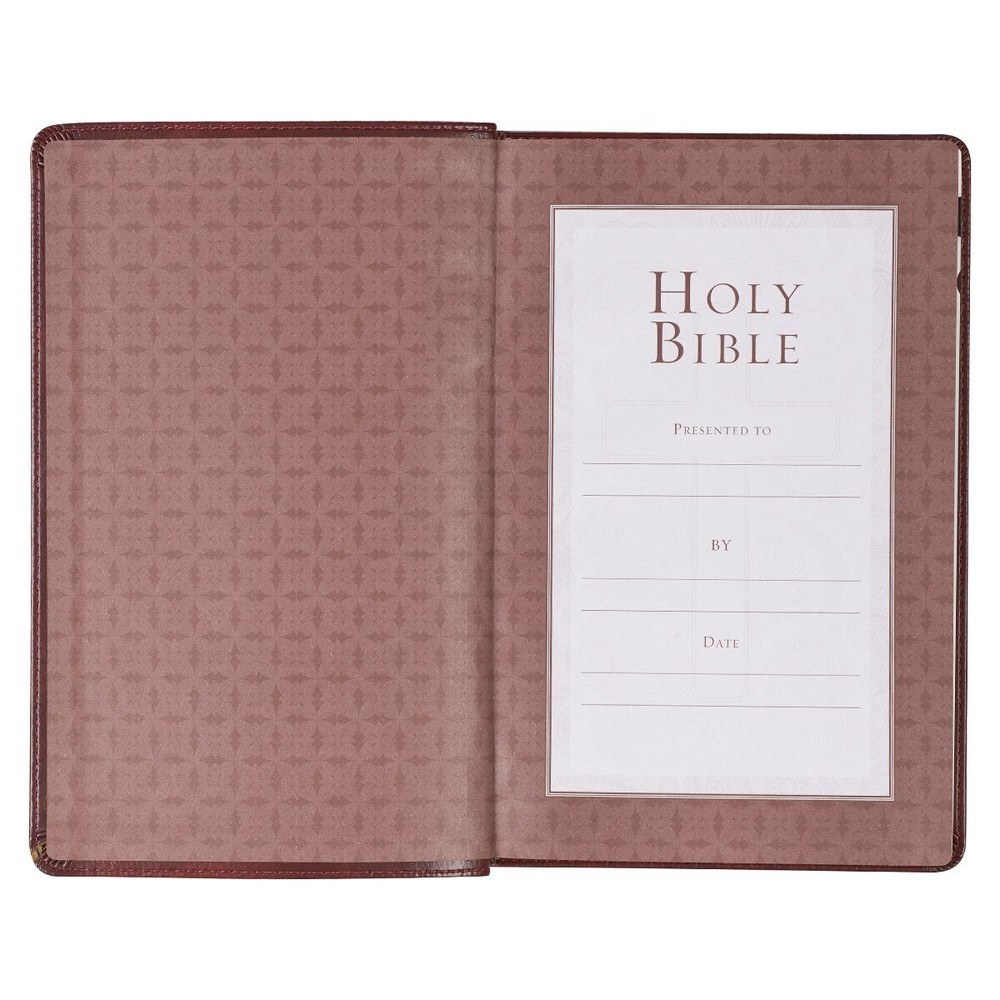 The stunning cover of the Saddle Tan Faux Leather Deluxe King James Version Gift Bible with Thumb Index with its classic design matches the classic King James Version text of the Bible. Visit Storefront Contact Us View Feedback About Our Company KJV Holy Bible, Standard Size Faux Leather Red Letter Edition Thumb Index & Ribbon Marker, King James Version, Saddle Tan Item Details The stunning cover of the Saddle Tan Faux Leather Deluxe King James Version Gift Bible with Thumb Index with its classic design matches the classic King James Version text of the Bible. The stunning cover of the Saddle Tan Faux Leather Deluxe King James Version Gift Bible with Thumb Index with its classic design matches the classic King James Version text of the Bible beautifully. An ornate filigree border design frames the gold-foiled title and version reference on the smooth front cover. The spine features a heat-debossed title and version imprint. HOLY BIBLE KING JAMES VERSION Rich gold gilt-edged pages and an attached satin ribbon page marker add elegance to an already exquisite design. The standard 9 pt. type in a double-column format, thumb-index, reader-friendly subheadings, thematic Scripture verse finder, 8 full-color maps, and the words of Christ printed in red will assist you in Bible study. A one-year Bible reading plan is included to keep you on track. A presentation page is included to complete with a special encouraging message. The Bible comes packaged in a full-color printed cardboard sleeve. The beautiful poetic language of the 1769 KJV Bible is used in this edition. The KJV text has stood the test of time and is still considered one of the most accurate translations 400 years after it was first printed. You will see this rich heritage reflected in the spelling and grammatical structure and note that it deviates from modern usage. The Saddle Tan Faux Leather Deluxe King James Version Gift Bible with Thumb Index comes packaged in a gift box. This beautiful Classic King James Version Bible makes a thoughtful gift for a special birthday or a life event like a graduation or engagement. Saddle tan faux leather cover Heat-debossed ornate frame cover design Gold-foiled title Classic King James Version text Deluxe Gift Bible Attached satin ribbon marker Gilt-edged pages Thumb indexing Flexcover Lay-flat spine Double-column format Reader-friendly subheadings Words of Christ in red ink Thematic Scripture verse finder One-year Bible reading plan 8 full-color maps Presentation page 1016 pages Text size: 9-point type Packaged in full-color printed cardboard sleeve Size: 8.7" x 5.7" x 1.1" (221 x 145 x 28 mm) Return Policy To ensure complete satisfaction of our customers, we offer a 30 day return policy for all orders. Please reach out to us if you have any questions and one of our friendly customer service representatives will reply within 24 hours. This excludes weekends and holidays. Shipping Information All orders are fulfilled and shipped within 1-2 business days excluding holidays and will be shipped via standard economy shipping. Please do not hesitate to reach out with any questions. Please Note: Our hours of operation are Monday-Friday, 8am-5pm (CST). All orders received before 2pm (CST) will be processed & shipped within 1-2 business days.* Average transit times are 2-7 business days to the contiguous 48 United States and the District of Columbia. (*Does not apply to holidays or special orders.) Shop Our Storefront | View Feedback | Contact Us | Add Us to Your Favorites