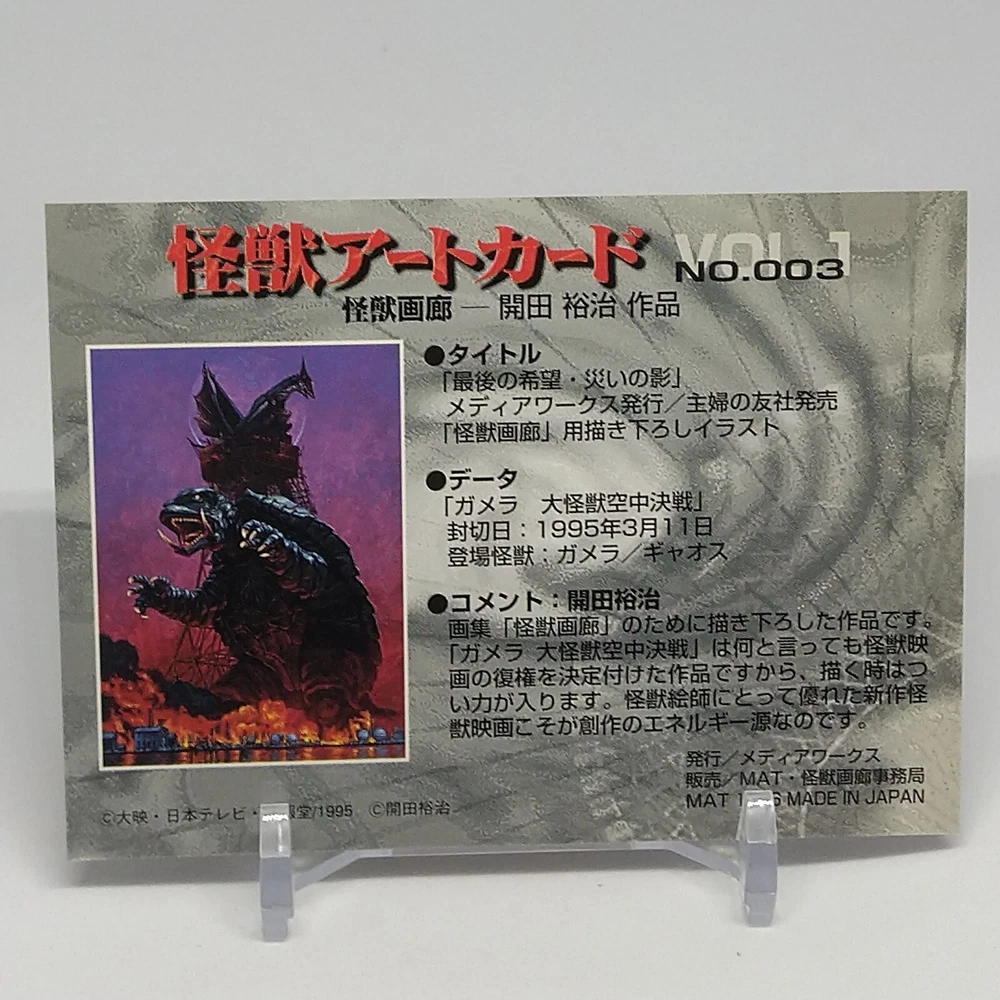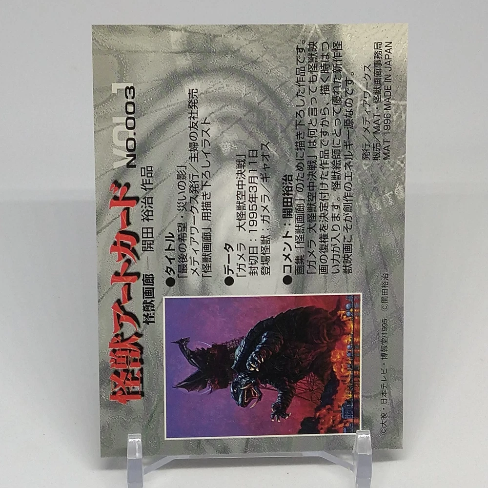 Kaiju Gallery Gamera Gyaos Kaiju Art Card Vol.1 No.3 Yuji Kaida 1996 Tokusatsu Description Please see the picture for the details of damages and dirt or ask us before your purchase. 100% Authentic or Money Back Guaranteed. (Do not worry you are protected by eBay and eBay Managed Payments) See the pictures for more details. If you have any question about the condition, accessories, or anything about the product, please feel free to message us. We are glad to answer all your concerns. Payment Same as ebay payment method. Shipping Economy shipping: Delivery time will be about 11 - 23 days. Standard shipping: Delivery time will be about 5 - 10 days. Expedited shipping: Delivery time will be about 1 - 4 days. Terms of Sale Money back guarantee within 30 days if returned by customer. We would not be able to accept your bid if you; 1) Don't have a PayPal account. 2) Have unpaid items reported. 3) Have a primary shipping address in countries you don't ship to. 4) Have reportedly violated eBay policies. 5) Have a Feedback score lower than the number you specify. International Buyers - Please Note: Import duties, taxes and charges are not included in the item price or shipping charges. These charges are the buyer's responsibility. Please check with your country's customs office to determine what these additional costs will be prior to bidding/buying. These charges are normally collected by the delivering freight (shipping) company or when you pick the item up - do not confuse them for additional shipping charges.