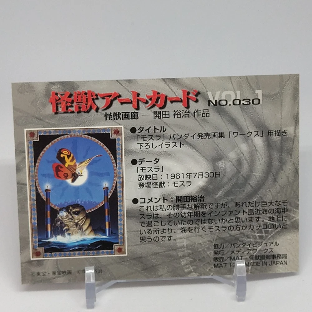 Kaiju Gallery Mothra Kaiju Art Card Vol.1 No.30 Yuji Kaida 1996 Tokusatsu Description Please see the picture for the details of damages and dirt or ask us before your purchase. 100% Authentic or Money Back Guaranteed. (Do not worry you are protected by eBay and eBay Managed Payments) See the pictures for more details. If you have any question about the condition, accessories, or anything about the product, please feel free to message us. We are glad to answer all your concerns. Payment Same as ebay payment method. Shipping Economy shipping: Delivery time will be about 11 - 23 days. Standard shipping: Delivery time will be about 5 - 10 days. Expedited shipping: Delivery time will be about 1 - 4 days. Terms of Sale Money back guarantee within 30 days if returned by customer. We would not be able to accept your bid if you; 1) Don't have a PayPal account. 2) Have unpaid items reported. 3) Have a primary shipping address in countries you don't ship to. 4) Have reportedly violated eBay policies. 5) Have a Feedback score lower than the number you specify. International Buyers - Please Note: Import duties, taxes and charges are not included in the item price or shipping charges. These charges are the buyer's responsibility. Please check with your country's customs office to determine what these additional costs will be prior to bidding/buying. These charges are normally collected by the delivering freight (shipping) company or when you pick the item up - do not confuse them for additional shipping charges.