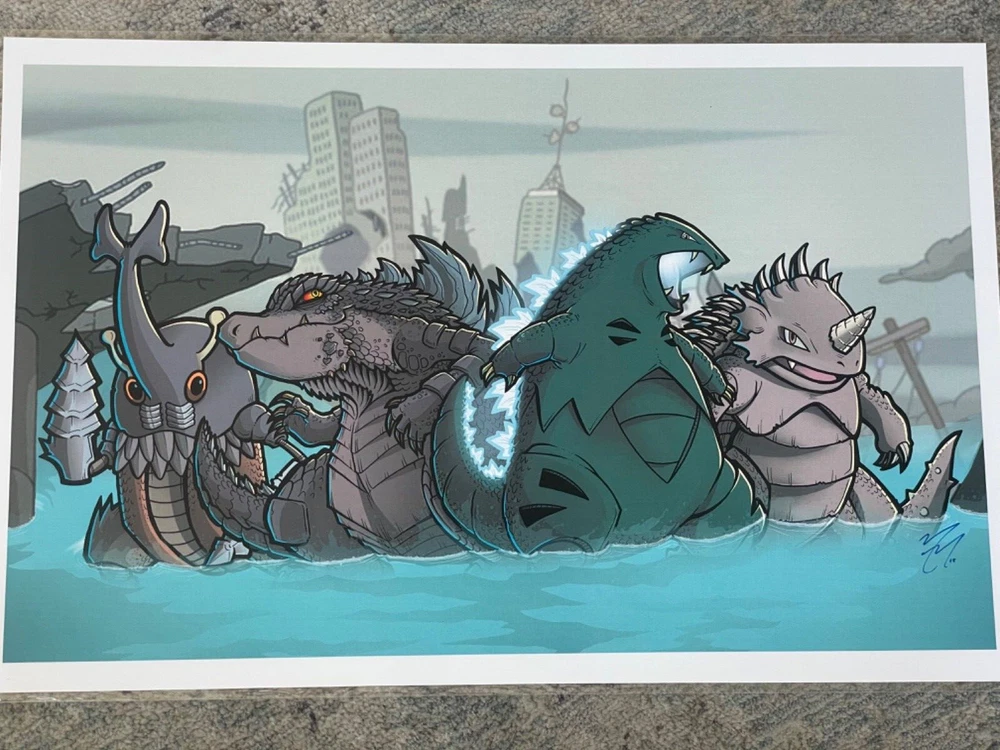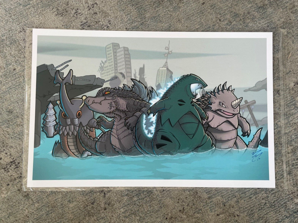 The "Kaiju Mon Art Print" by Mike Vasquez (2015) is a striking and imaginative piece, signed by the artist. This print showcases a creative fusion of kaiju monsters and pop culture elements, rendered in Vasquez's distinctive, dynamic style. The artwork features detailed and colorful illustrations of colossal creatures, capturing both their might and whimsical charm. The signed edition adds a special touch of authenticity, making it a prized addition for art collectors and fans of kaiju lore. This print is a testament to Vasquez's talent for blending fantasy and nostalgia, creating a captivating visual experience. This art print is in EXCELLENT condition and was SIGNED by Mike Vasquez in 2015! PRICE IS FIRM!!! Please contact me if you have any questions.