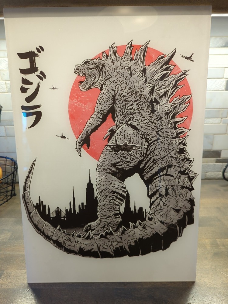 King Under the Sun Plexi Glass Wall Art Designed by Artist: Denis Orio Ibanez Great Godzilla art! Love it! All pieces are 18"x12" and a couple of millimeters thick. Material: PMMA Multi-Layered Acrylic Plexi Glass. Shatterproof and Backlightable!