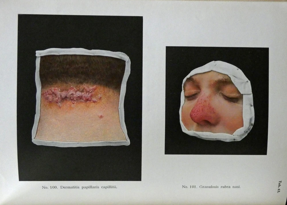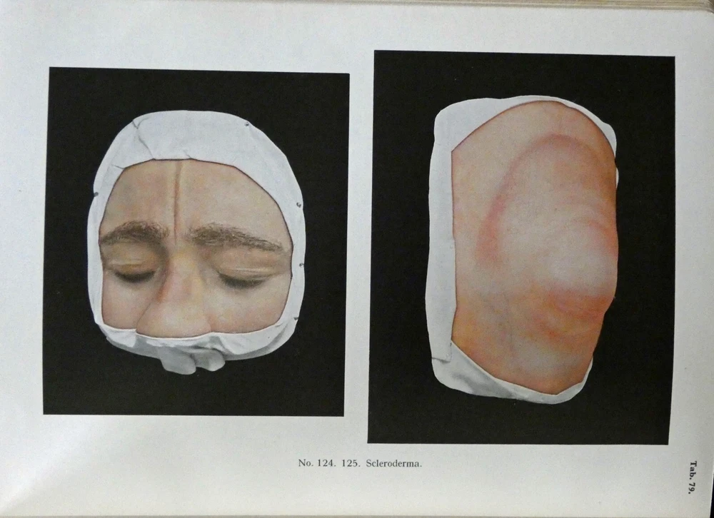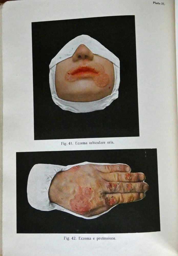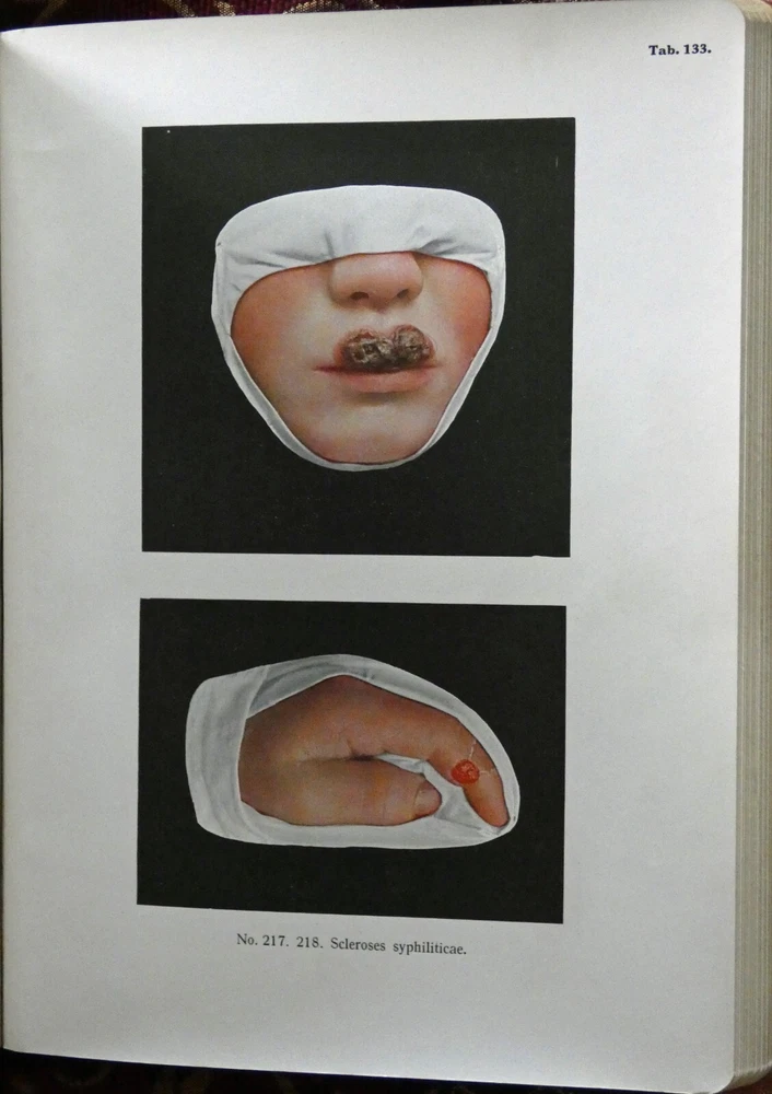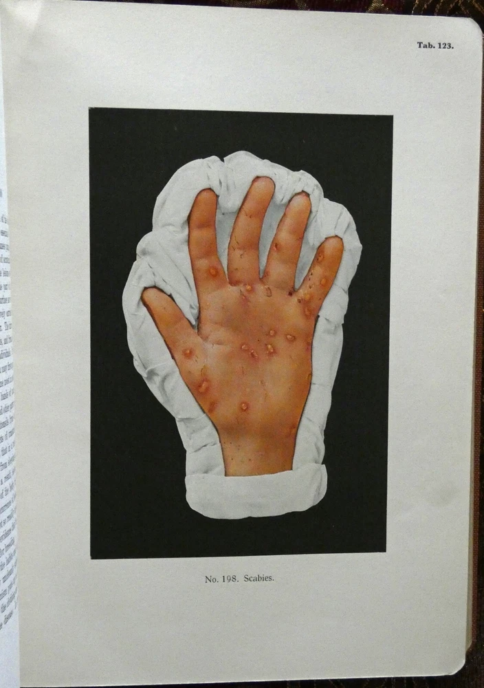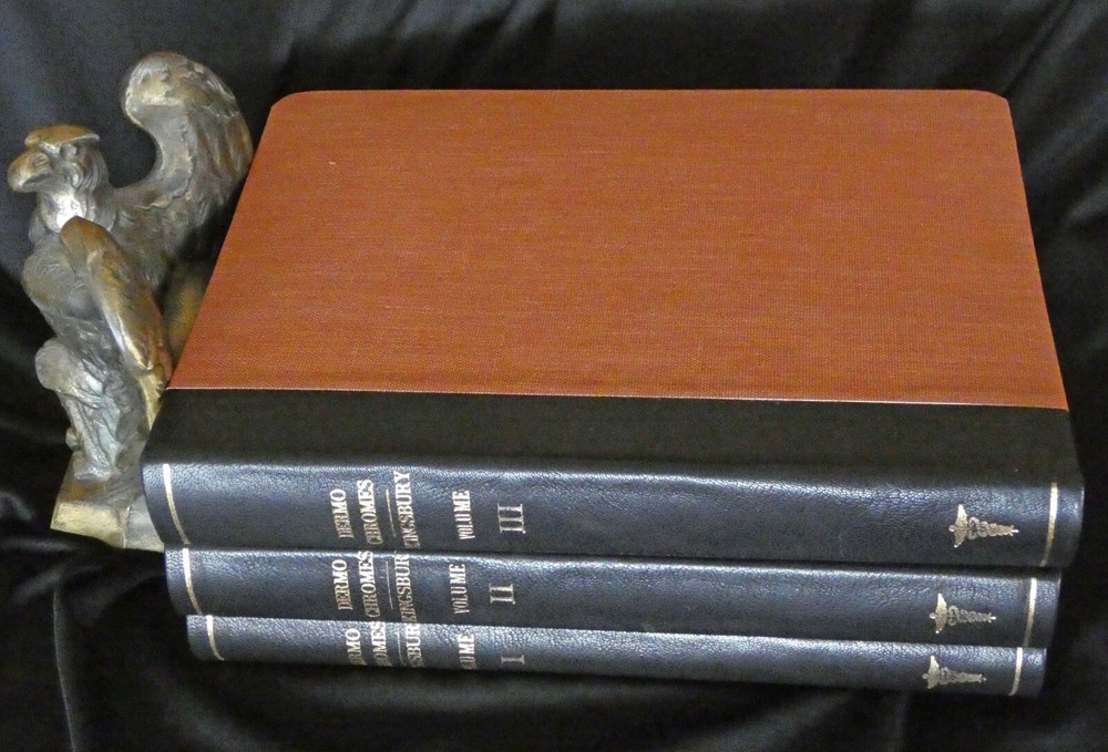 Portfolio of Dermochromes, Kingsbury, 6th edition 1921, in 3 volumes. Large 4to with all edges gilt. Rebound in brown goatskin with cloth boards. 266 plates in stunning lifelike color, 6 black and white plates. These illustrations were produced by Eduard Jacobi of Freiburg and published in 1904 with the revolutionary new "citochrome" process, allowing color quality never before possible. More plates were added in later editions like this one. These were widely distributed, and are still commonly available. However, the original leather bindings were not archival and are now usually found in very shabby condition. If you've wanted a handsome and sturdy copy of these illustrations, which are, in spite of the subjects, actually very beautiful, here is your chance.
