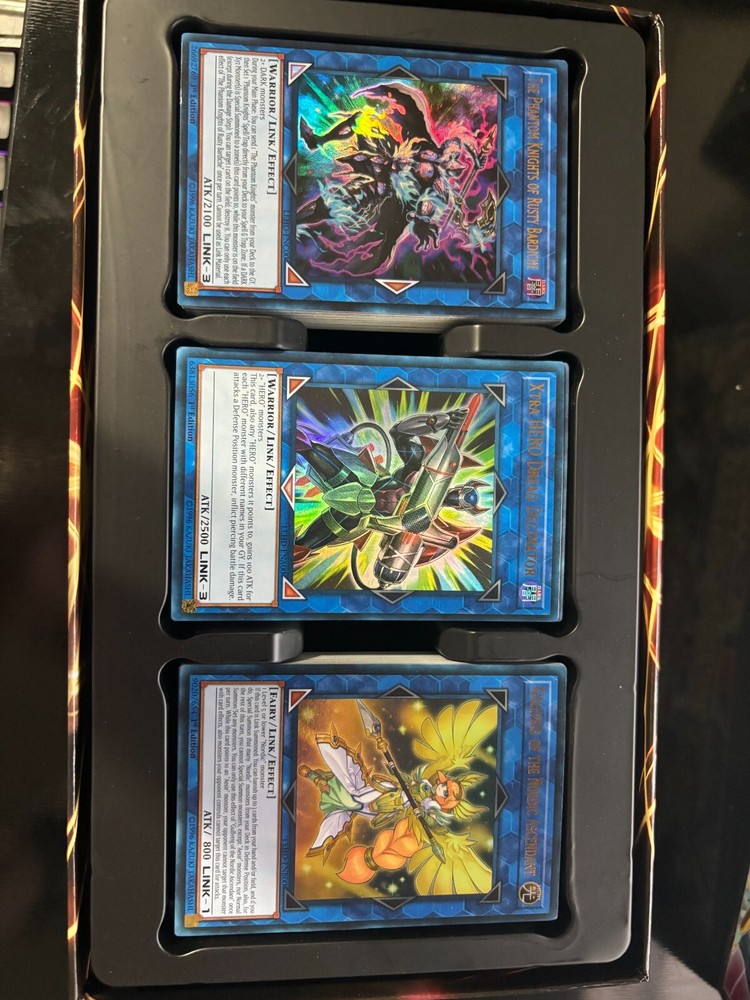 This Yu-Gi-Oh! box set contains 3 different sets of decks: Aster Phoenix's "Destiny HERO", Team Ragnarok's "Aesir", and Yuto's "Phantom Knights." The box and the decks have been opened, however all of the cards in each deck are in perfect condition and never used. There are zero wears on any of the cards and the box is in new condition. This is a great addition to any Yu-Gi-Oh! collection!