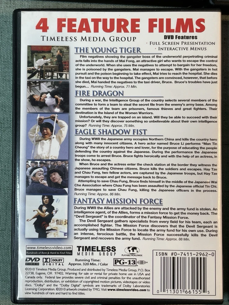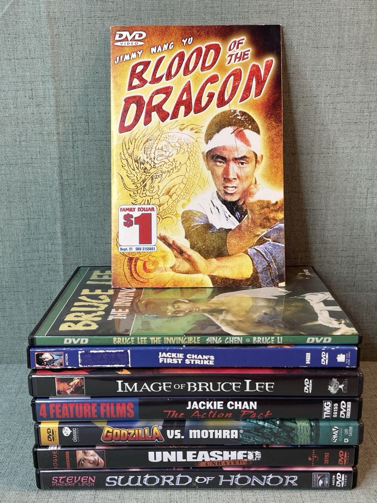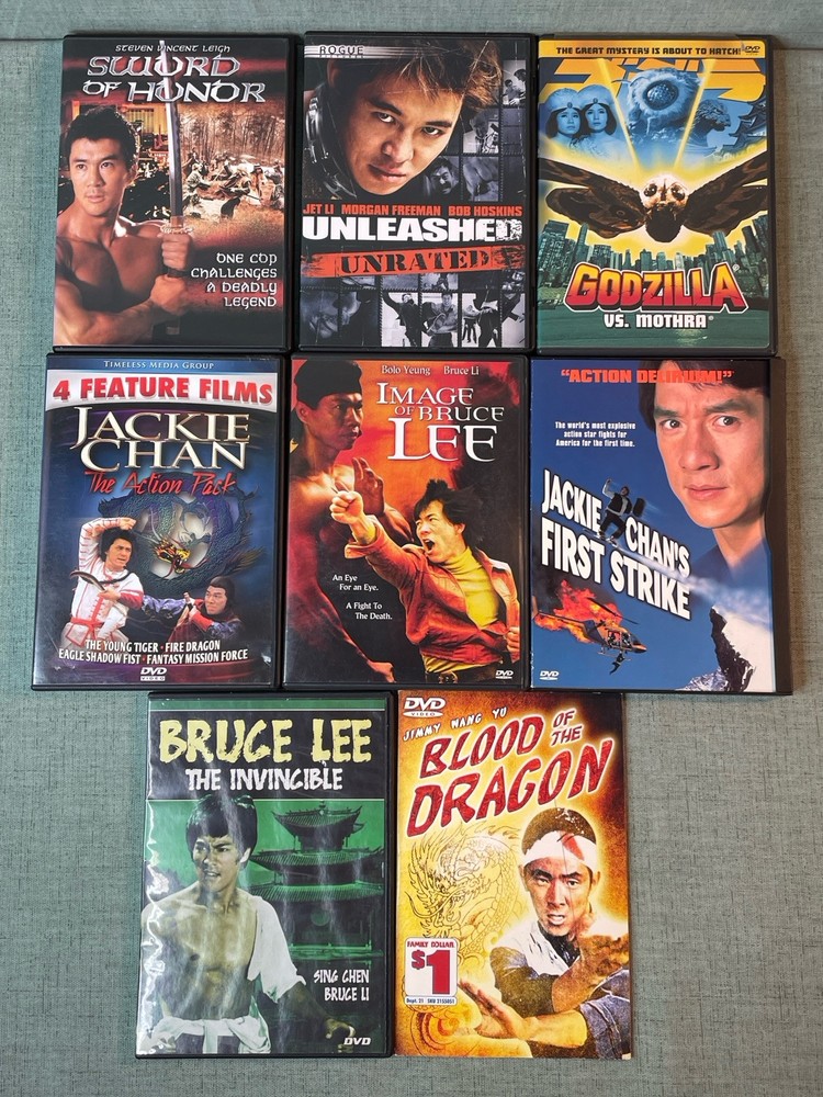 Kung Fu & Martial Arts Action Lot of 8 - Bruce Lee Jackie Chan & Godzilla Pre-Owned, all movies are in English or dubbed in English....