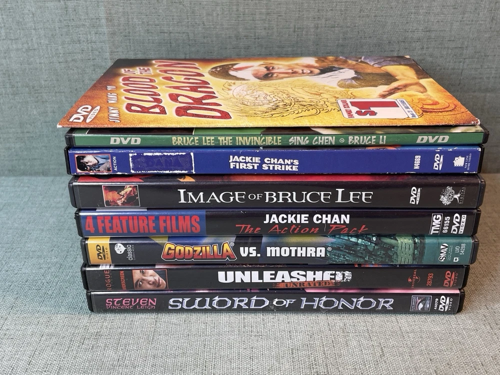 Kung Fu & Martial Arts Action Lot of 8 - Bruce Lee Jackie Chan & Godzilla Pre-Owned, all movies are in English or dubbed in English.