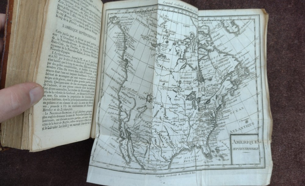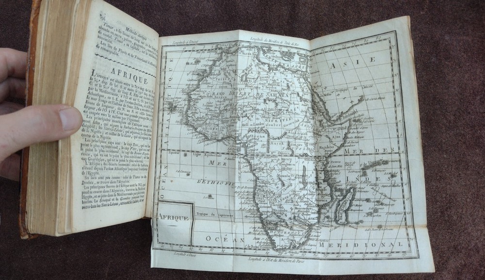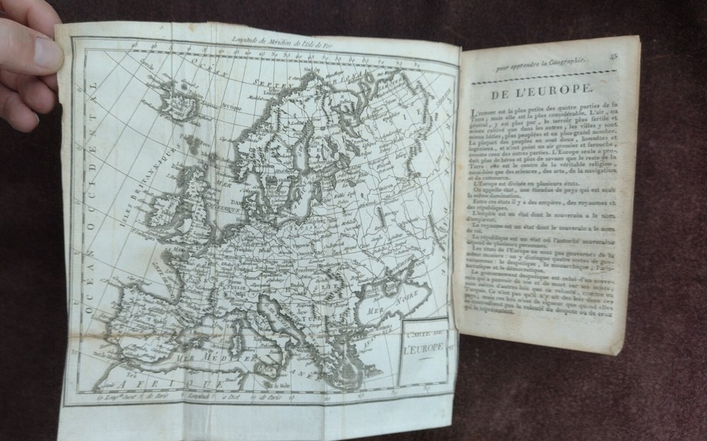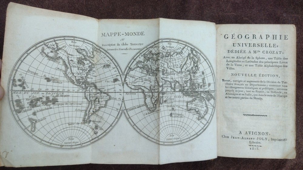 [LE FRANCOIS (Abbé A.)] Géographie universelle, dédiée à Mlle Crozat, avec un abrégé de la sphere, une table des longitudes et latitudes des principaux lieux de la terre, et une table alphabétique des villes. Avignon, Jean-Albert Joly, 1813, 11 X 18 cm., relié, 464 pp. New edition, revised, corrected and expanded with the division of the French territory into departments; containing all the historical and political changes that have occurred to date, both in France, Holland, Germany and Italy, as well as in the rest of Europe and other parts of the world. Contains six pretty fold-out maps