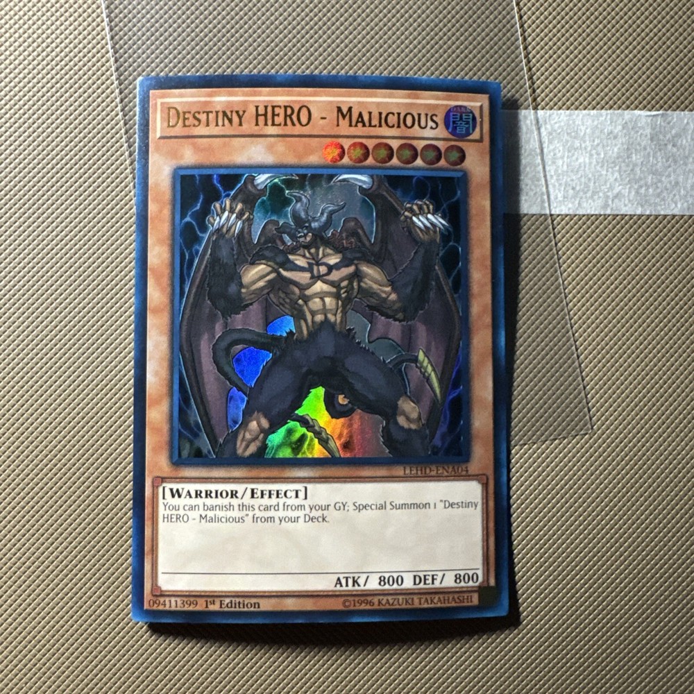 LEHD-ENA04 Destiny Hero - Malicious Ultra Rare 1st Edition NM Yugioh Card is a highly sought-after collectible card from the Yu-Gi-Oh! TCG game. This Rare card features the iconic Destiny HERO character and is a must-have for any avid collector or player. With its Ultra Rare design and 1st Edition status, this card is sure to stand out in any card collection. Add this impressive card to your deck or display it proudly alongside your other Yu-Gi-Oh! cards.