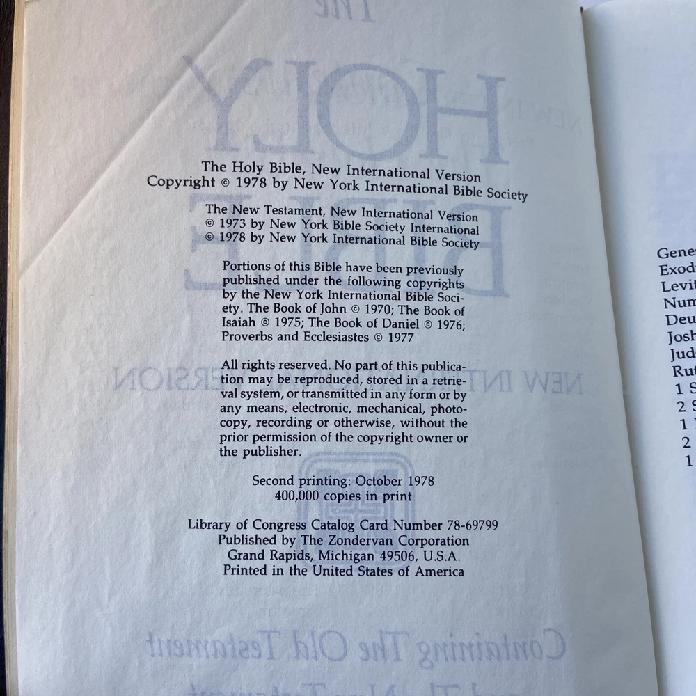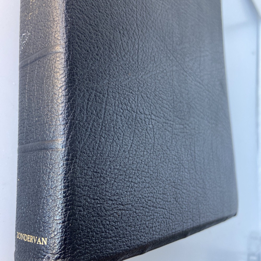 This is a Leather Bible Book of the New International Version by Zondervan, printed in 1978. It features top grain cowhide binding, English language text, includes maps at the back, and contains both the Old and New Testament. The book is an original printing and is categorized under Religion & Spirituality.