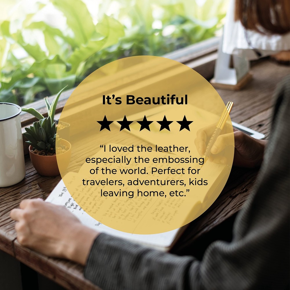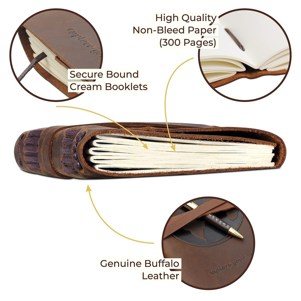 Leather Bound Journal for Men and Women, Handmade Gift Set with World Map Embossed Journal and Stylish Pen, Vintage and Classic, Notebook, Sketchbook, Planner and Diary (300 Pages) (8x6") ✓ Free 60 Day Returns ✓ Free Express Shipping Description: Features: UNIQUE GIFT SET: Handmade leather journal with beautiful World Map embossed front soft cover with matching bookmark, designer pen and hidden pen holder. Presented in an eco-friendly recycled box. A timeless gift for that special someone who loves to write. PREMIUM LEATHER: Crafted with delicate yet super tough buffalo leather, including a long strap that secures the journal firmly. Our genuine leather is thicker than competitors and offers lifetime durability with lasting softness. RUSTIC DESIGN: Achieves a unique and distressed look when scratched and features decorative stitching for added charm. Coated with special natural oils that make handling a joy. Plus, it has a wonderful authentic leather smell that inspires you to write daily. QUALITY CREAM PAPER: 300 premium unlined multipurpose sheets for notes, daily plans, sketches, inspiring ideas, memories and more. Zero bleed through with fountain pens. Not refillable. PERFECT SIZE: 8x6" made to suit a wide range of writing styles. We also offer many other sizes and styles of journals, including refillable journals. There's something for everyone! Product Details: Brand: Sovereign-Gear Color: Antique Brown Theme: Book Sheet Size: A5 Cover Material: Leather Style: Vintage Ruling Type: Plain Special Feature: Pen Holder Number of Items: 1 Recycled Content Percentage: 10 Manufacturer: Sovereign-Gear Brand: Sovereign-Gear Item Weight: 1.4 pounds Product Dimensions: 8.46 x 6.69 x 1.97 inches Item model number: SG-Map-Journal-8x6 Is Discontinued By Manufacturer: No Color: Antique Brown Cover Material: Leather Material Type: Leather Total Recycled Content Percentage: 10 Number of Items: 1 Ruling: Plain Sheet Size: A5 Manufacturer Part Number: SG-WMap-Journal-8x6 Date First Available: June 19, 2018