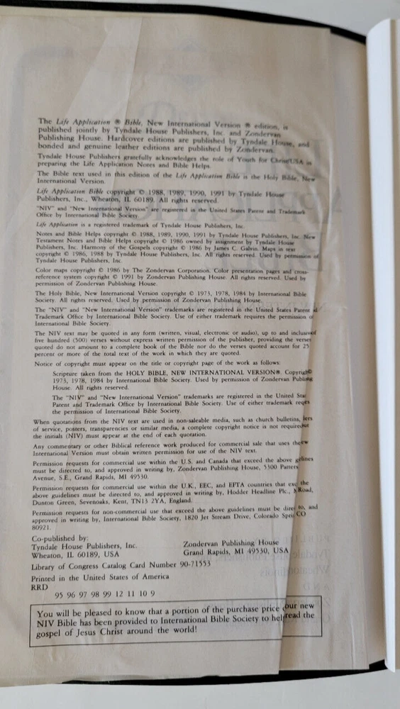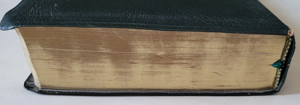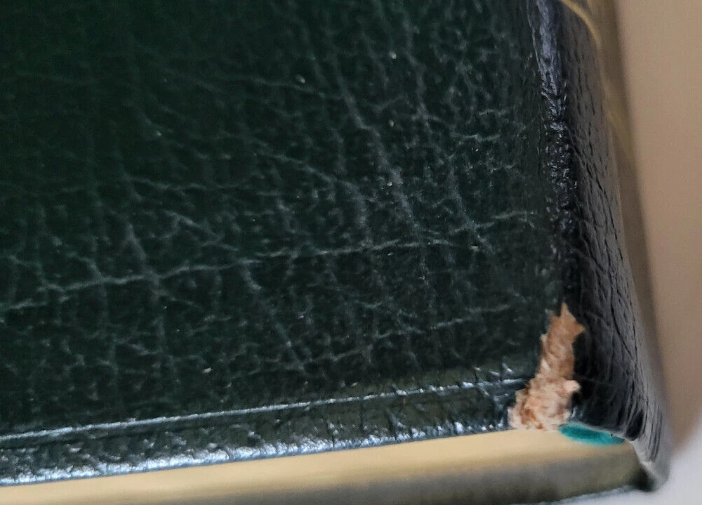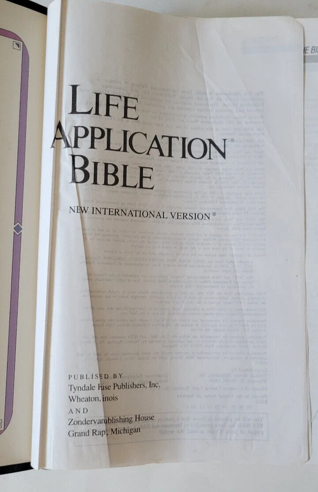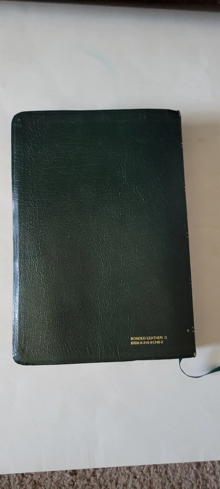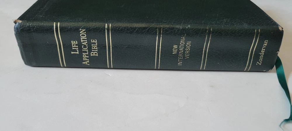 Life Application Study Bible Green Genuine Leather Zondervan Maps Index DAMAGED Cover is bonded leather Book is missing pages, also there is a a few pages in which there is typed paper glued to the book pages Cover has shelf wear