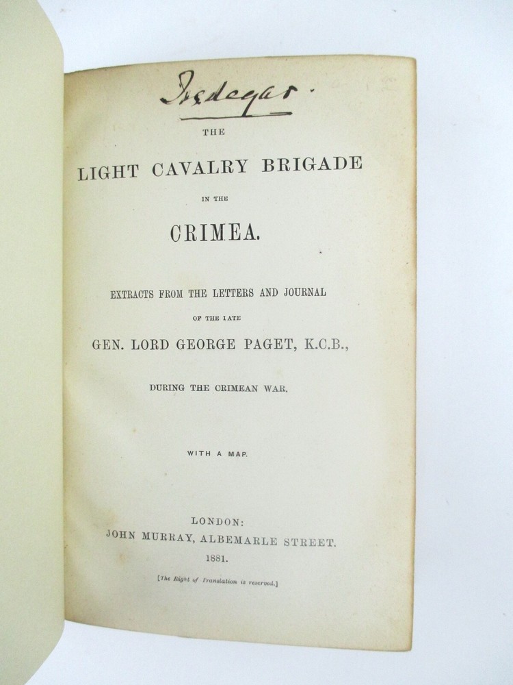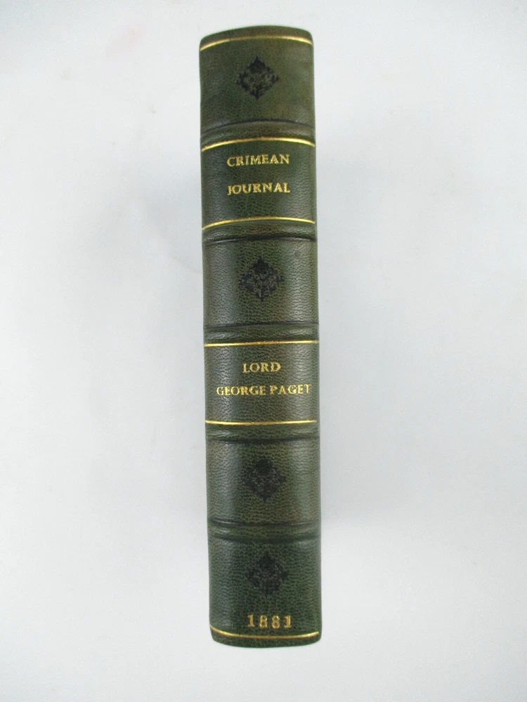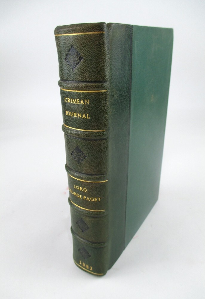 The Light Cavalry Brigade in the Crimea Extracts from the Letters and Journals of the Late Gen. Lord George Paget K.C.B., During the Crimean War. London: John Murray, 1881. 345 pages + ads. With fold-out map in rear. 1/4 green leather and green cloth binding. Spine is gold-titled "Crimean Journal" and "Lord George Paget" and "1881." Small "Atkinson Bookbinder Salisbury" label in rear. In very good, solid condition. Former owner name in ink on title page. Map has small tear. See photos.