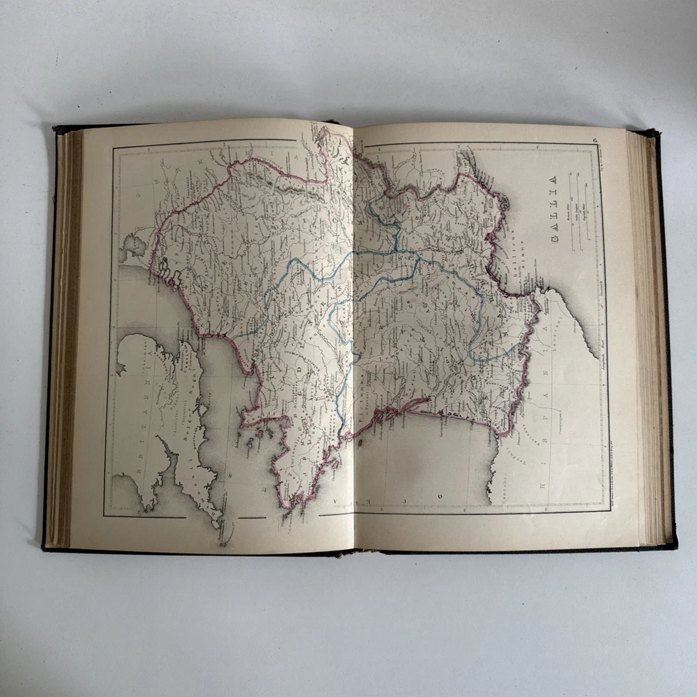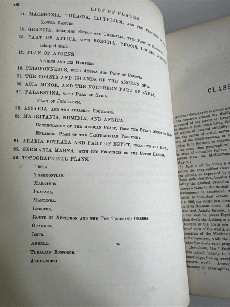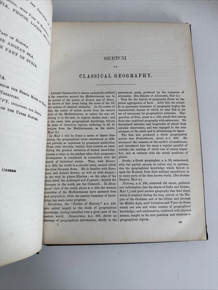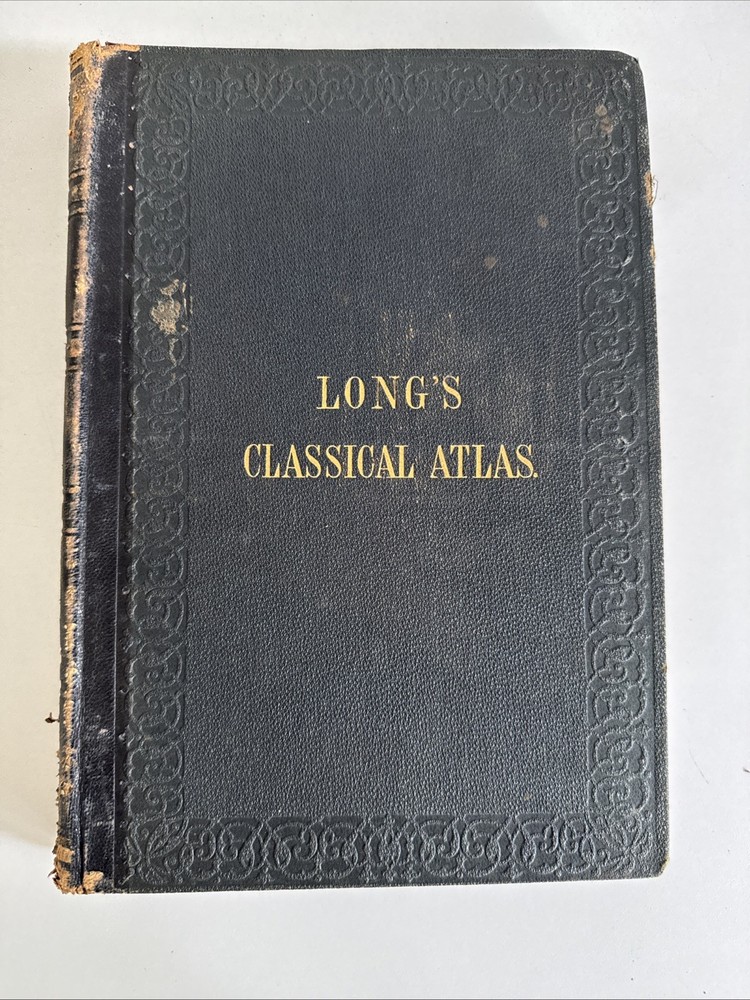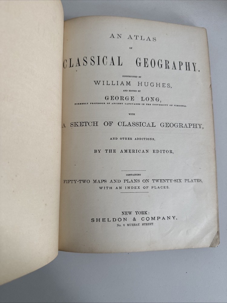 An Atlas of Classical Geography constructed by William Hughes, and Edited by George Long With a sketch of classical geography, and other additions, by the American editor Containing 52 maps and plans on 26 plates. Index in back. Published in 1856 by Sheldon & Company in New York. Hardcover. Leather spine. Condition: some wear to spine. Some general age and shelf wear to book. Name written inside. She tanning to pages, some dirt marks. Binding remains intact. Shipped for FREE!